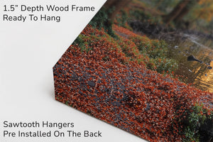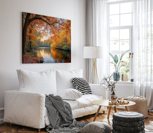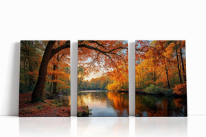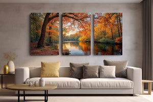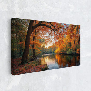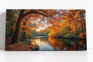 Transform your space with this breathtaking autumn landscape canvas print, capturing a vibrant forest ablaze with fall foliage. The scene features golden and crimson leaves reflecting in a peaceful river, framed by arching tree limbs and glowing sunset skies. Perfect for adding warmth and tranquility to your home decor, this gallery wrapped canvas print brings the vivid colors of the season to life. This wall art is ideal for nature lovers and makes a thoughtful housewarming gift or seasonal accent for living rooms, bedrooms, or offices. Whether you choose the dramatic 2:1 format, the classic 3:2 print, or the striking 3-panel canvas layout, each option is crafted with the highest quality materials and detail.