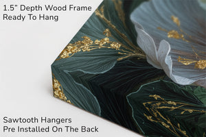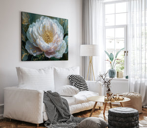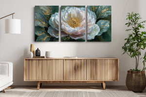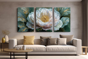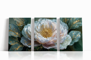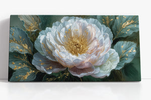 Add a touch of luxury and refinement to your space with this stunning floral canvas print. A radiant white peony unfurls at the center, surrounded by richly textured leaves and gilded golden accents. Every detail glows with elegance and serenity, making this wall art a perfect centerpiece for bedrooms, living areas, or upscale interiors. The gallery wrapped canvas print elevates any decor style, from modern to classic. Whether you’re decorating for beauty or gifting a floral masterpiece, this artwork offers a blend of grace and opulence — available in three striking formats.