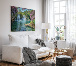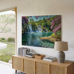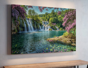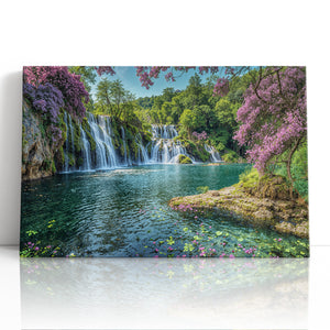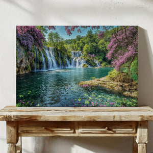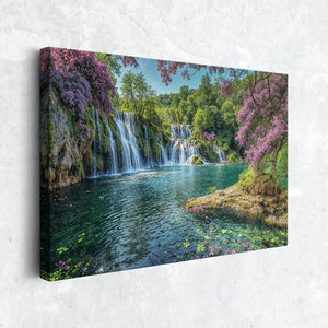 Transform your space with the serene beauty of this waterfall landscape canvas print. Featuring cascading waters surrounded by lush greenery and blooming pink flower trees, this vibrant art print captures the essence of a hidden paradise. The crystal-clear water and delicate blossoms create a peaceful, nature-inspired scene that radiates calm and rejuvenation. Perfect for bedrooms, living rooms, or any space needing a tranquil touch, this gallery wrapped canvas brings refreshing energy and color to your home decor. A standout piece for lovers of scenic nature wall art.