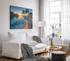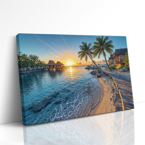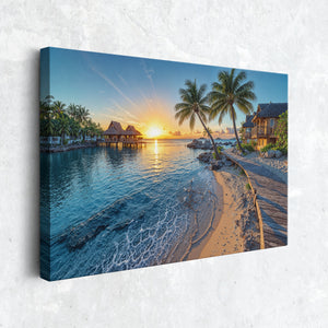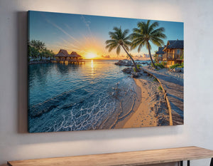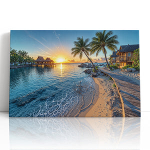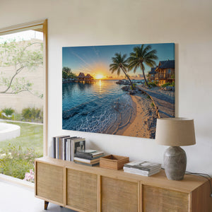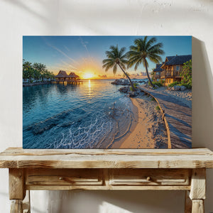 Let your imagination drift to a remote tropical haven with this breathtaking canvas print. The scene features a brilliant sunset over calm ocean waves, with palm-fringed bungalows and a winding boardwalk capturing the essence of coastal tranquility. This gallery wrapped canvas print brings warmth and serenity to any room. Whether you're creating a beach-themed living space or gifting a slice of paradise to a loved one, this tropical artwork adds the perfect coastal touch to your home decor.