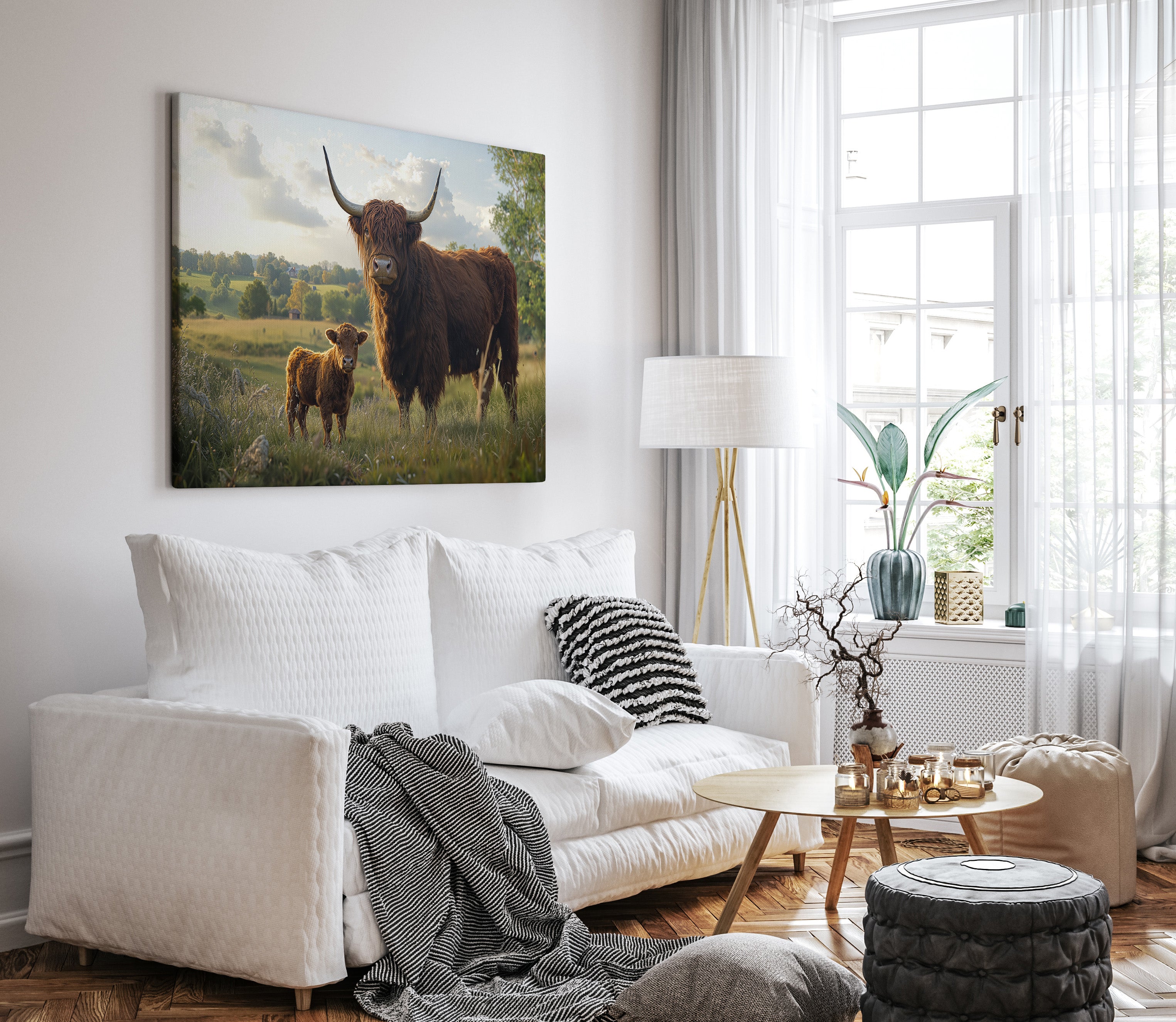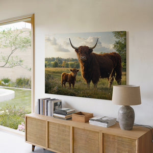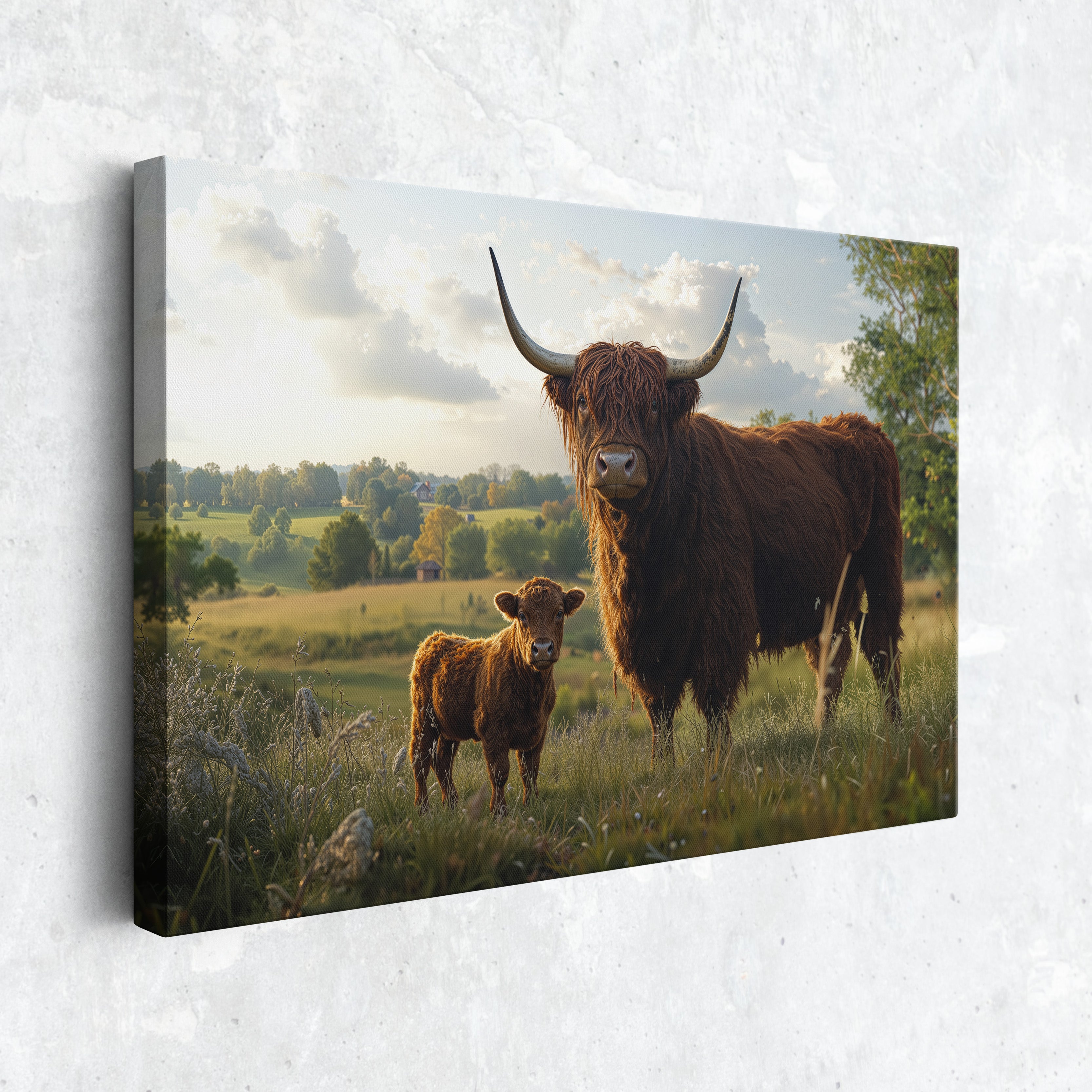 "Sunset Watchers of the Highland Field" captures a peaceful moment between a Highland cow and her calf in a golden country landscape. With soft evening light glowing through distant clouds and pastures rolling in the background, this image celebrates the bond between animal and earth. A beautiful piece for lovers of rustic charm, farm life, or nature-inspired home decor, this canvas print brings warmth and quiet strength to any room it graces. Ideal for living rooms, country kitchens, or farmhouse entryways.