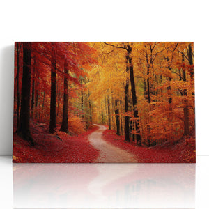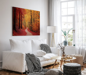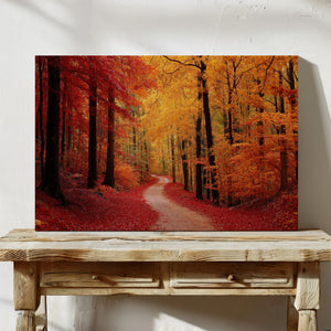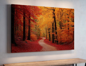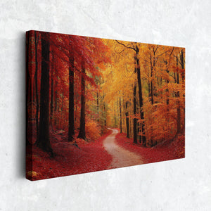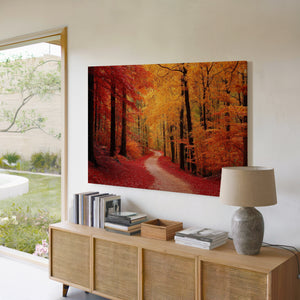 Immerse your space in the fiery beauty of fall with this vibrant autumn forest canvas print. A winding path cuts through a sea of glowing red and orange foliage, evoking the crisp air and brilliant colors of the season. This nature-inspired wall art brings warmth, movement, and color to any room, making it perfect for seasonal decorating or year-round appreciation of autumn’s charm. Whether displayed in a living room, hallway, or office, this gallery wrapped canvas offers a bold statement of natural elegance. It’s a stunning gift or a timeless addition to your home decor.