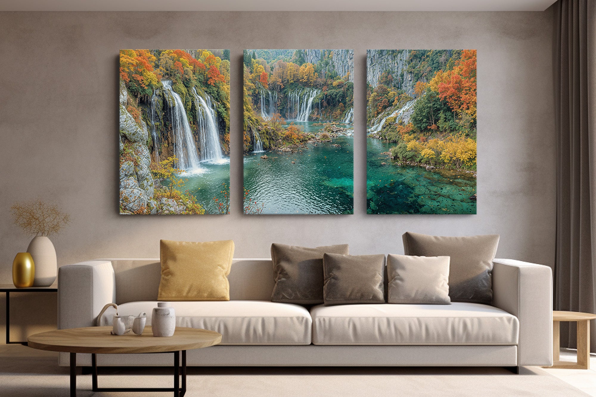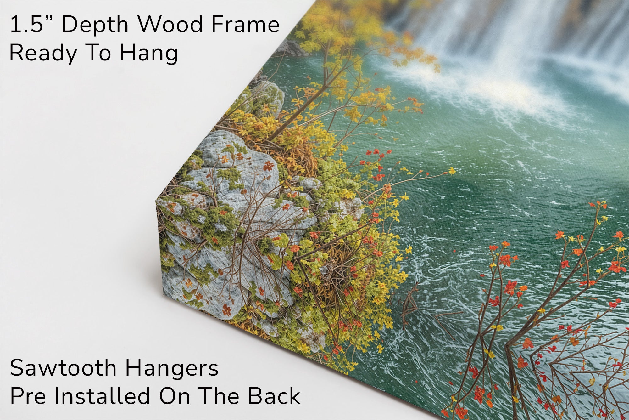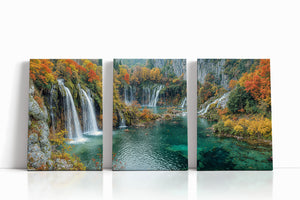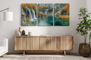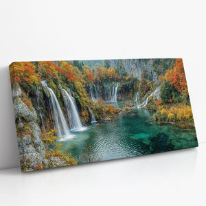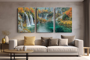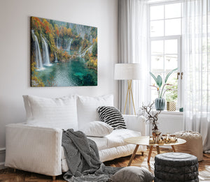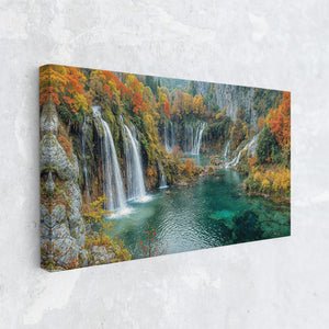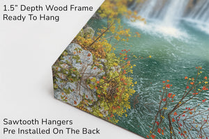 Let autumn’s golden crown reign eternal in your space with this breathtaking waterfall landscape. Brilliant fall foliage—burnt oranges, deep reds, and golden yellows—surrounds cascading white streams that tumble into jewel-toned turquoise pools below. This gallery wrapped canvas print brings nature’s finest seasonal symphony to life with vivid color and texture, ideal for creating warmth and wonder in any home decor.