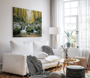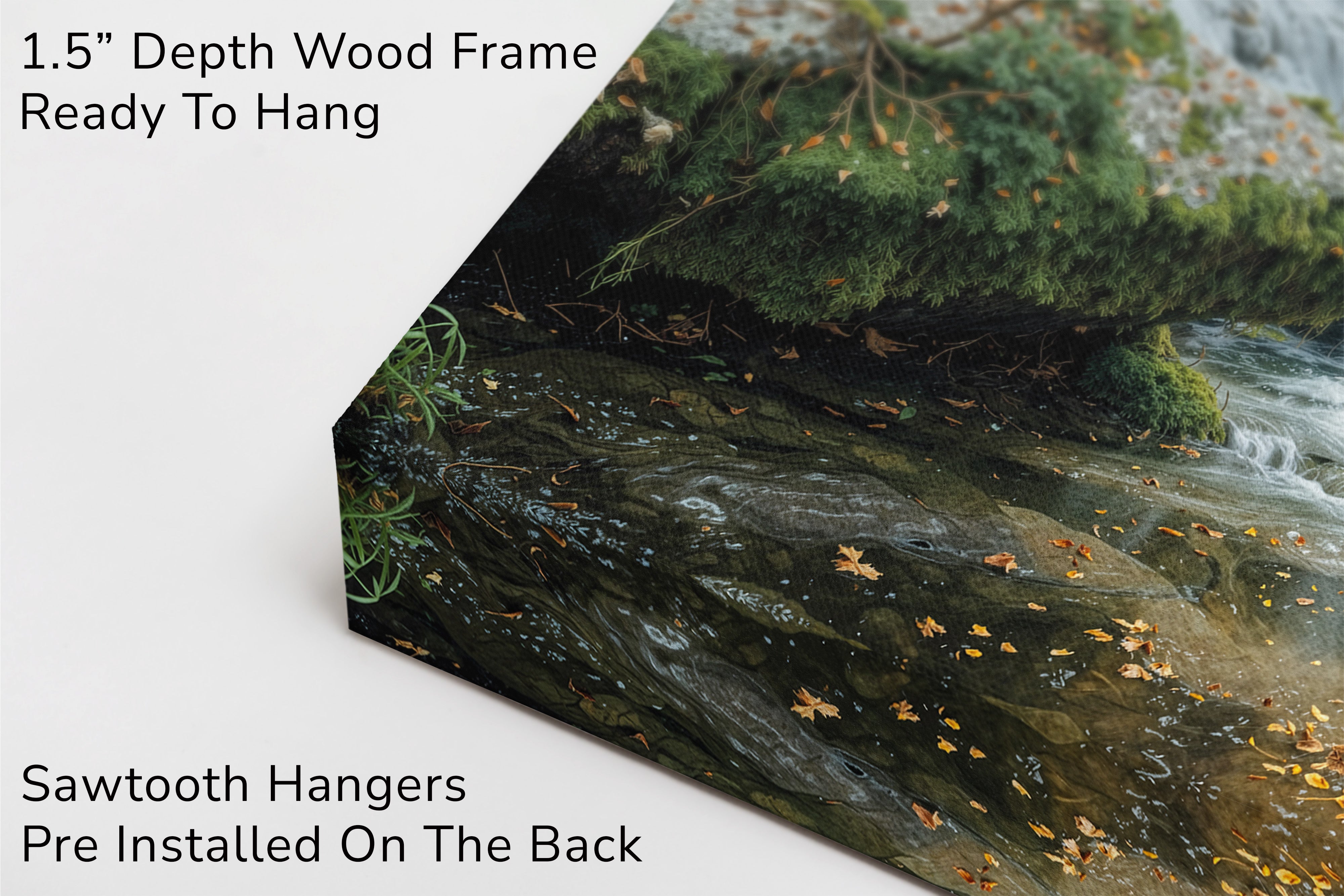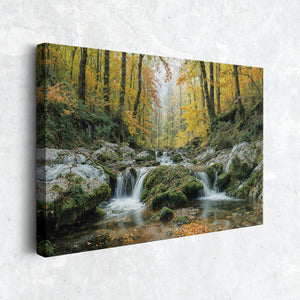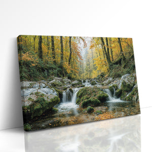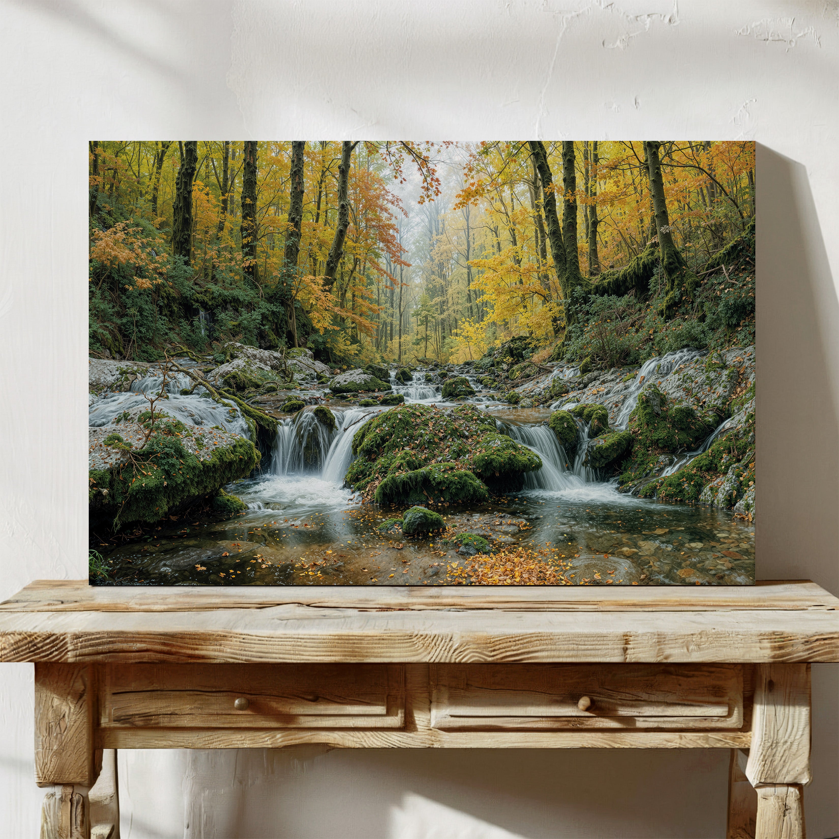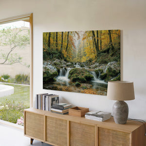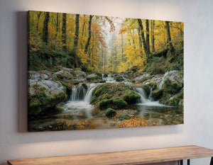 "The Stream That Carried the Season" captures a serene woodland scene as a gentle stream flows over mossy rocks under a canopy of golden autumn leaves. The rich textures of stone, water, and foliage create a vivid sense of depth and peace. This nature-inspired canvas print adds warmth and tranquility to any room. A perfect art print for nature lovers, rustic spaces, or anyone seeking seasonal charm in their home decor.