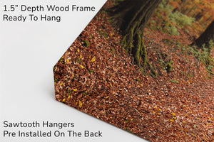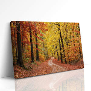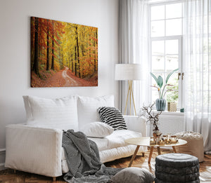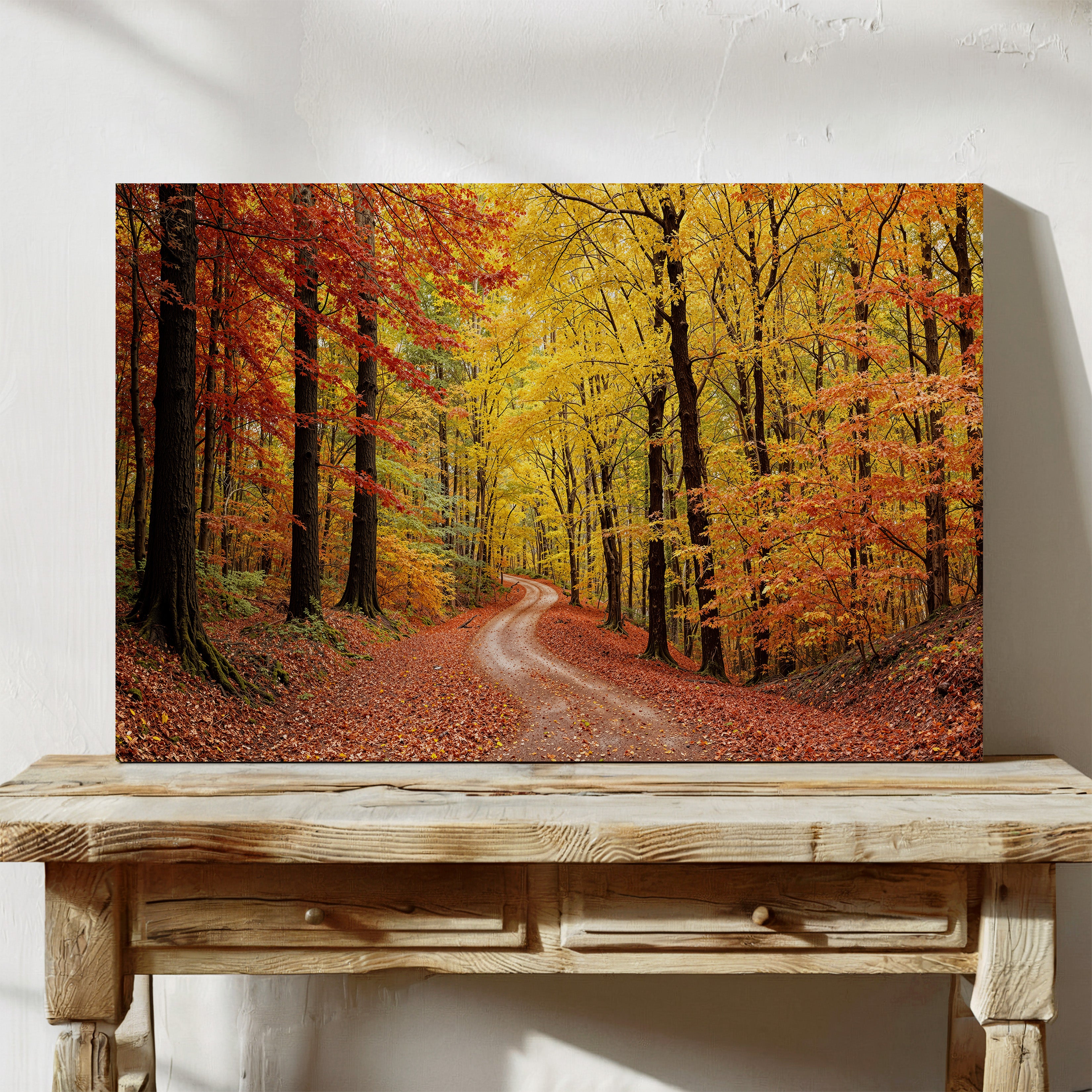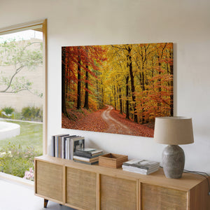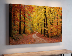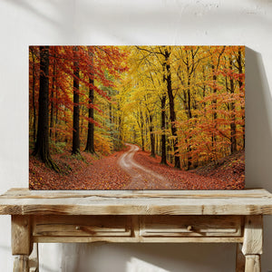 "Through the Veil of Autumn Gold" captures a breathtaking woodland scene where fiery red and golden leaves frame a winding path. This canvas print invites viewers into the heart of fall, evoking warmth, nostalgia, and the quiet magic of the changing season. A striking piece of wall art for any home decor style, this print brings cozy autumn vibes to living rooms, hallways, or seasonal spaces. Perfect for lovers of fall foliage and nature-inspired art prints.