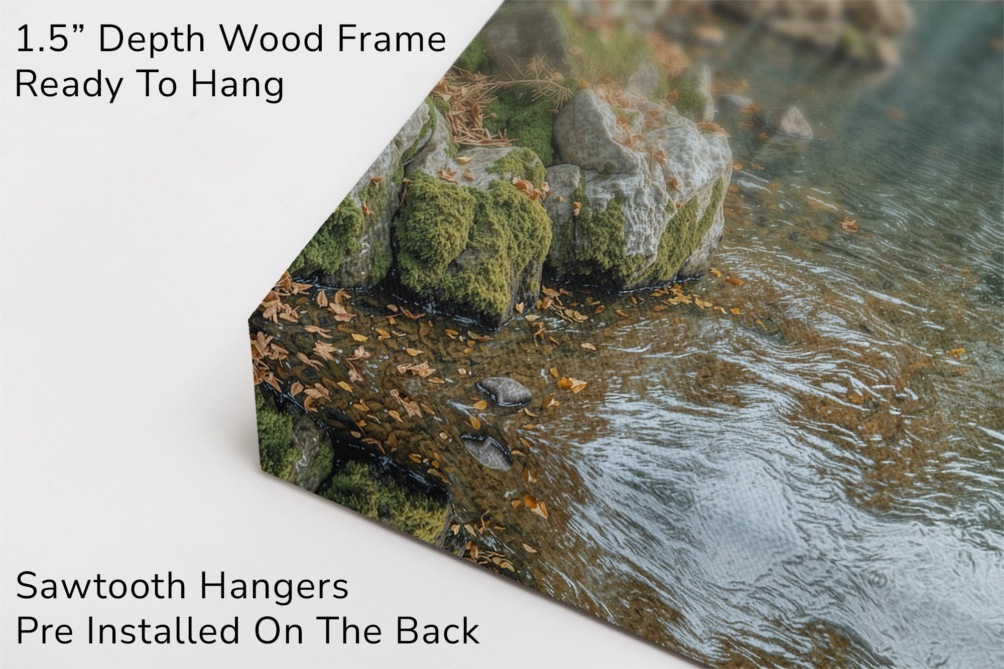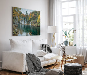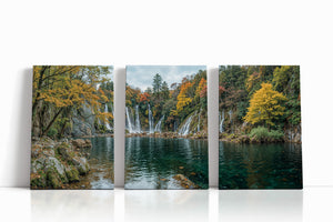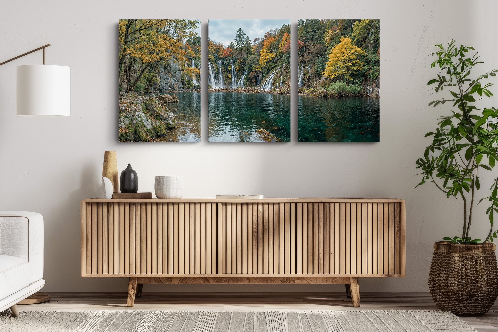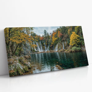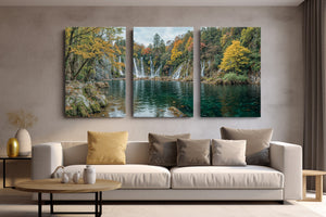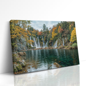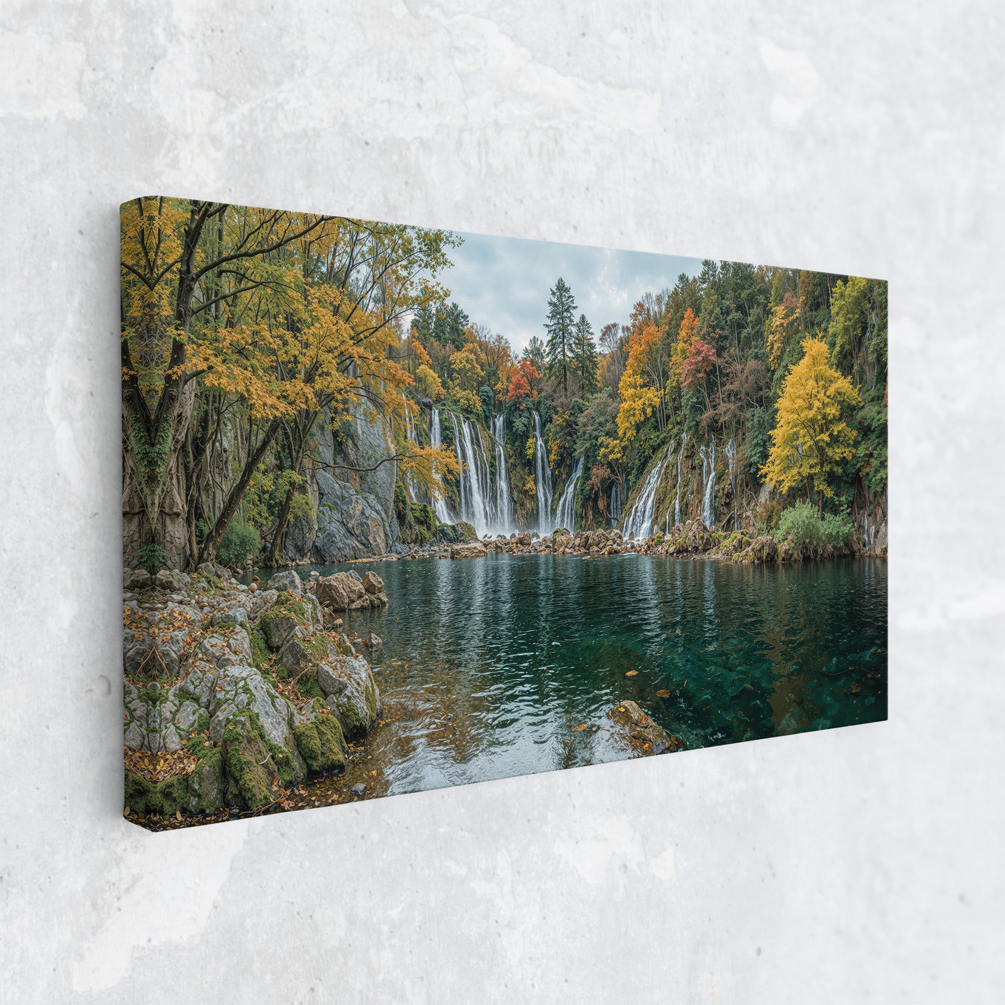 A lush forest cradles a series of breathtaking waterfalls that cascade into a still, emerald pool. The rich autumn foliage adds warmth and color to this tranquil sanctuary, offering a perfect balance of serenity and natural grandeur. A peaceful and striking scene that brings the calming beauty of nature into your space.