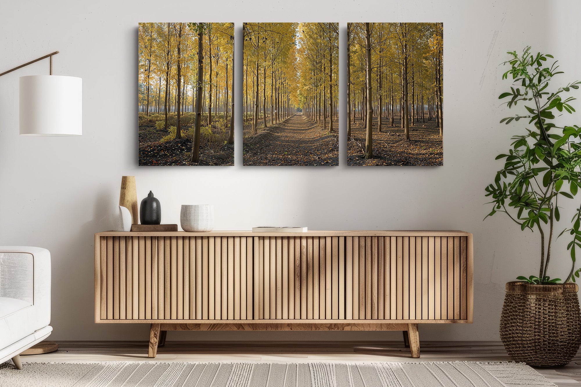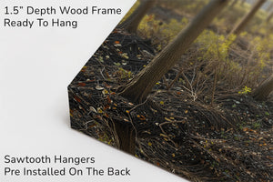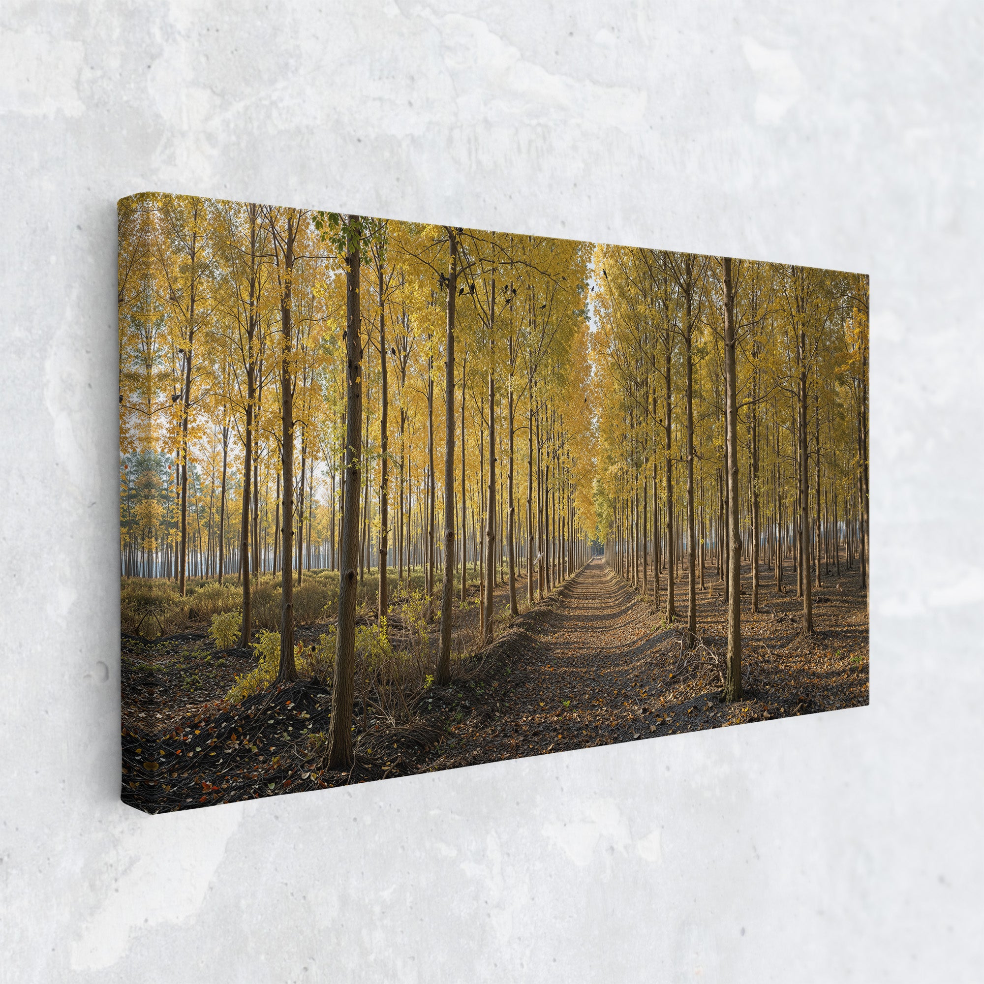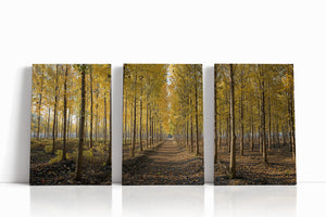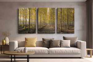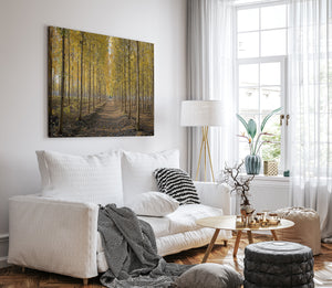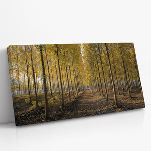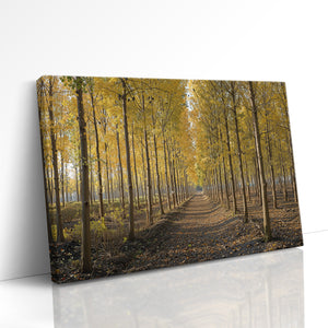 A golden pathway cuts through a dense grove of tall birch trees, their leaves aglow with the warm hues of autumn. Symmetrical rows create a sense of depth and serenity, drawing the eye toward a peaceful vanishing point beneath the soft afternoon light. This canvas print brings a touch of seasonal elegance and woodland charm to any space.