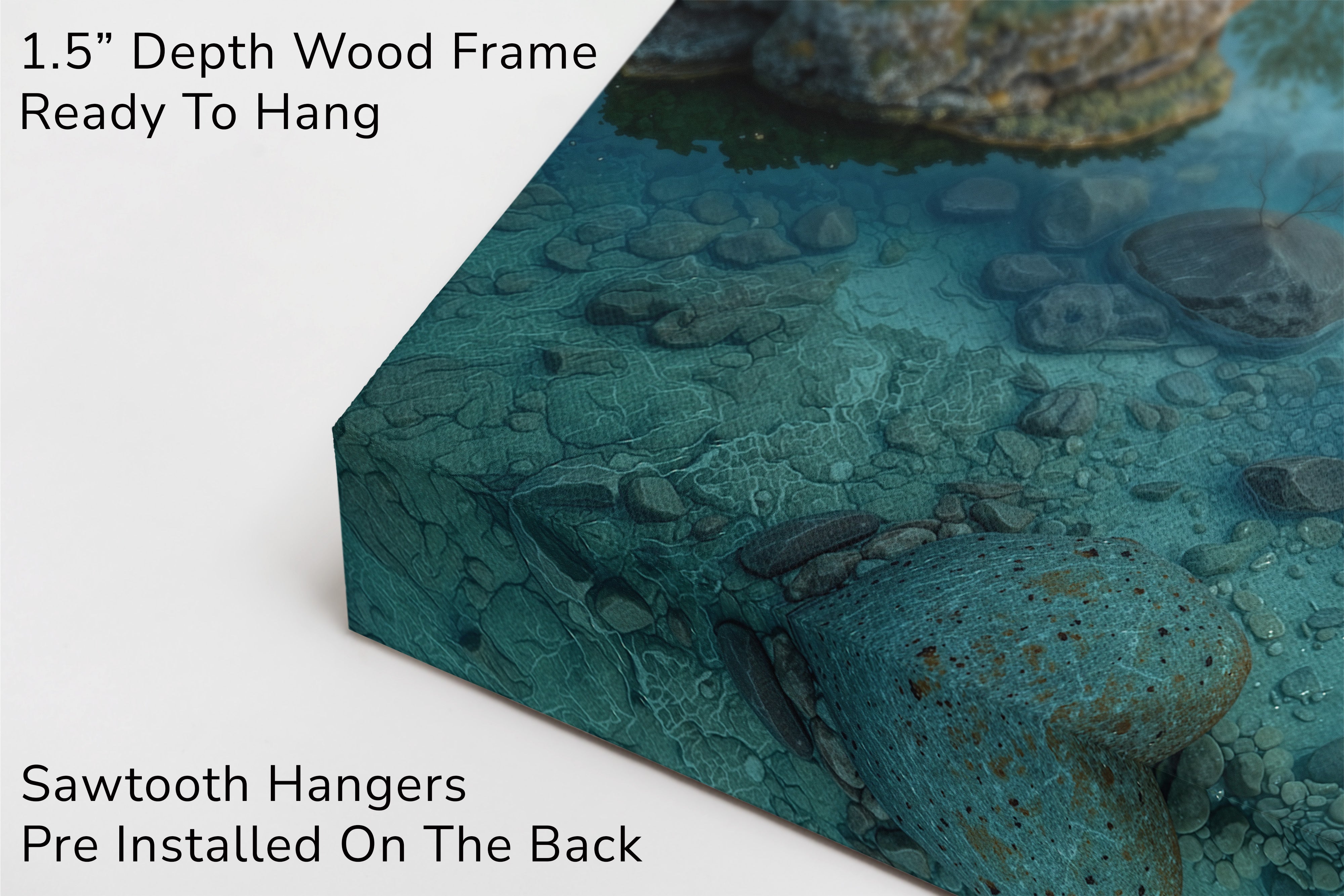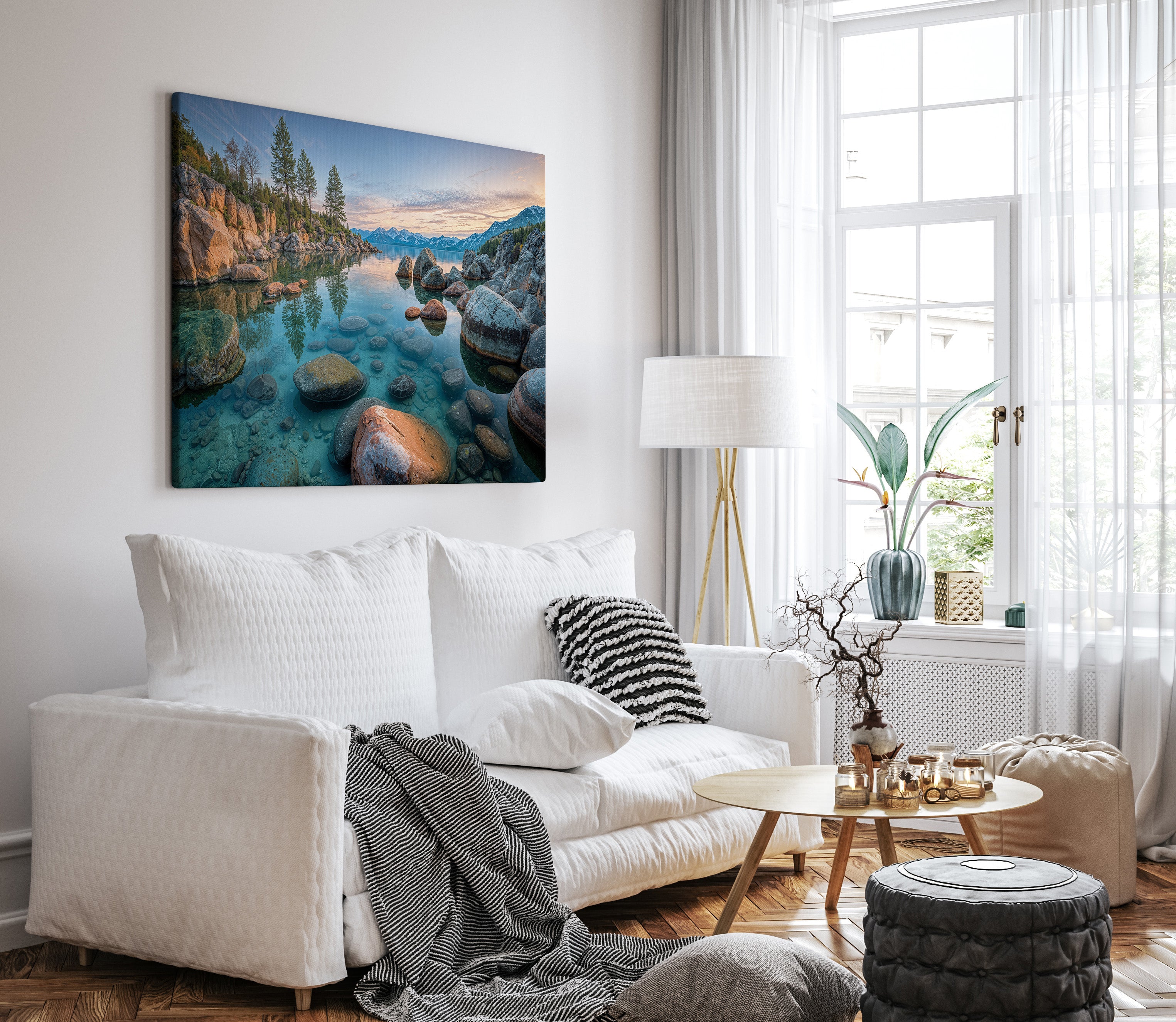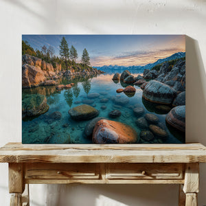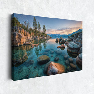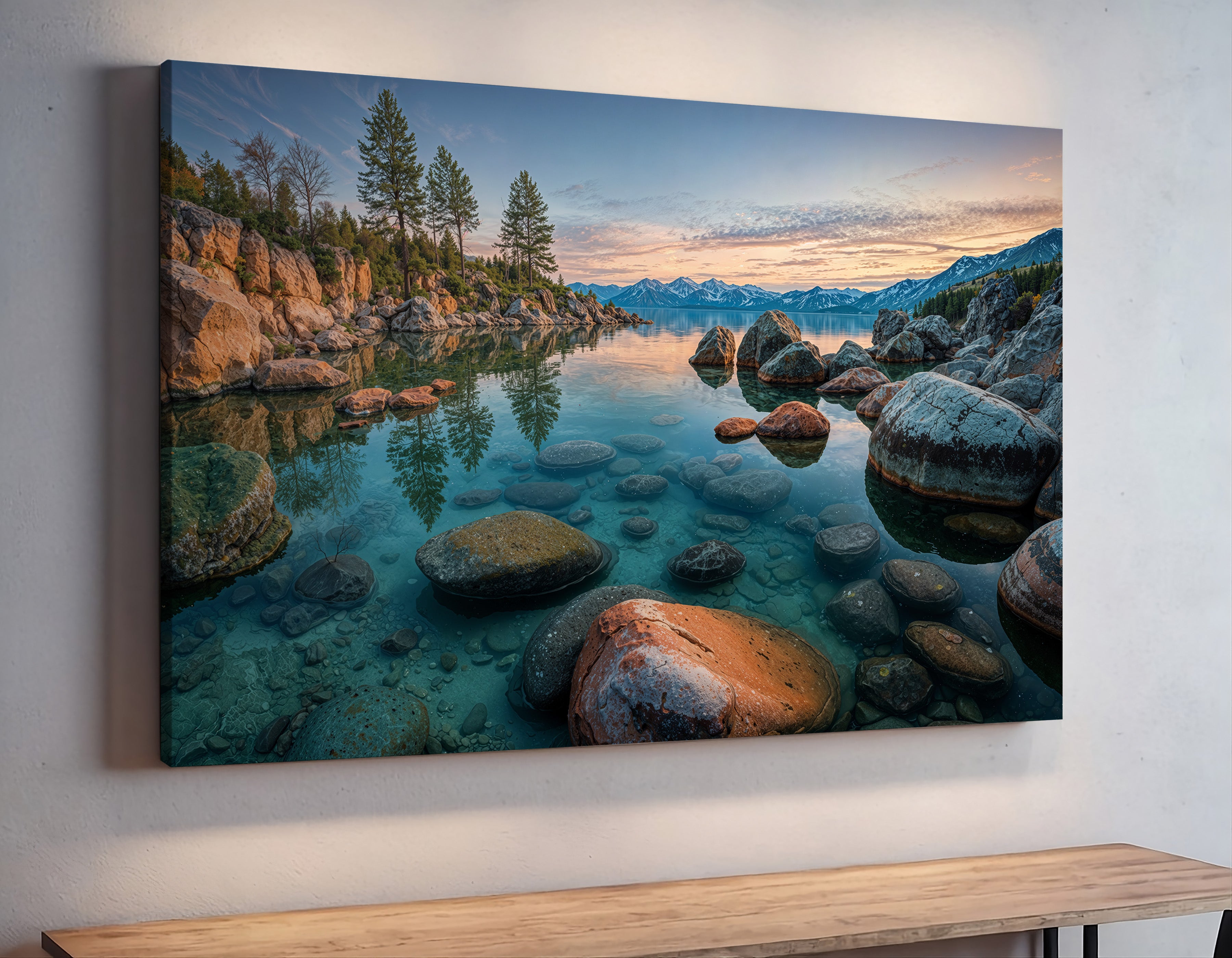 Capture the breathtaking clarity of nature with this gallery wrapped canvas print featuring a crystal-clear alpine lake. Smooth, colorful boulders rest beneath tranquil waters while pines and snow-capped peaks reflect along the horizon. The pristine stillness and natural tones make this the perfect wall art for lovers of lake landscapes and peaceful scenery. Ideal for entryways, bedrooms, or offices, this high-quality canvas print brings serenity and depth to your home decor. A stunning tribute to the beauty of untouched wilderness.