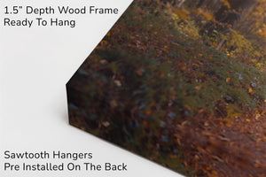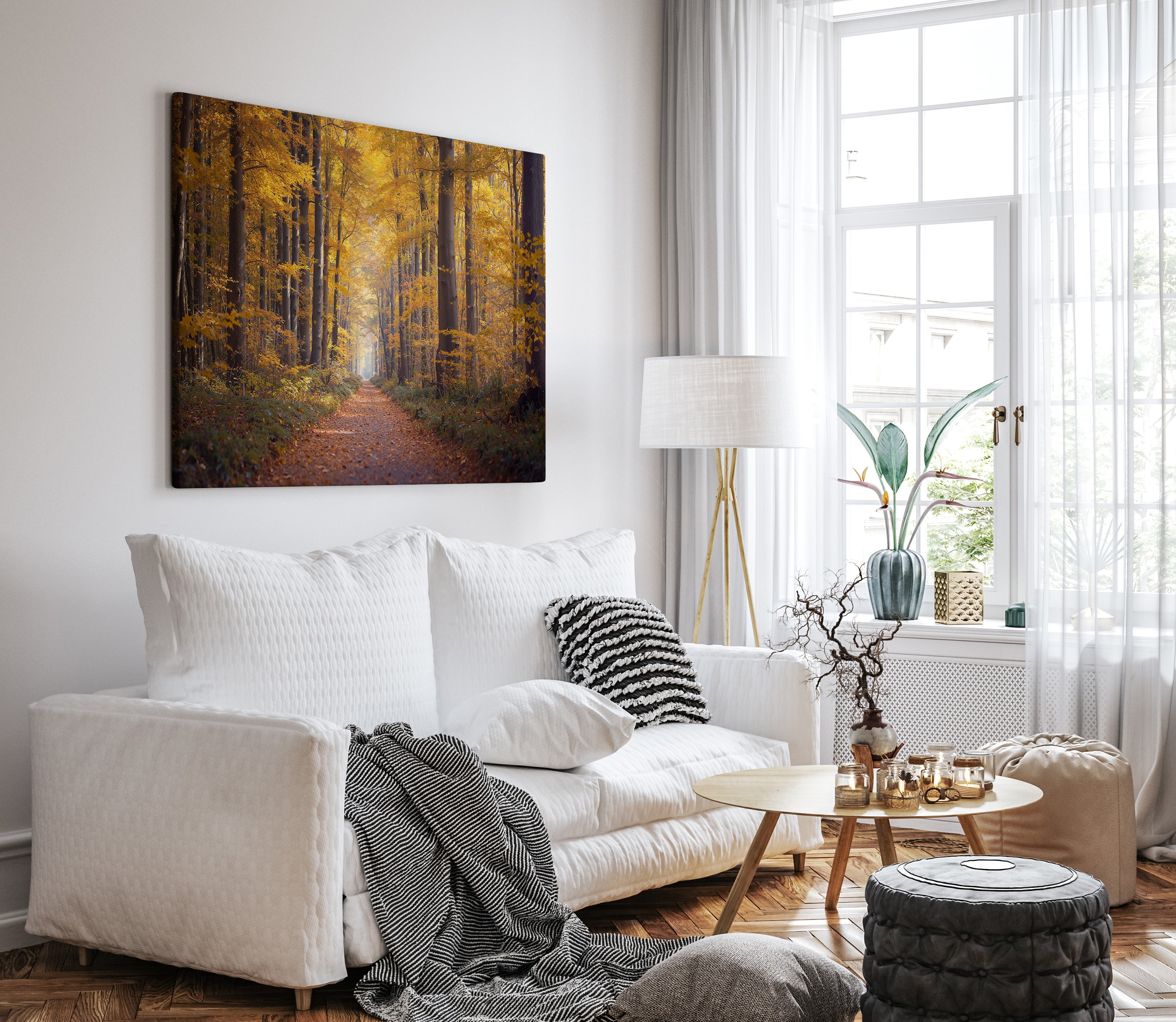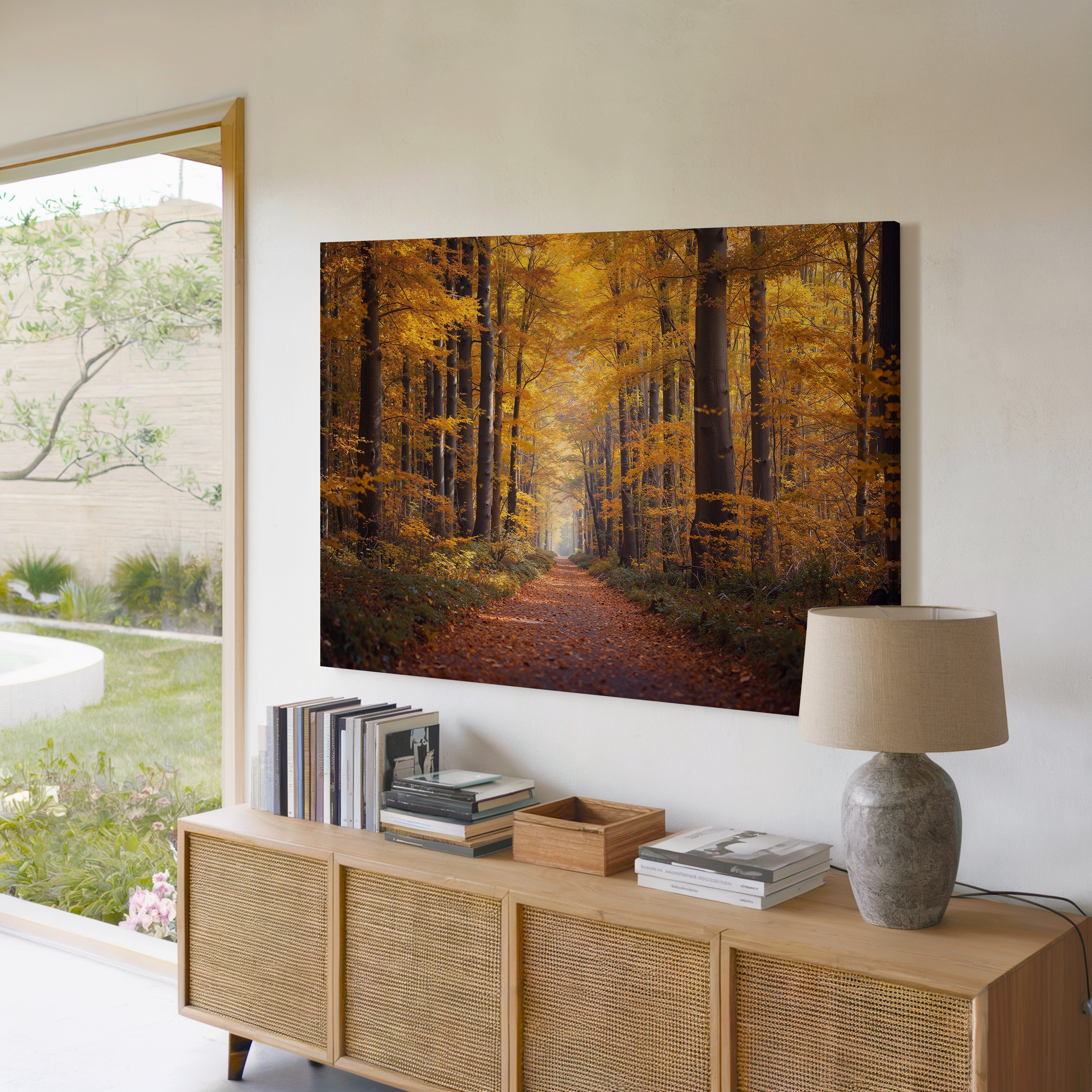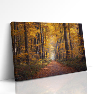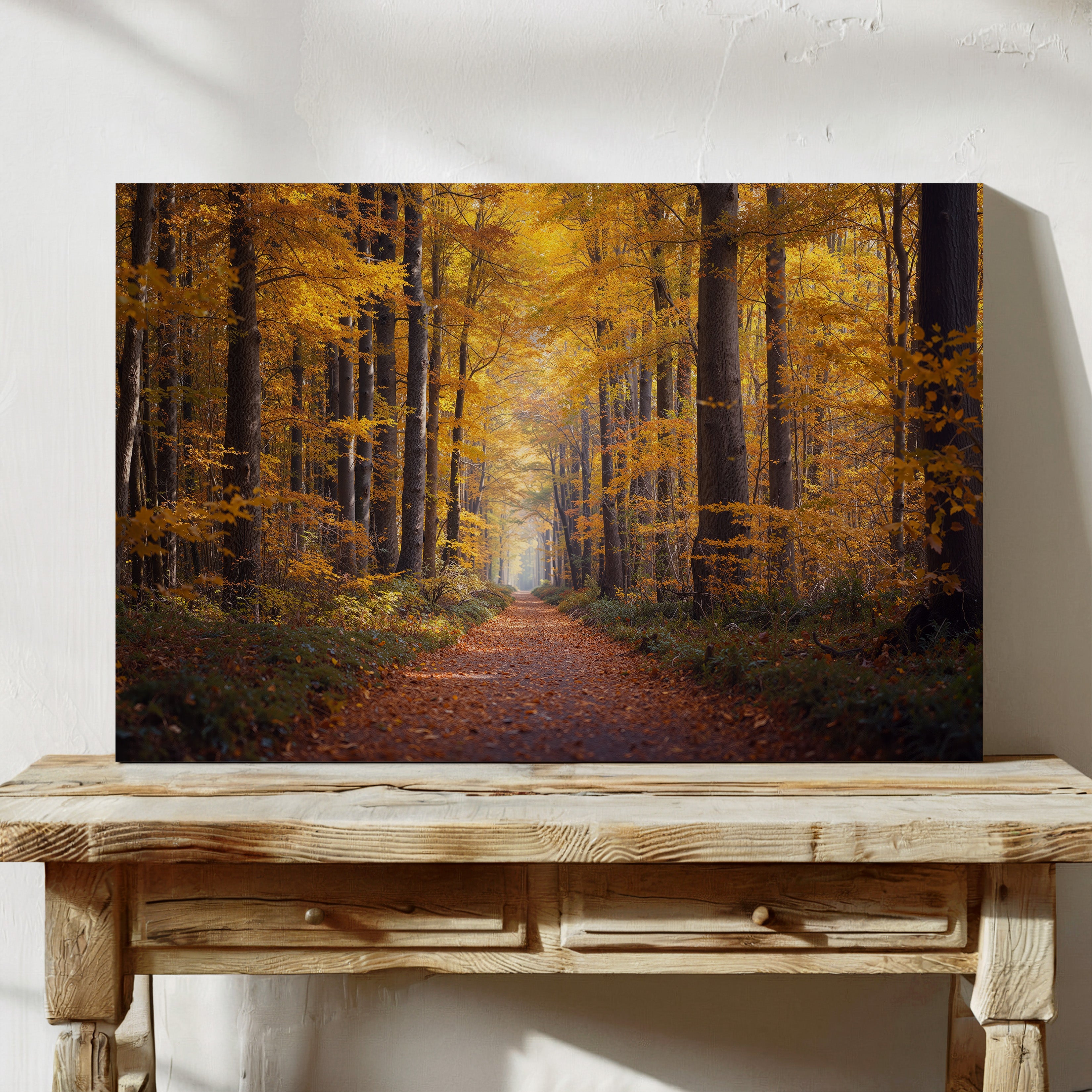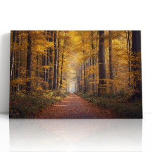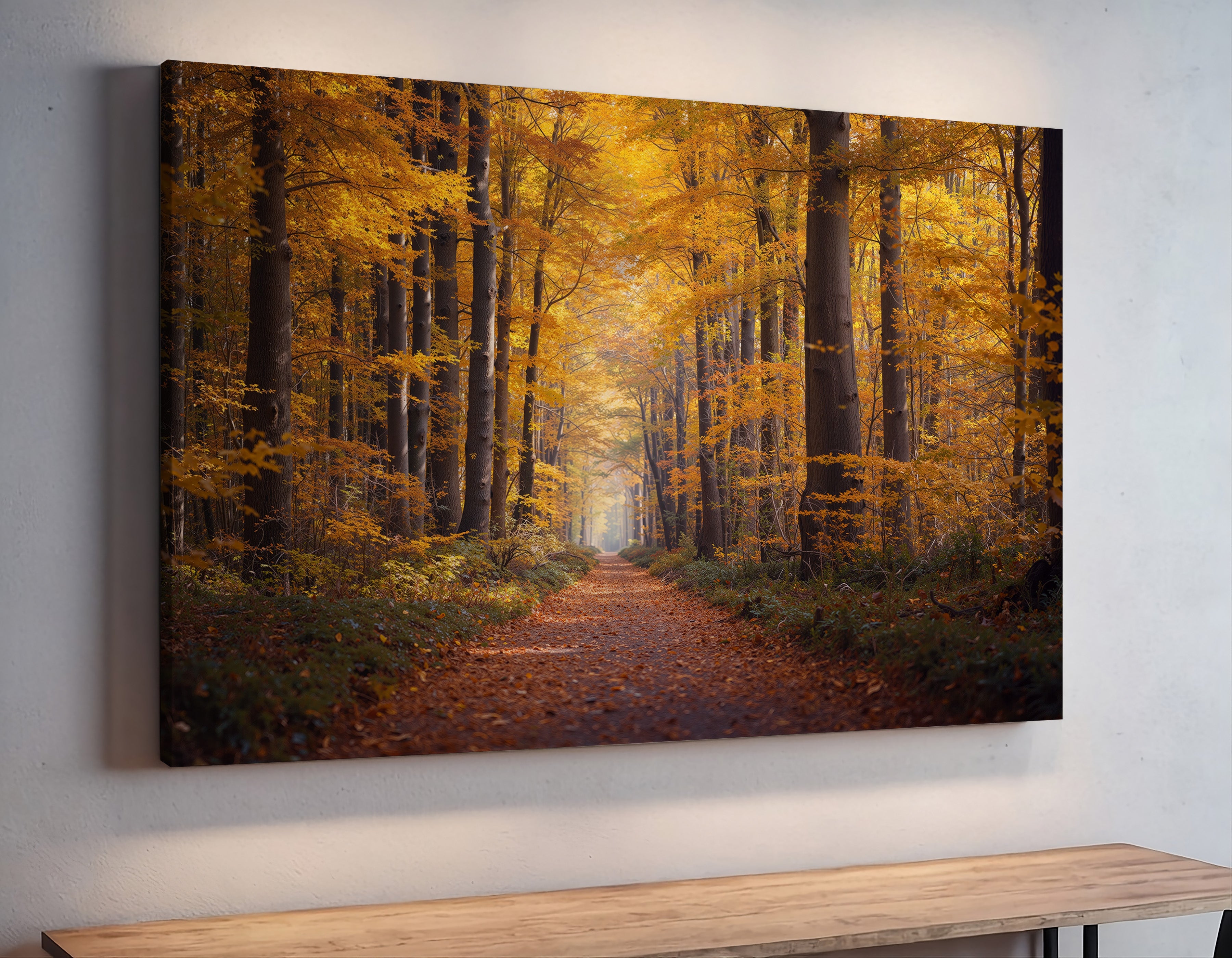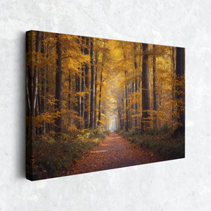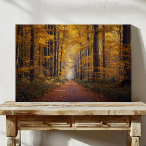 "The Path of Falling Light" captures a golden autumn corridor bathed in soft sunlight, where golden leaves cascade gently to the forest floor. Towering trees line the winding path, creating a serene, immersive tunnel of amber and gold that glows with seasonal warmth. This richly colored canvas print adds depth and tranquility to your space, perfect for nature lovers and fall-inspired home decor. A striking art print that evokes the peaceful passage of time and the quiet beauty of autumn.