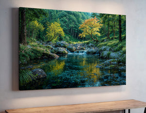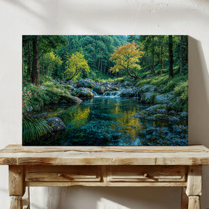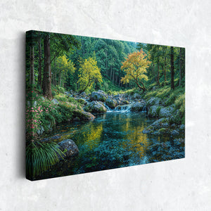 "The Stream that Sings in Color" presents a vibrant forest stream flowing gently between mossy boulders and flower-lined banks. A canopy of vivid green and warm-toned leaves casts brilliant reflections across the swirling water below. This nature-inspired canvas print brings energy, harmony, and beauty into any room. Perfect for those who appreciate vivid scenery, lush garden spaces, or tranquil nature escapes in their home decor.