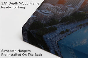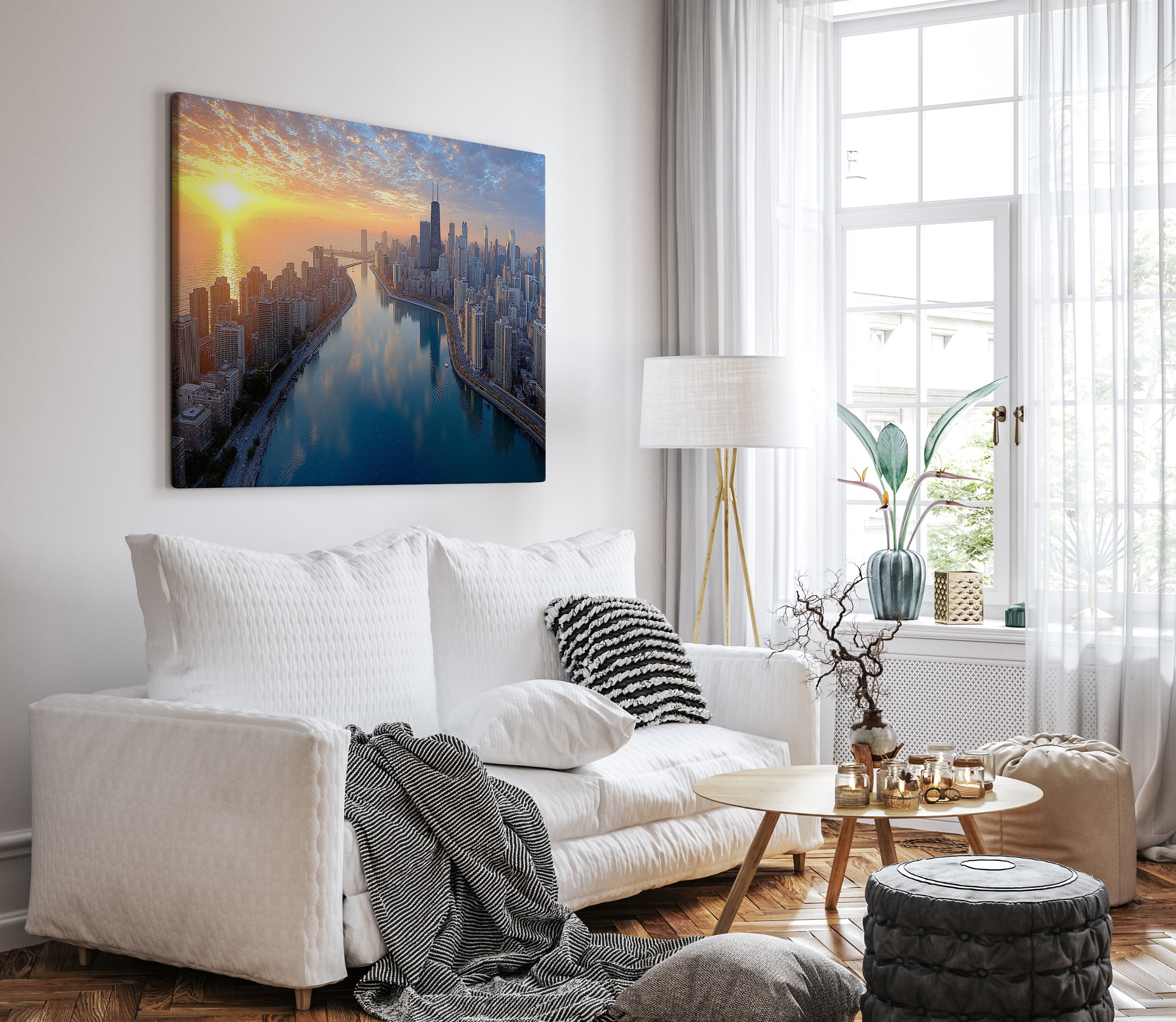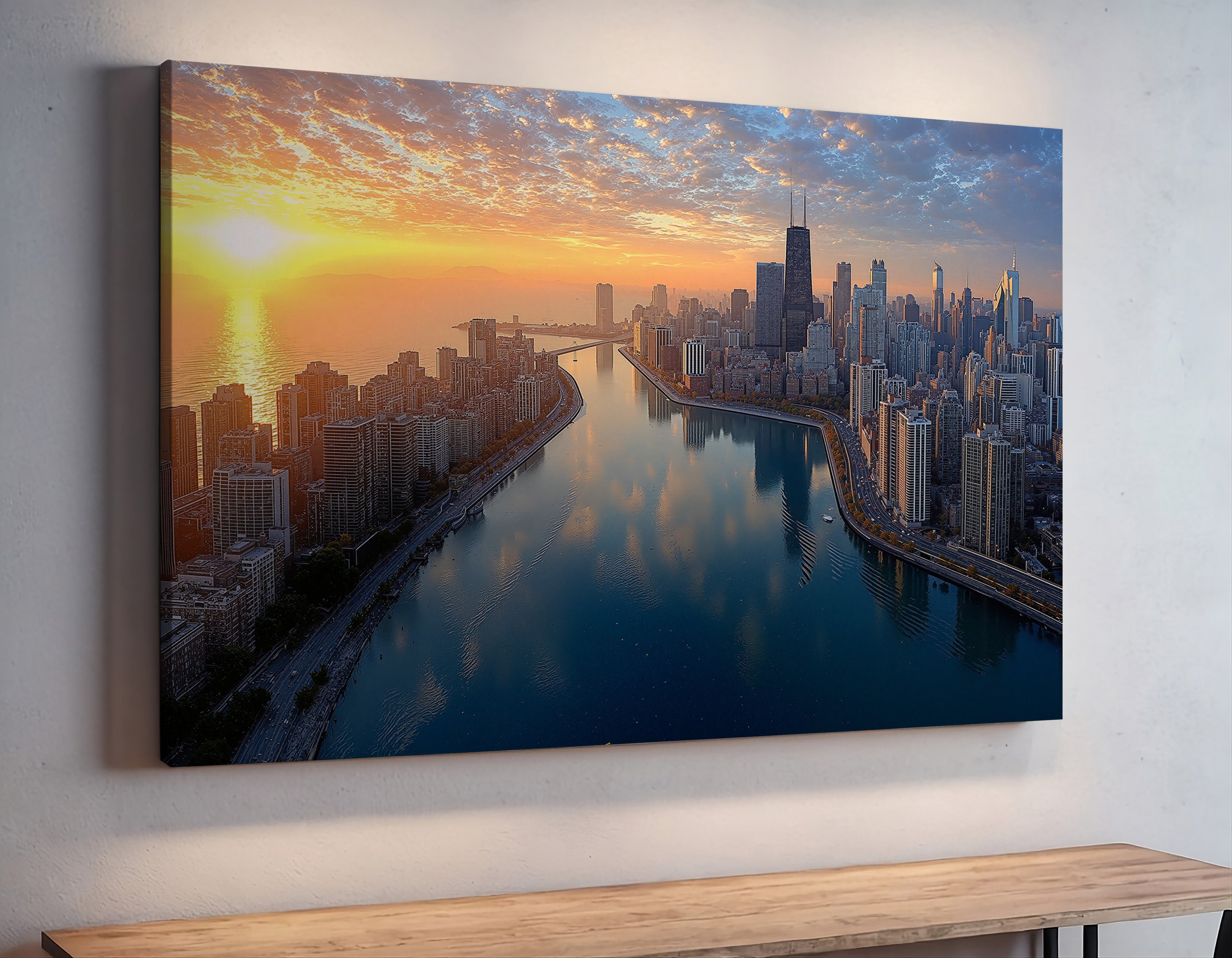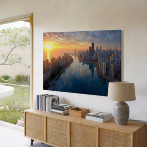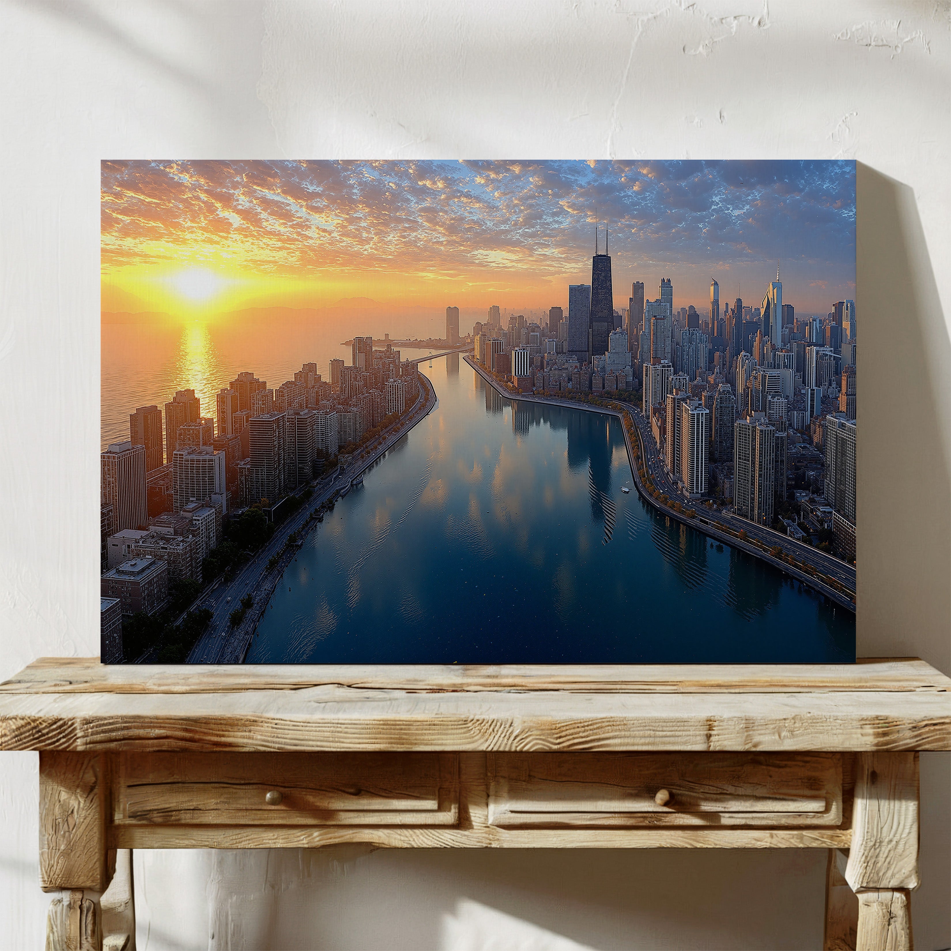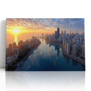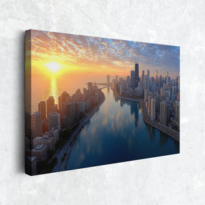 Greet the day with this stunning canvas print of the Chicago skyline bathed in golden morning light. The iconic cityscape reflects across a glassy lakefront channel as the sun rises over Lake Michigan, filling the scene with warmth and energy. From towering skyscrapers to the calm water below, this piece captures the bold beauty of an urban dawn. Perfect for modern spaces, office decor, or fans of Chicago architecture, this gallery wrapped canvas print adds sophistication and city charm to any room.