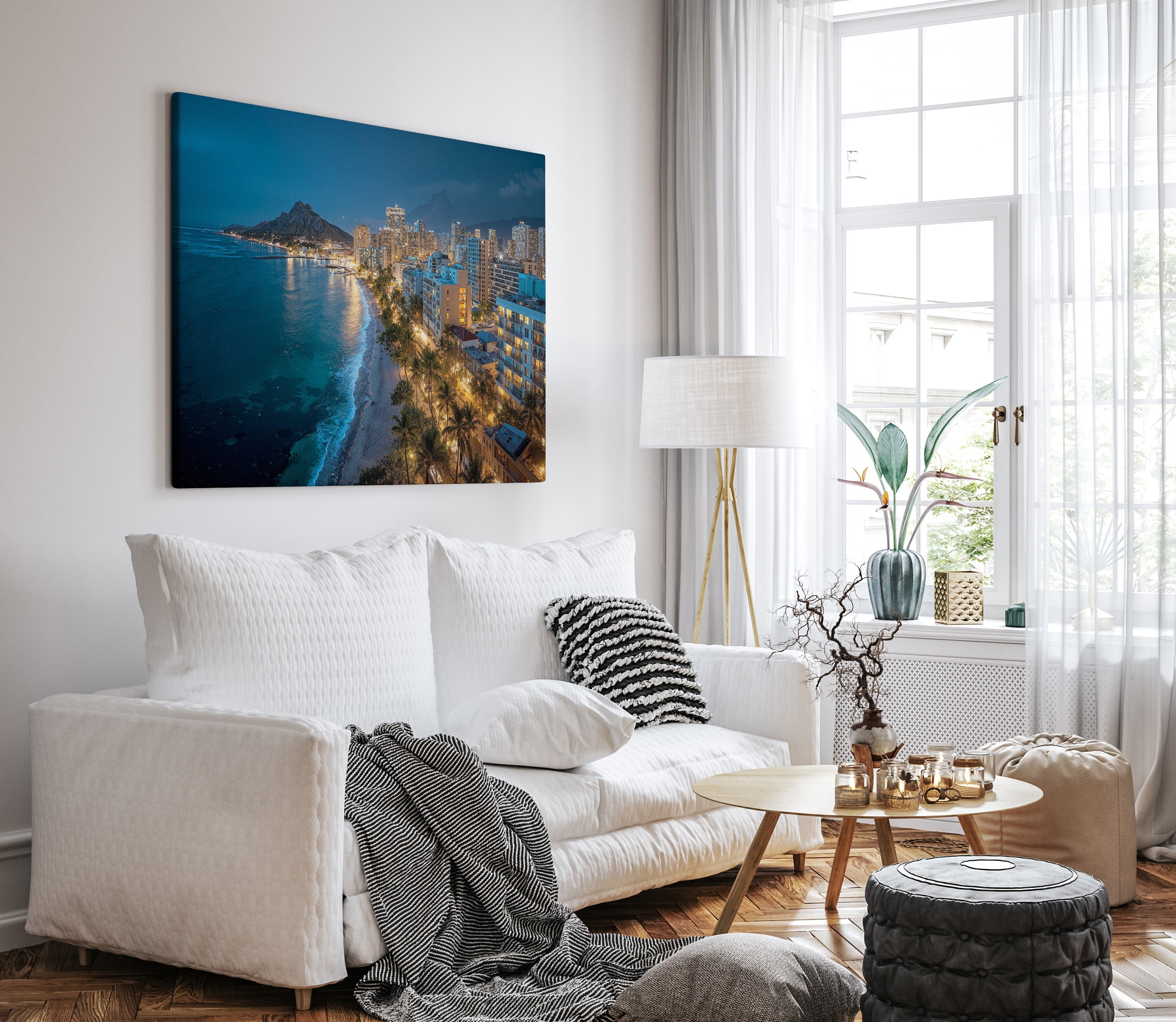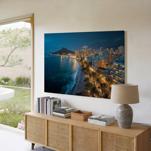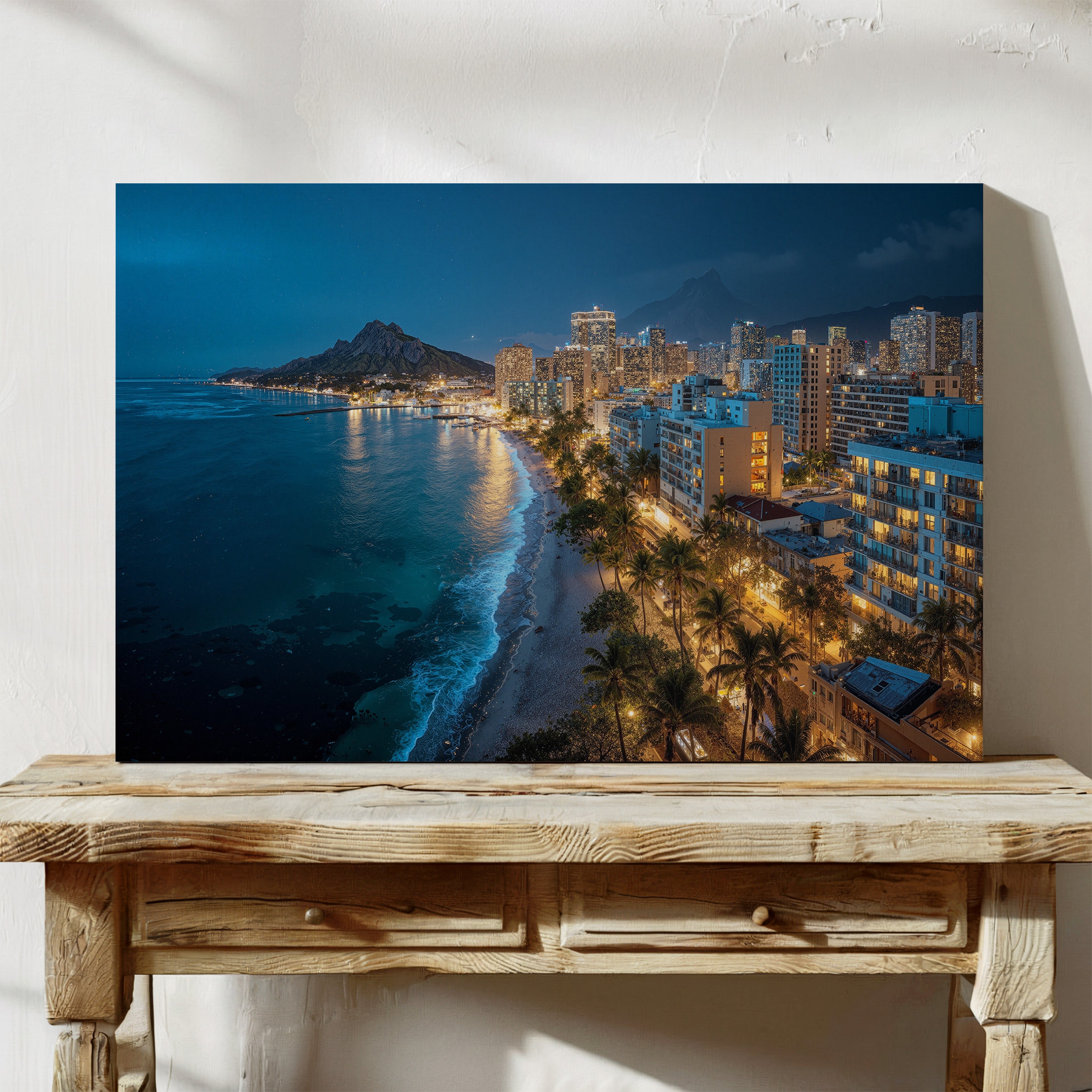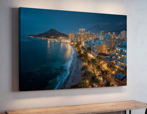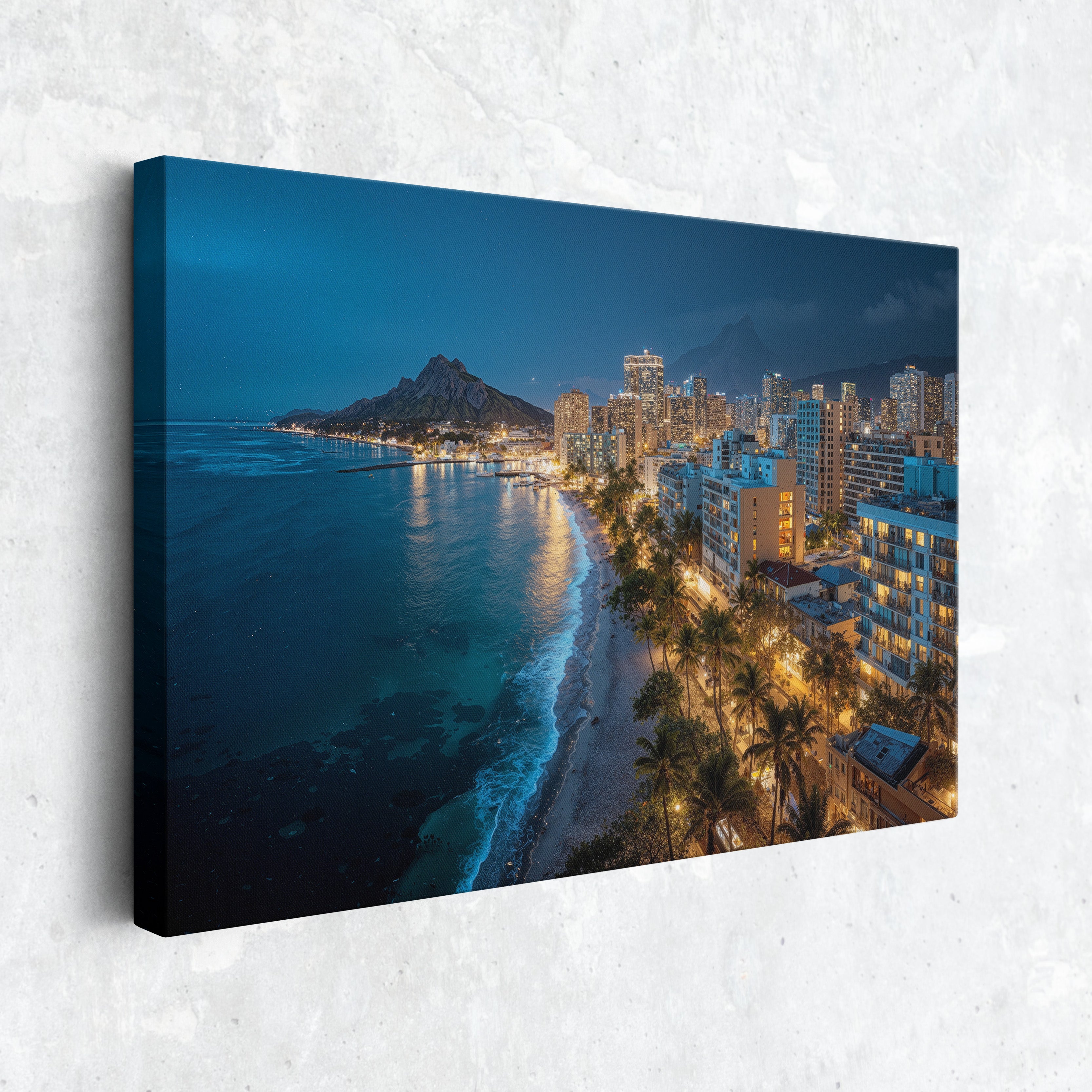 "Nocturne Over the Pacific Shore" captures the luminous rhythm of city life as it melts into the calm embrace of the ocean. With golden lights shimmering along the coastal skyline and gentle waves gliding beneath a twilight sky, this artwork evokes the stillness and vibrancy of coastal nights. This elegant canvas print is ideal for those who find peace in urban serenity and the soft pulse of oceanfront cities. A perfect blend of modern beauty and natural calm, it adds sophistication and balance to any home decor.