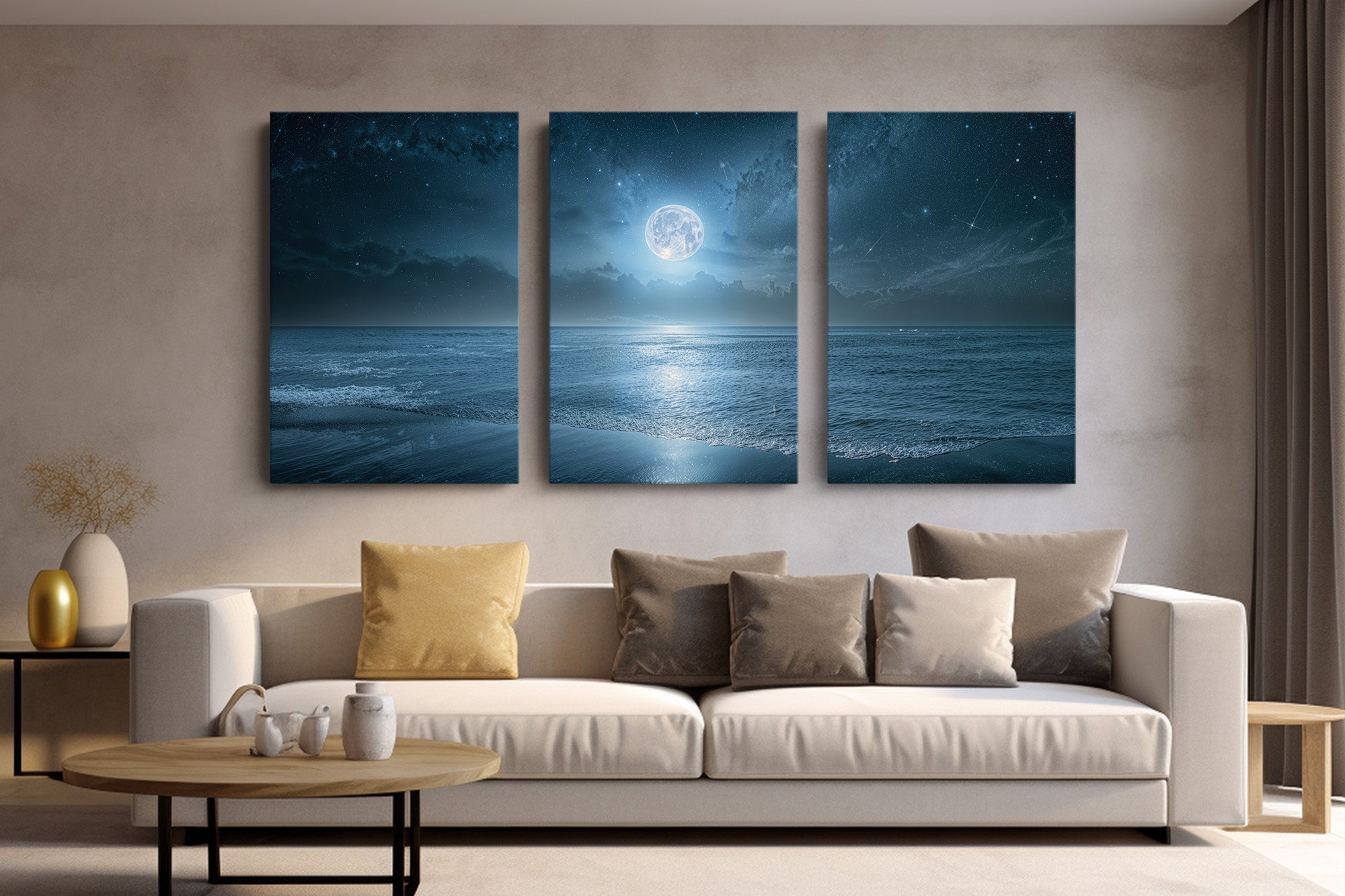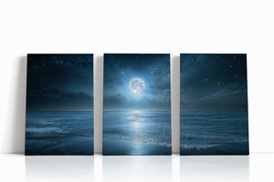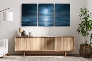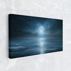 A radiant moon rises above a peaceful midnight ocean, casting silver light across calm waves. A galaxy of stars fills the sky, drifting into wisps of cosmic cloud, while gentle tides reflect the serenity of this celestial night. This surreal moon and ocean canvas print evokes wonder, stillness, and cosmic beauty. Whether placed in a bedroom, meditation room, or reading nook, this atmospheric wall art will transform your space with its dreamlike depth.