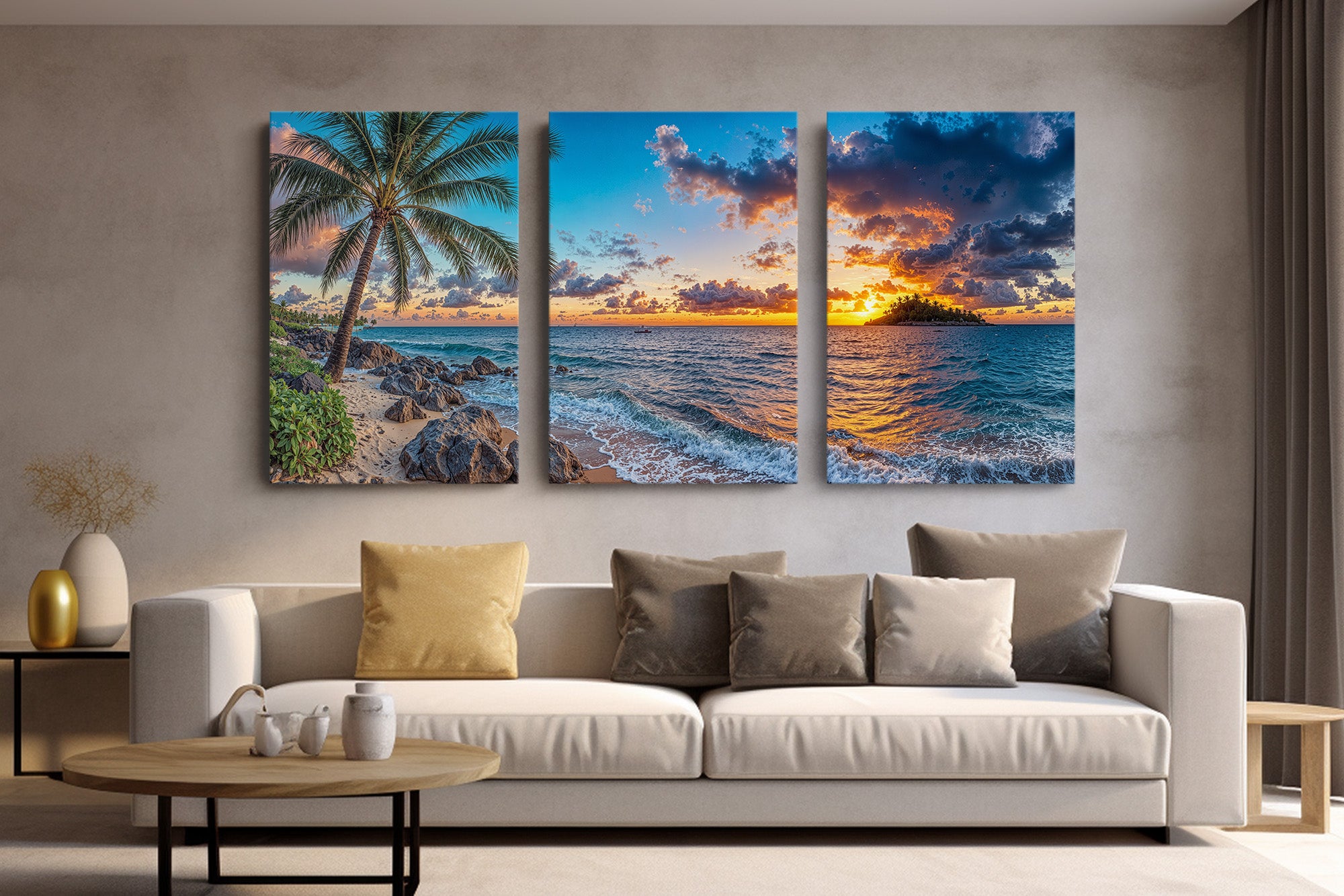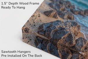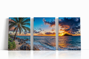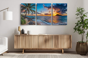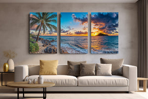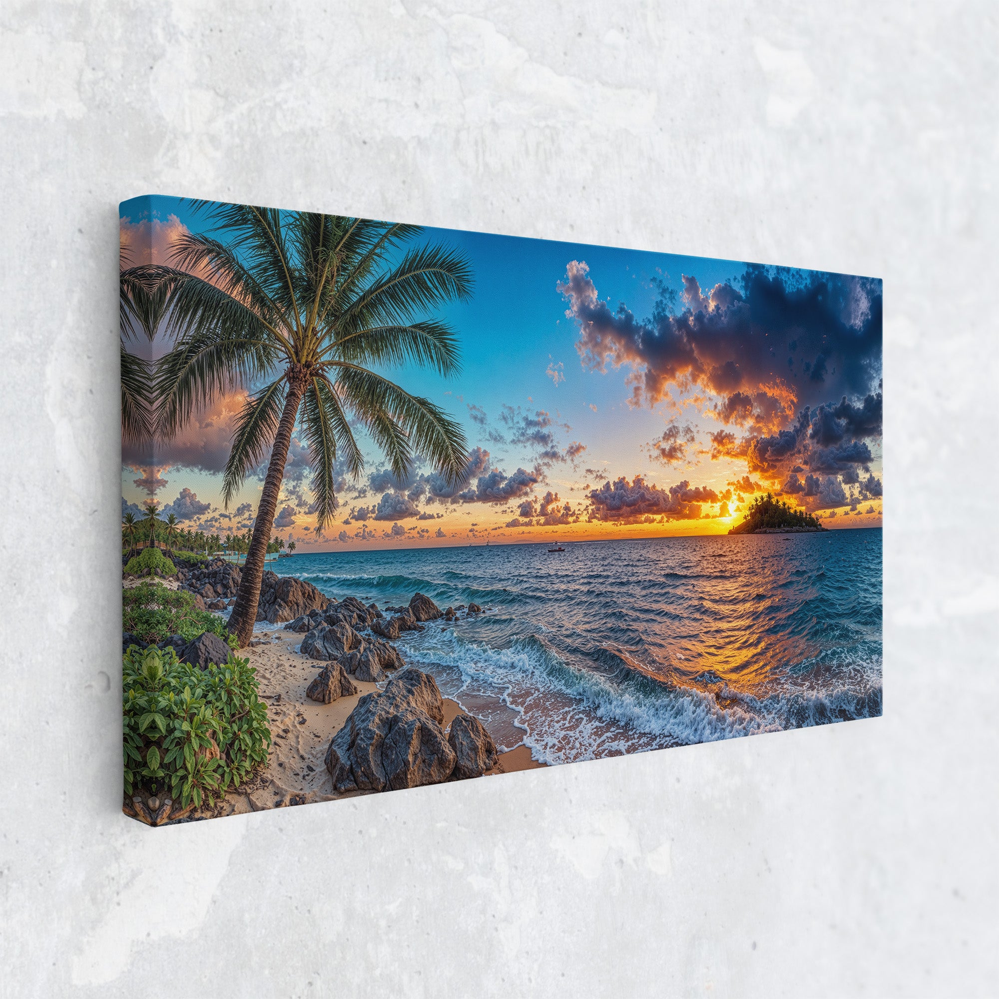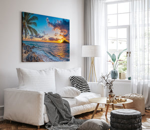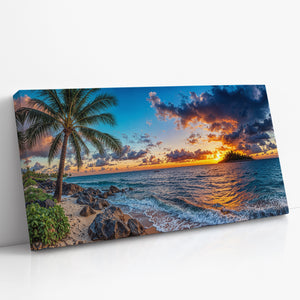 Experience the breathtaking magic of a tropical sunset captured in vivid detail. “Isle of the Setting Sun” features a brilliant orange and purple sky over calm island waters, framed by swaying palms and gentle waves washing against rocky sand. This coastal canvas print brings warmth, tranquility, and the exotic beauty of island evenings into your home — perfect for beach lovers, sunset chasers, and anyone drawn to the allure of paradise.