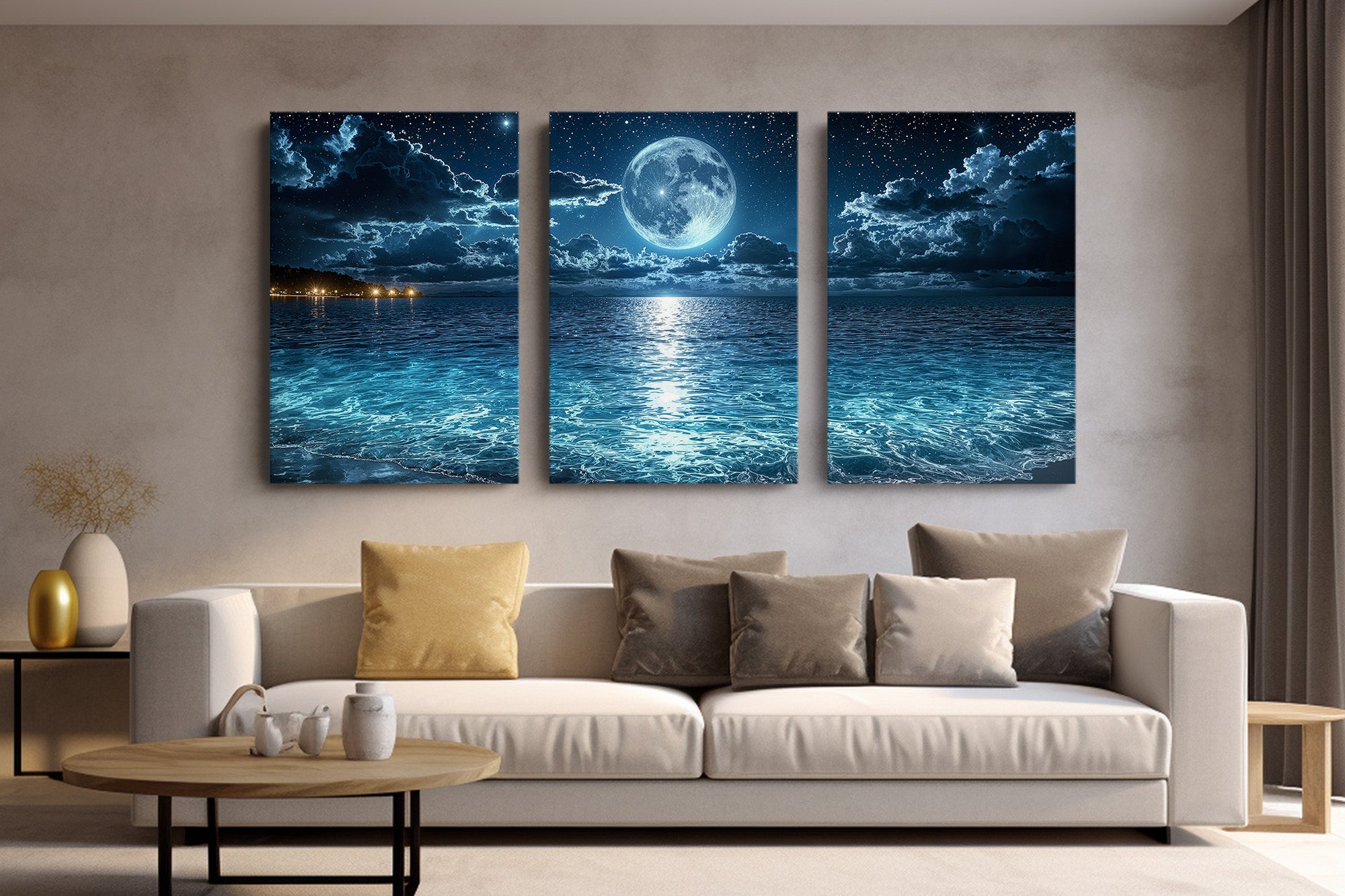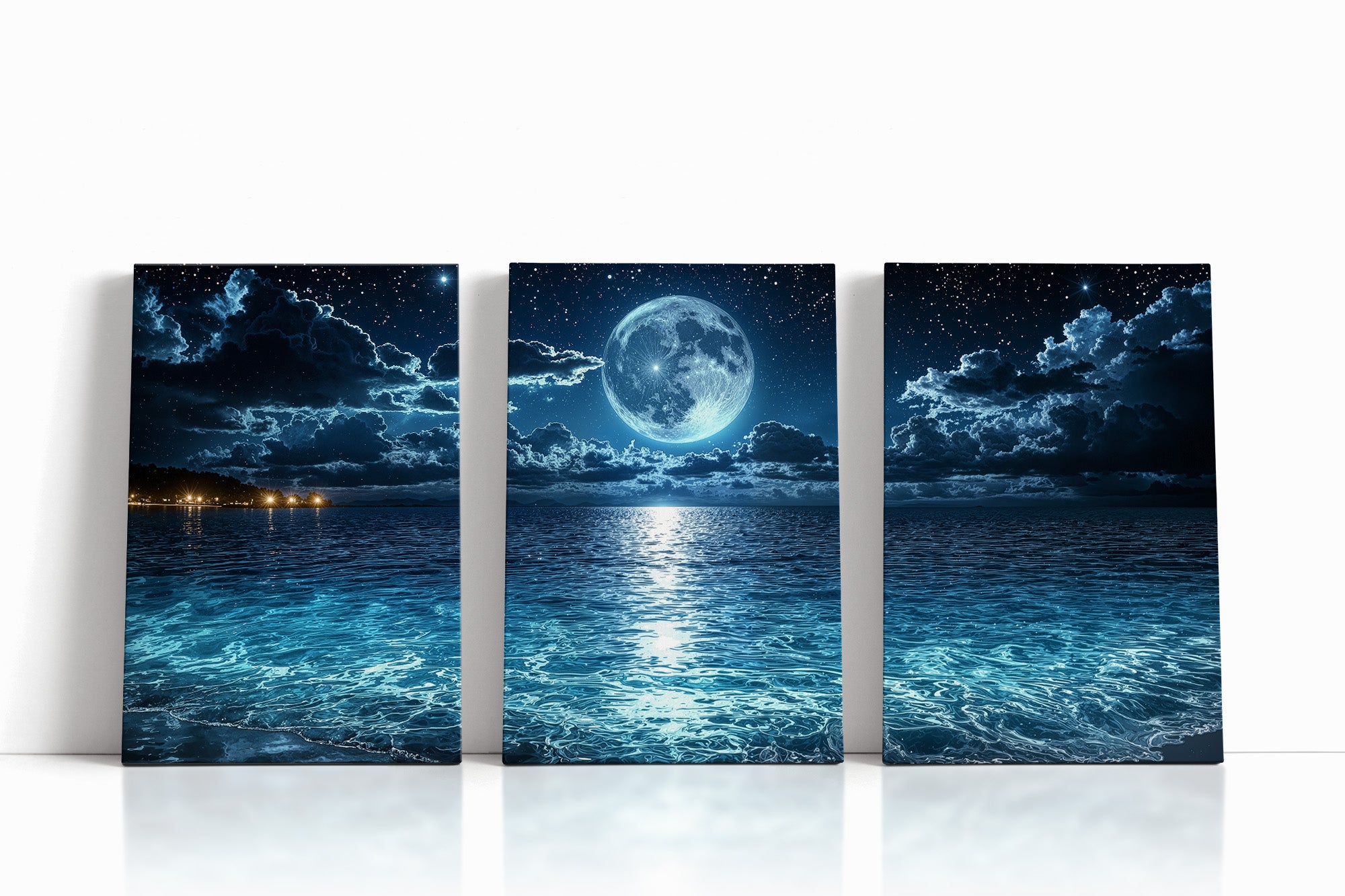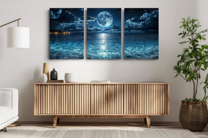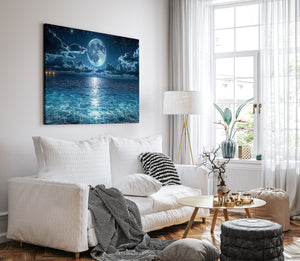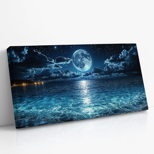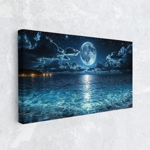 The moon hangs in luminous stillness above a tranquil sea, casting shimmering light across the water’s rippling surface. Stars sparkle in the night sky as gentle waves roll ashore under a celestial glow. This mesmerizing seascape captures a moment of quiet wonder — where ocean, moonlight, and sky become one. A stunning piece for bedrooms, meditation areas, or modern interiors seeking mood, reflection, and atmospheric depth.