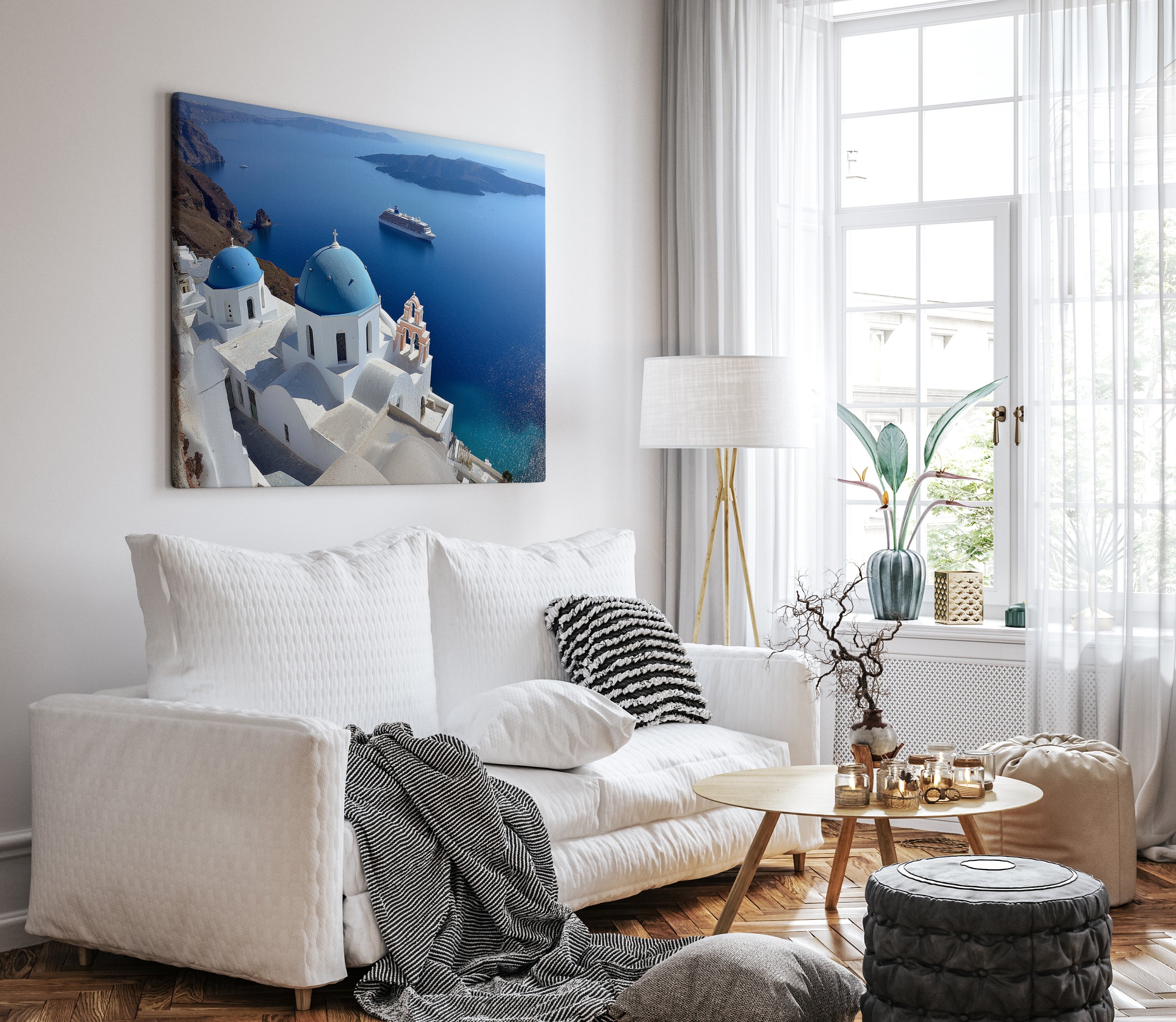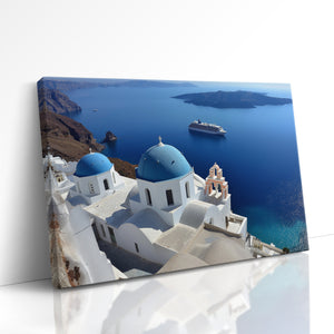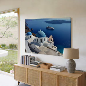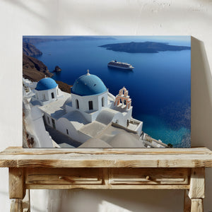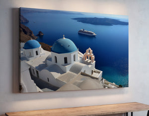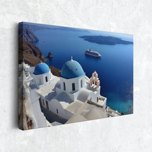 "Whispers of Santorini Waters" showcases the iconic blue-domed churches of Santorini gazing over the sparkling Aegean Sea. A distant cruise ship floats peacefully by volcanic cliffs, adding to the dreamlike charm of this Mediterranean paradise. This stunning canvas print brings the elegance of Greek architecture and the serene beauty of island life into your home. Perfect for lovers of travel, coastal decor, and timeless views, it adds a touch of sunlit escape to any space.