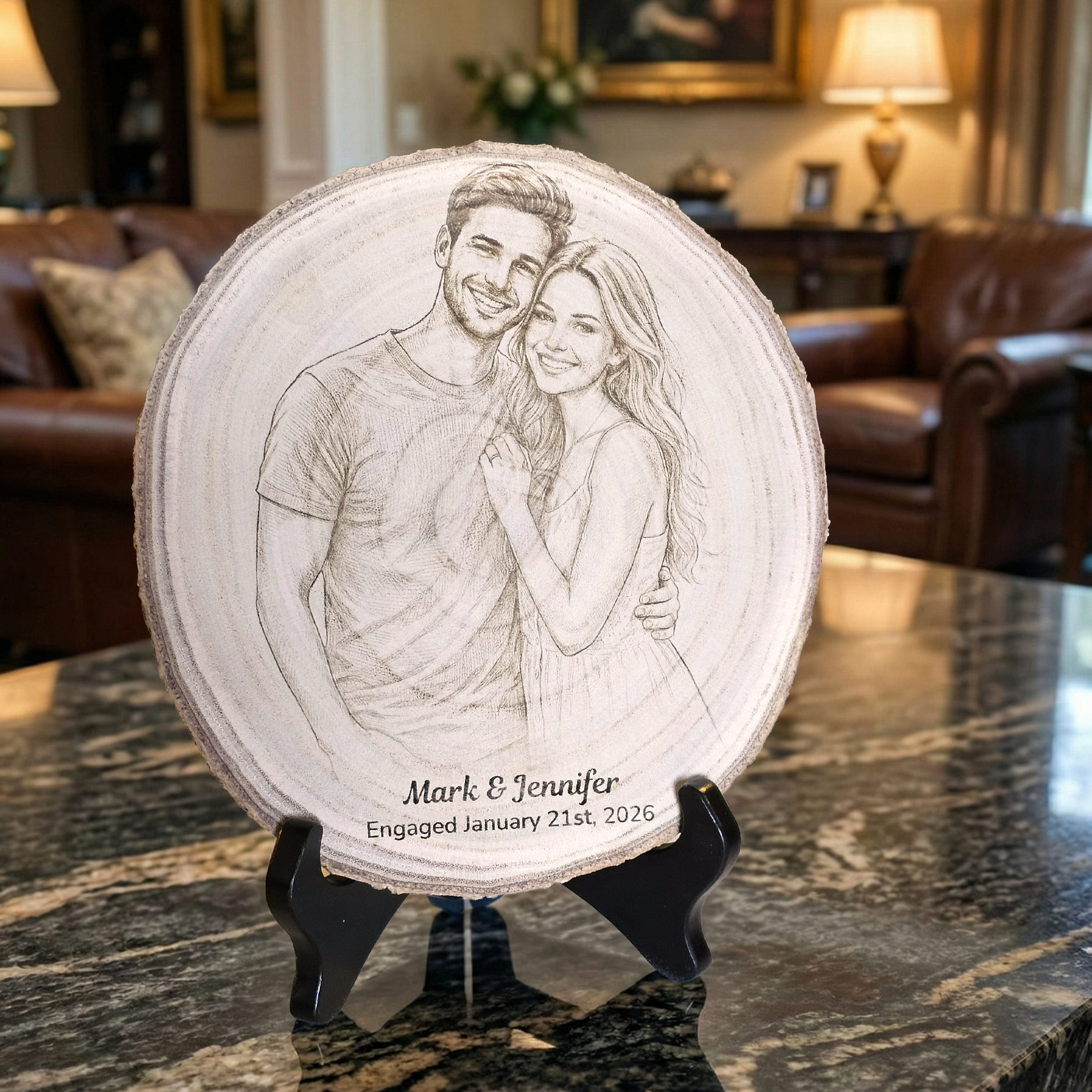 Custom Wood Couples Portrait Engraving – Engagement, Wedding, Or Anniversary Photo Plaque Tree Slice