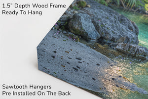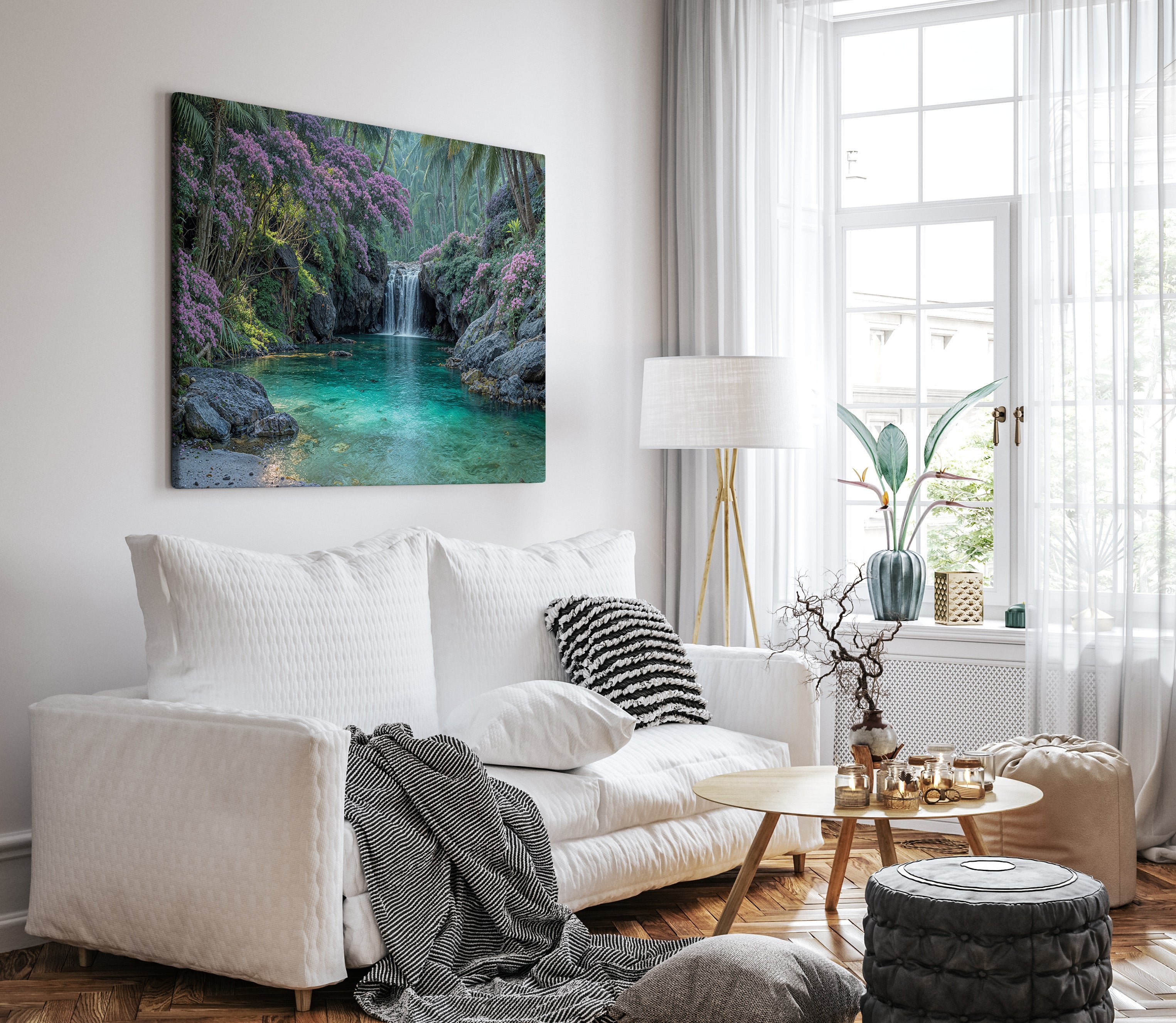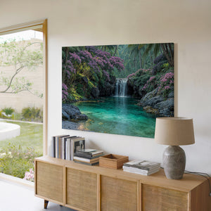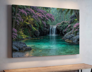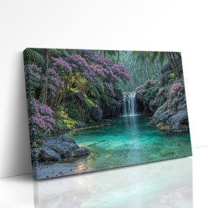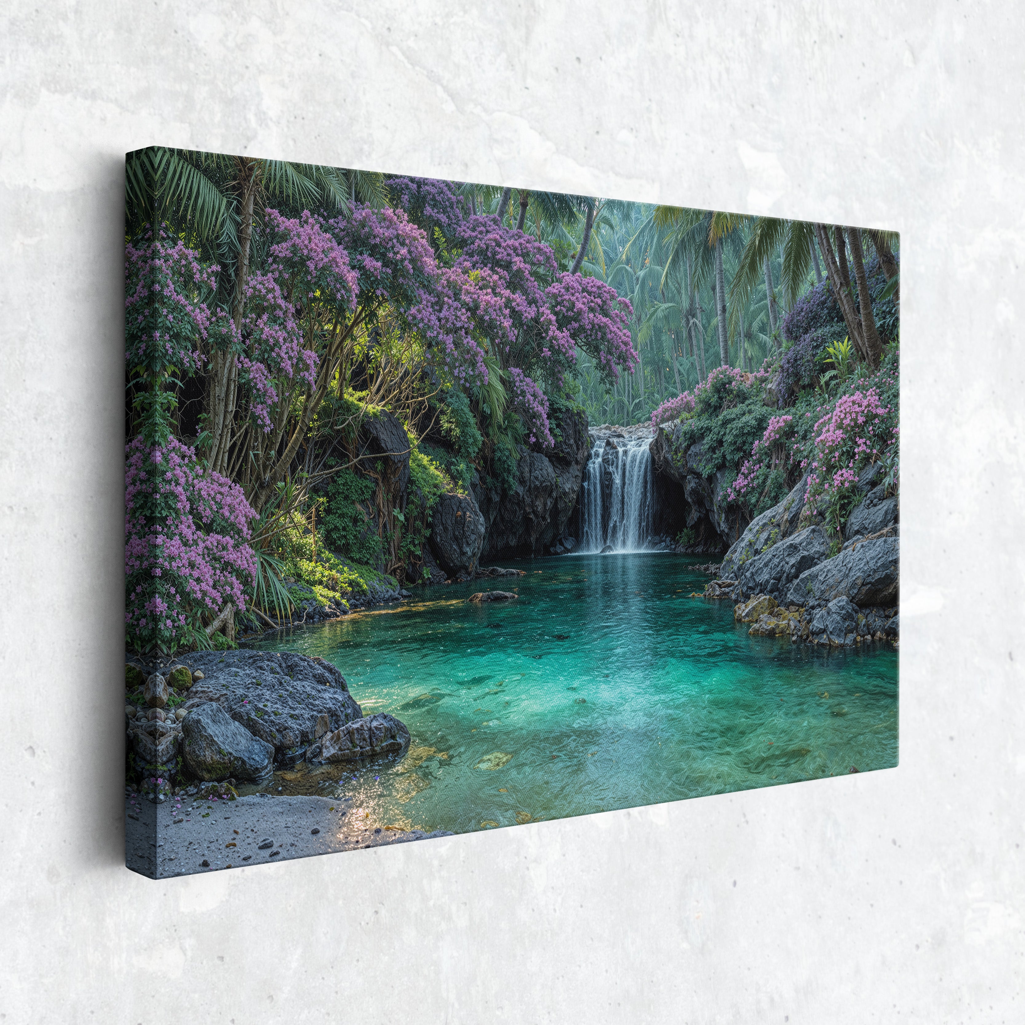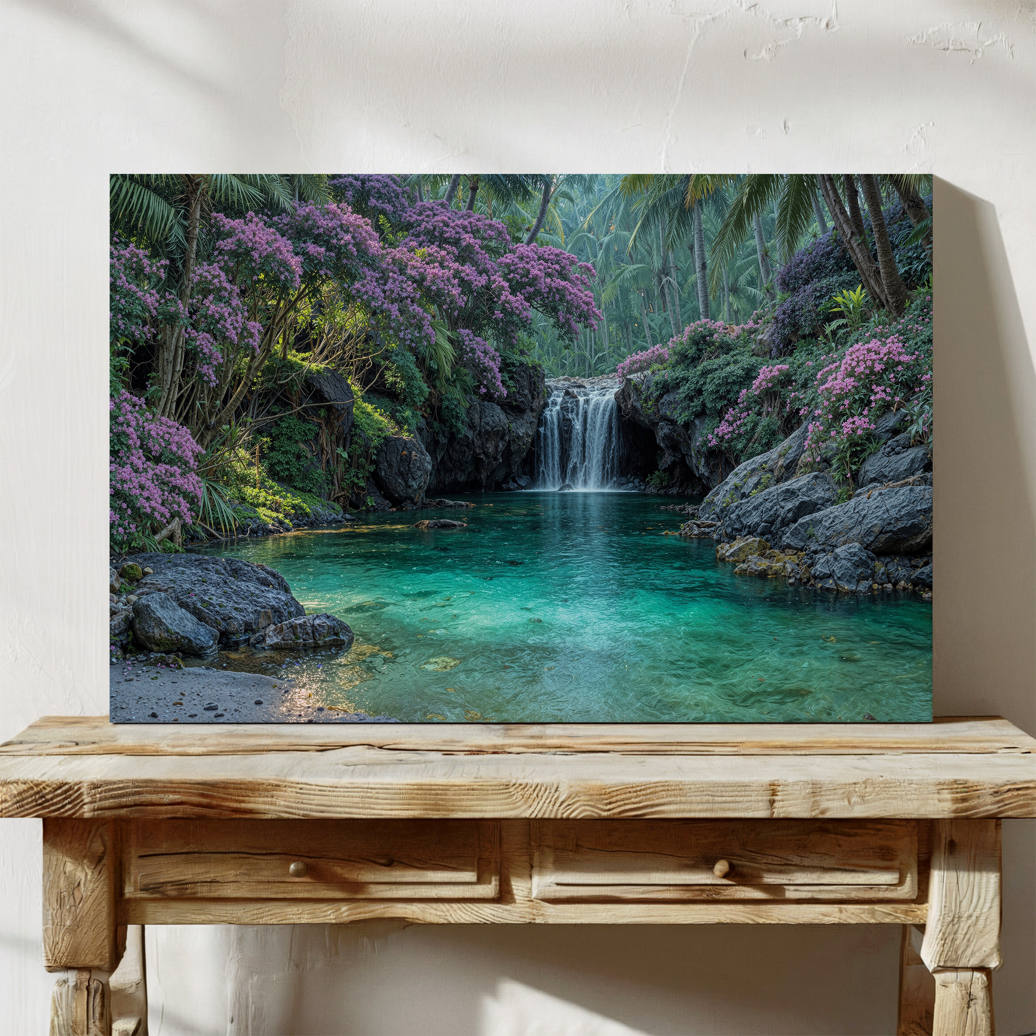 Escape to a hidden paradise with this vibrant tropical canvas print, featuring a crystal-clear waterfall surrounded by lush greenery and blooming pink flowers. The turquoise lagoon and exotic palm grove set a tranquil scene perfect for daydreamers and nature lovers alike. This gallery wrapped canvas brings peace, color, and a touch of island magic to any space. Ideal for beach homes, spa-inspired interiors, or anyone seeking serene tropical wall decor with a floral flair.