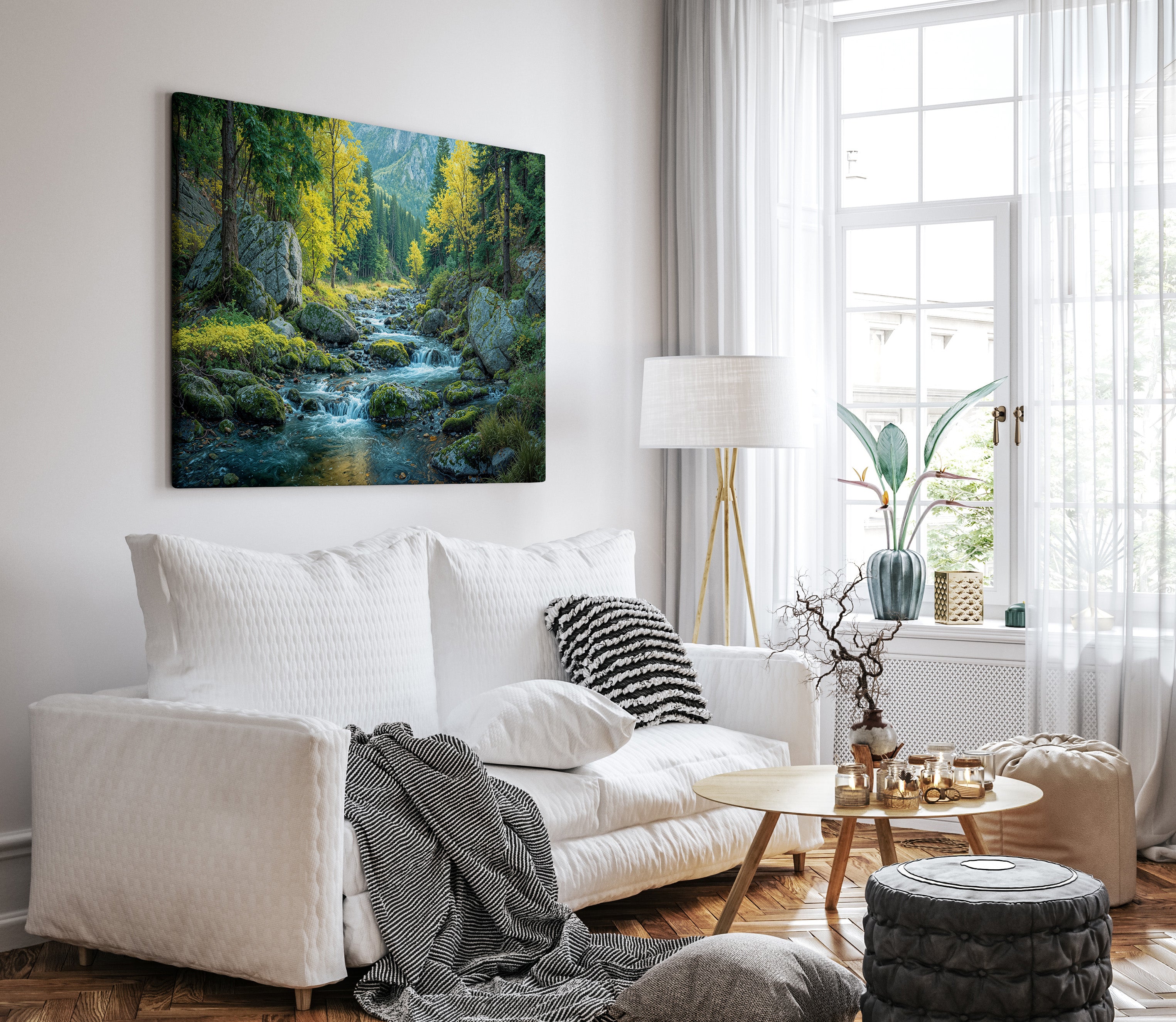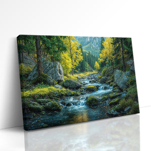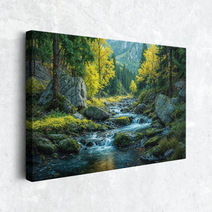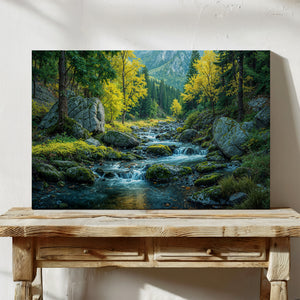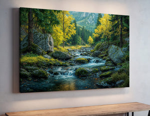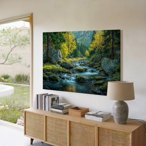 "Ripples Through an Emerald Dream" captures the tranquil flow of a mountain stream weaving through moss-covered rocks and golden autumn trees. Set against a backdrop of pine forests and distant peaks, this image evokes both serenity and wild beauty. A perfect piece of wall decor for lovers of the outdoors, this canvas print brings the essence of nature into your space. Ideal for rustic interiors, nature-themed rooms, or anyone seeking a calming escape, it adds depth and character to your home decor.