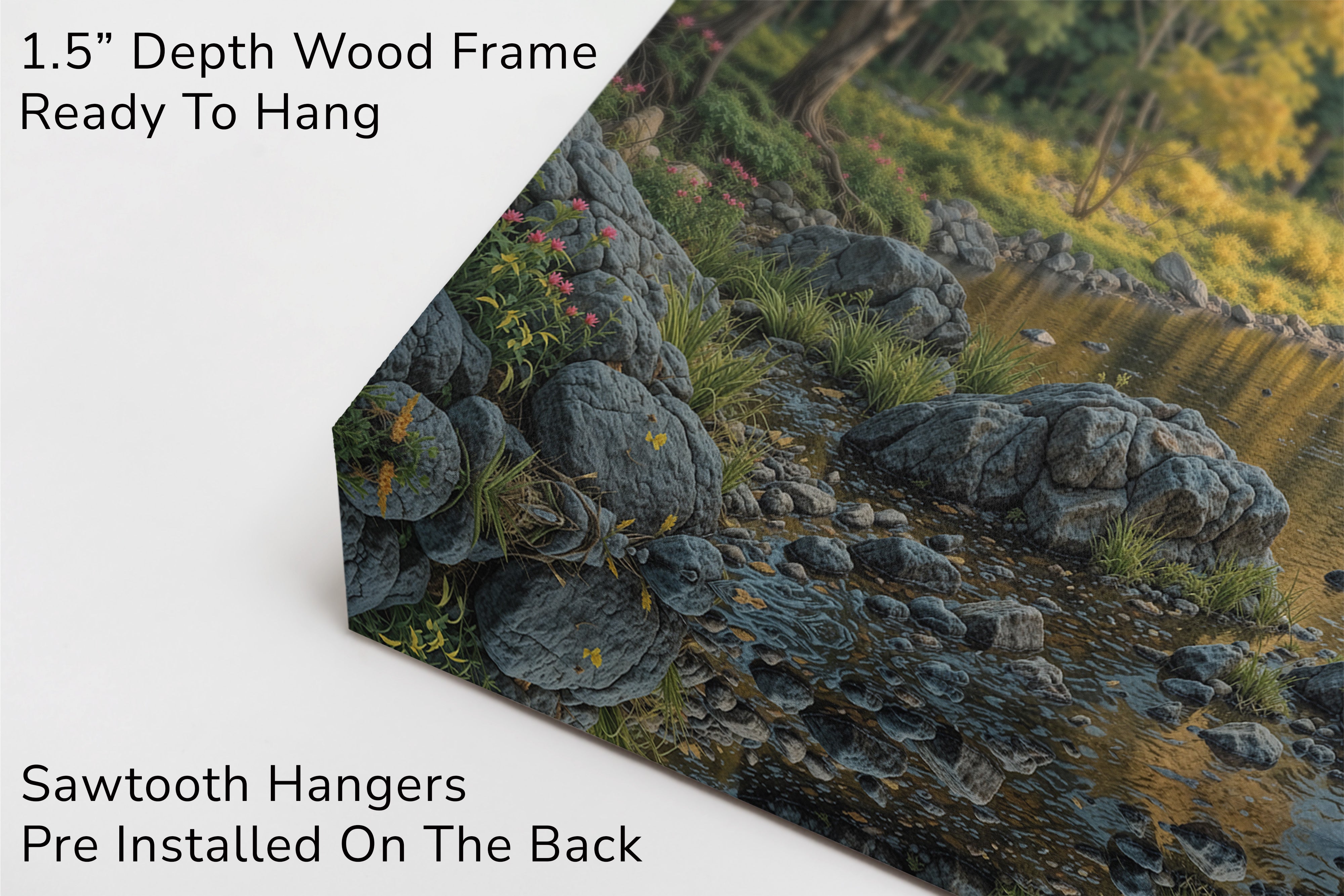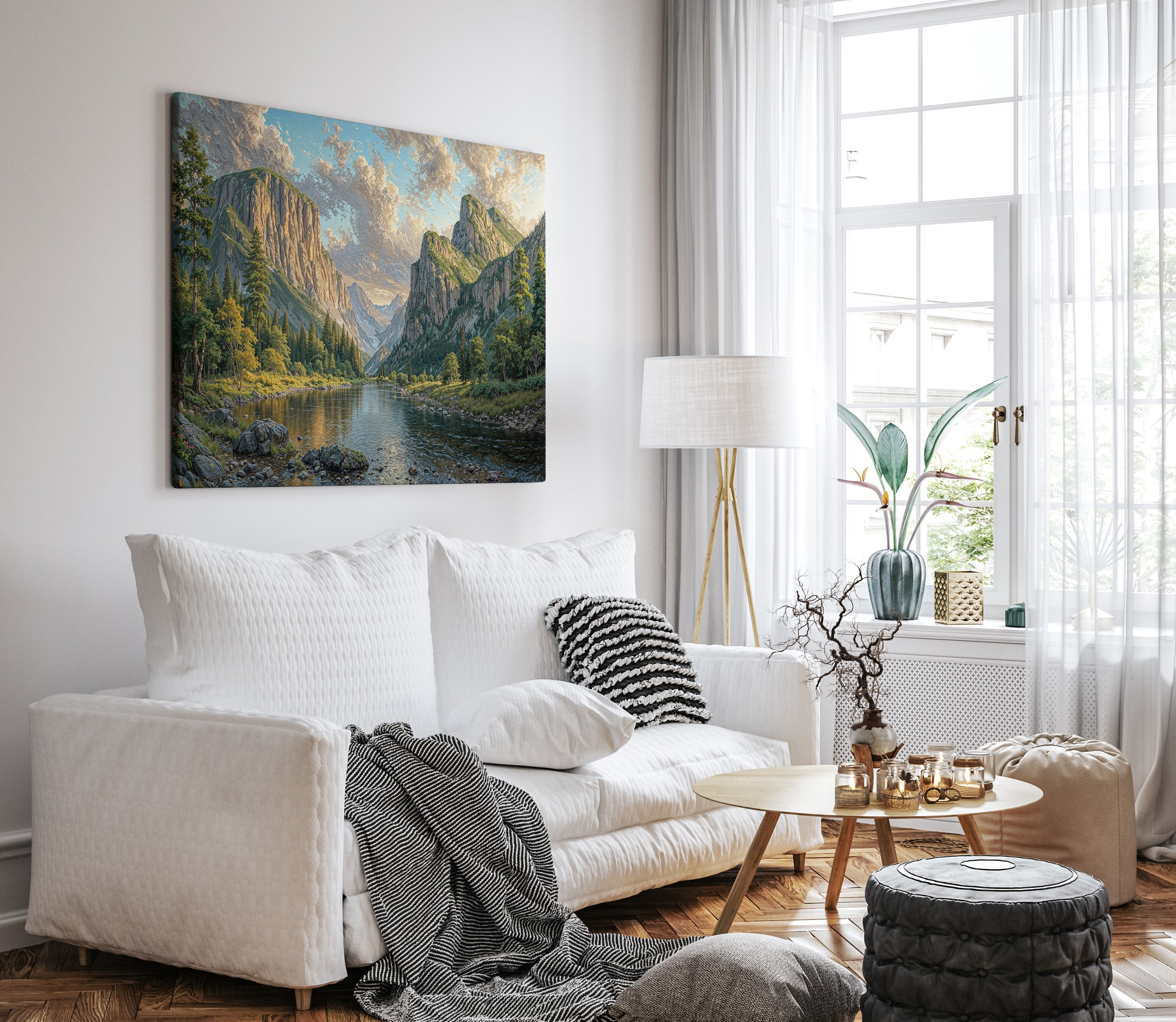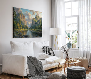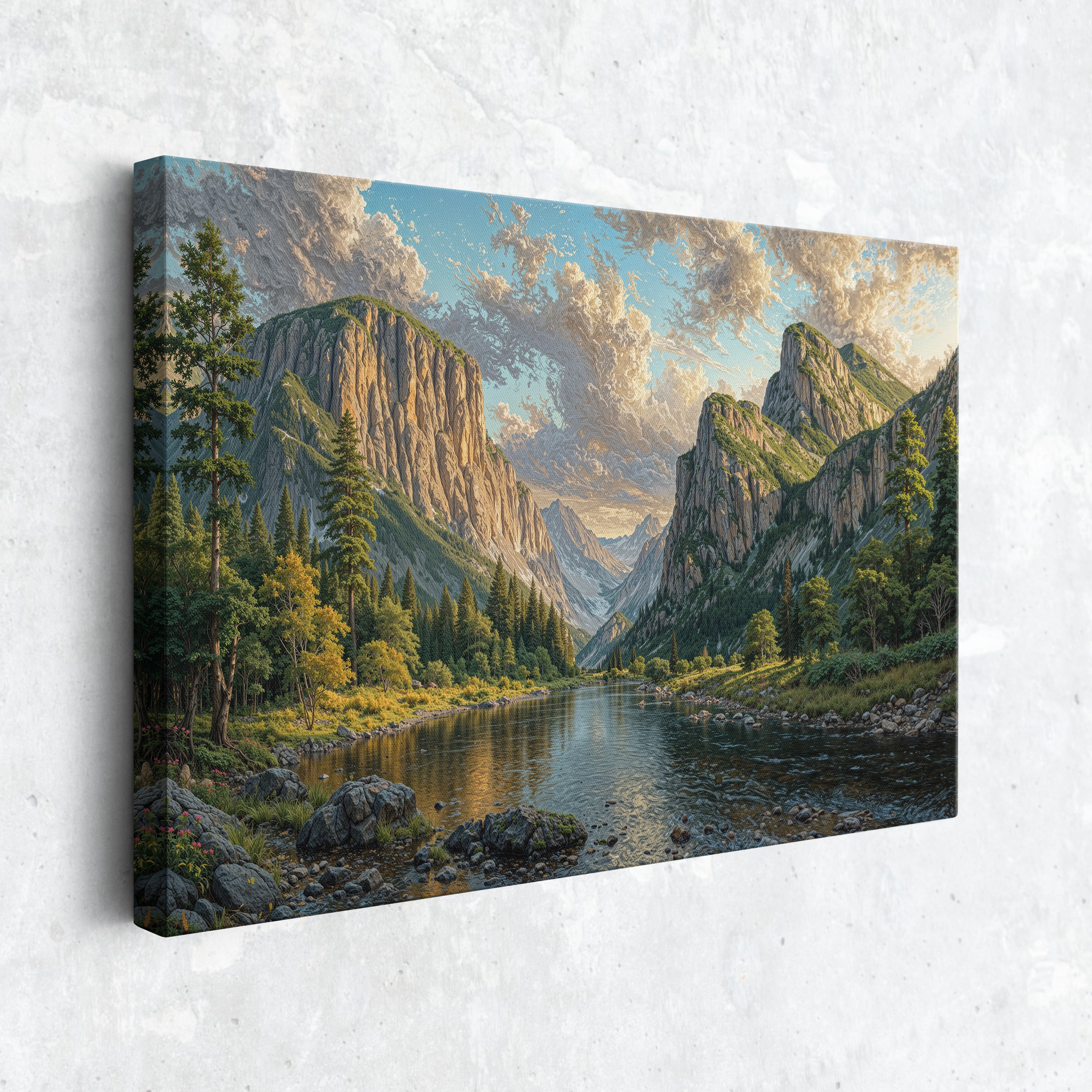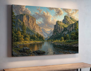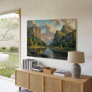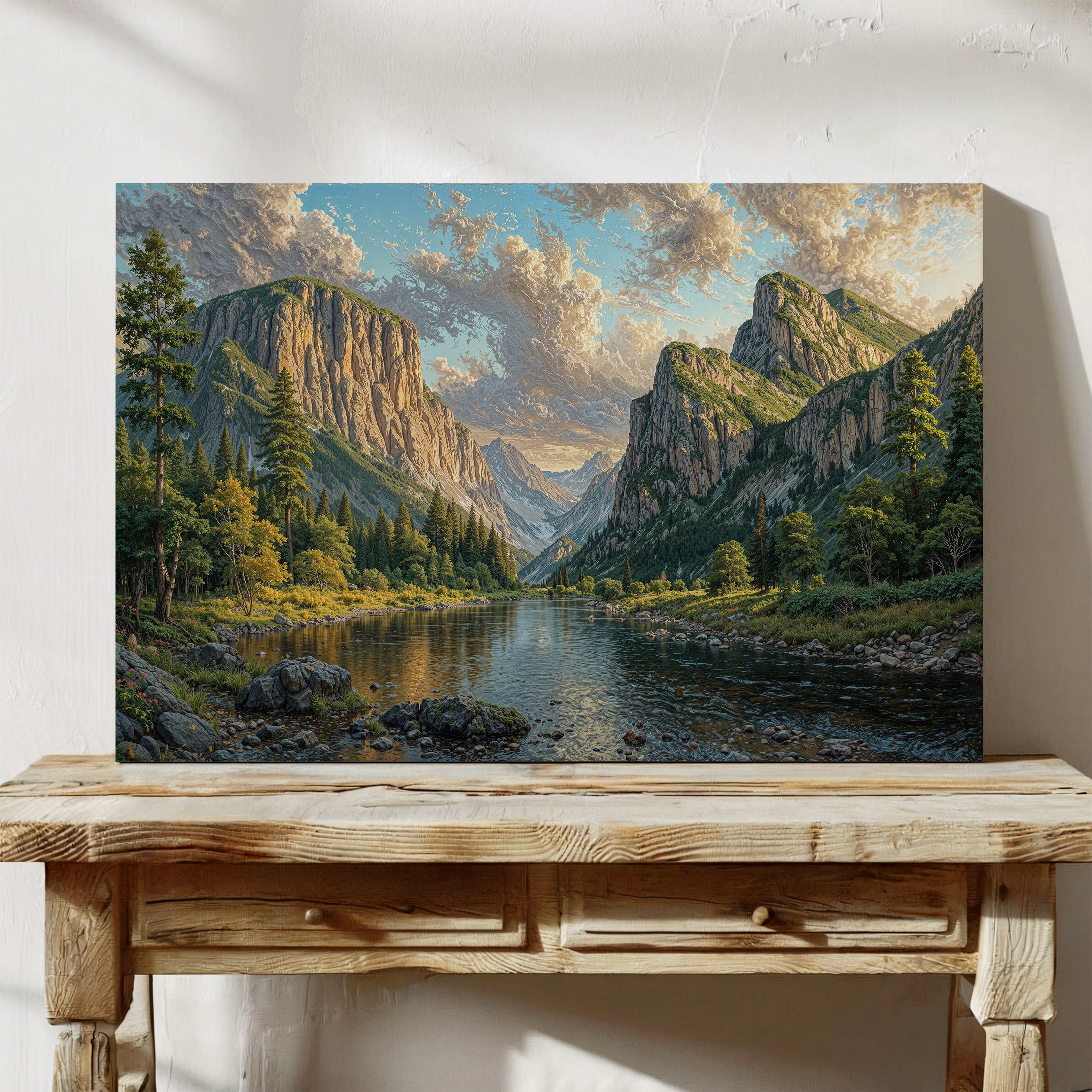 "The Valley of Painted Silence" captures a golden hour scene where sunlight bathes majestic cliffs and calm waters in warm hues, beneath a sky rippling with textured clouds. This tranquil mountain river landscape radiates serenity and grandeur, evoking the stillness of untouched wilderness. Ideal for nature lovers and outdoor dreamers, this artwork brings a sense of wonder and peace to any space. A perfect choice for those seeking canvas wall art that feels both majestic and meditative.