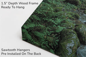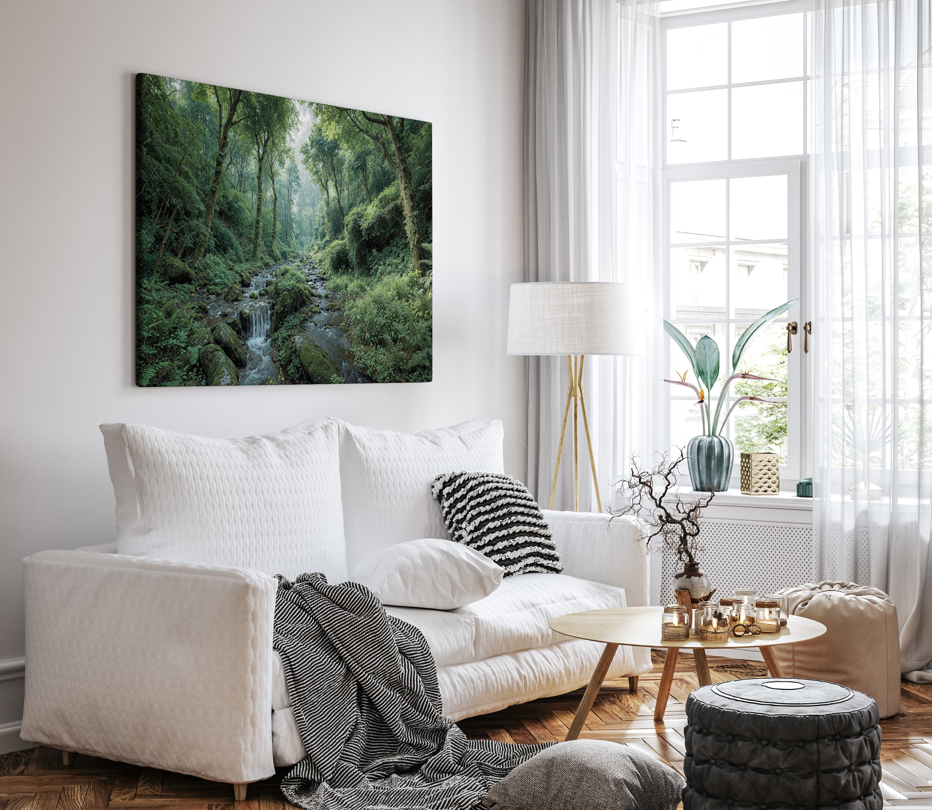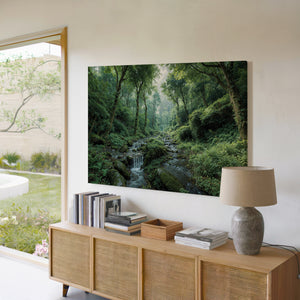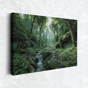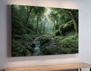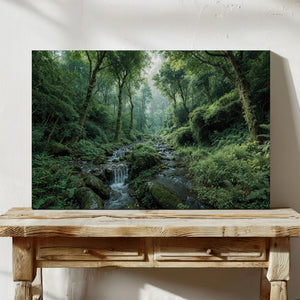 "Veil of the Woodland Cascade" invites you into a lush forest sanctuary, where a quiet stream winds gently through mossy stones beneath a canopy of vibrant green. Dappled light filters through the trees, casting a soft glow on the water as it cascades in delicate tiers over timeworn rocks. This tranquil canvas print is ideal for creating a calming atmosphere in your home decor. A stunning choice for nature lovers, meditation rooms, or anyone seeking a peaceful reminder of the natural world’s quiet magic.