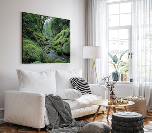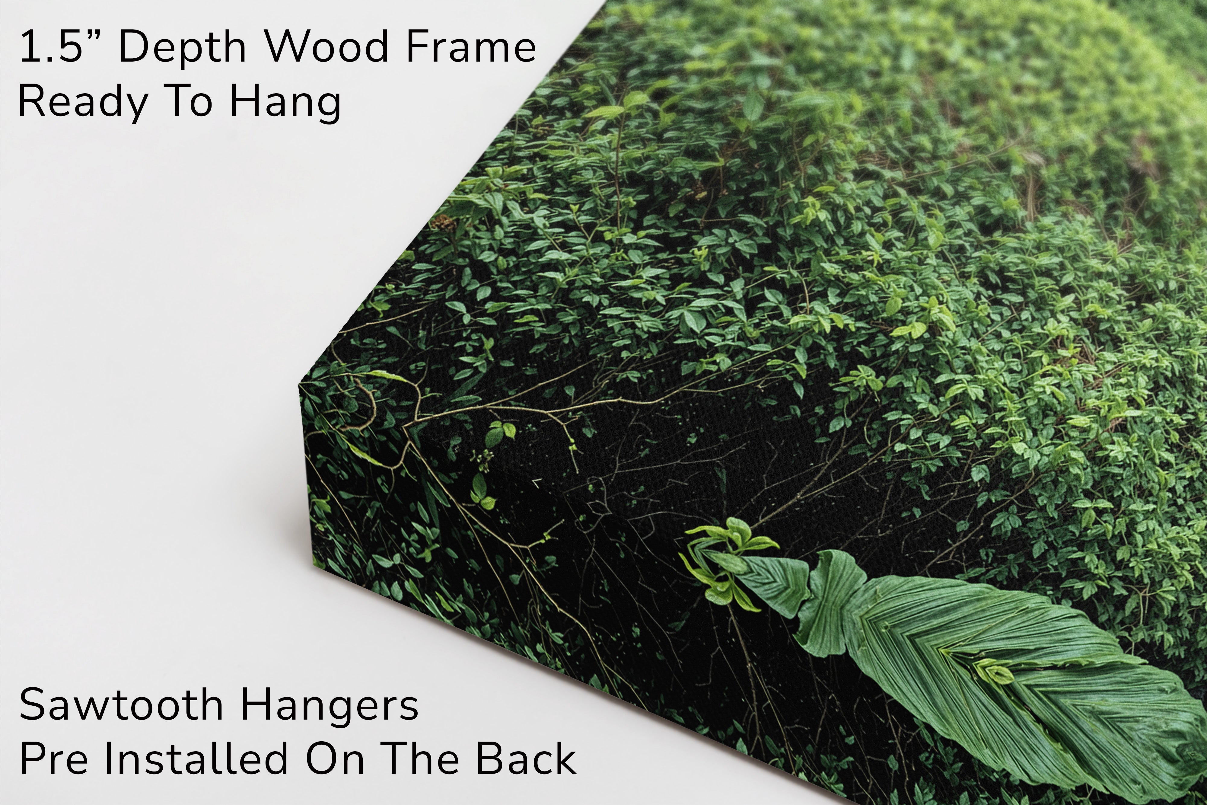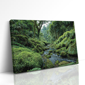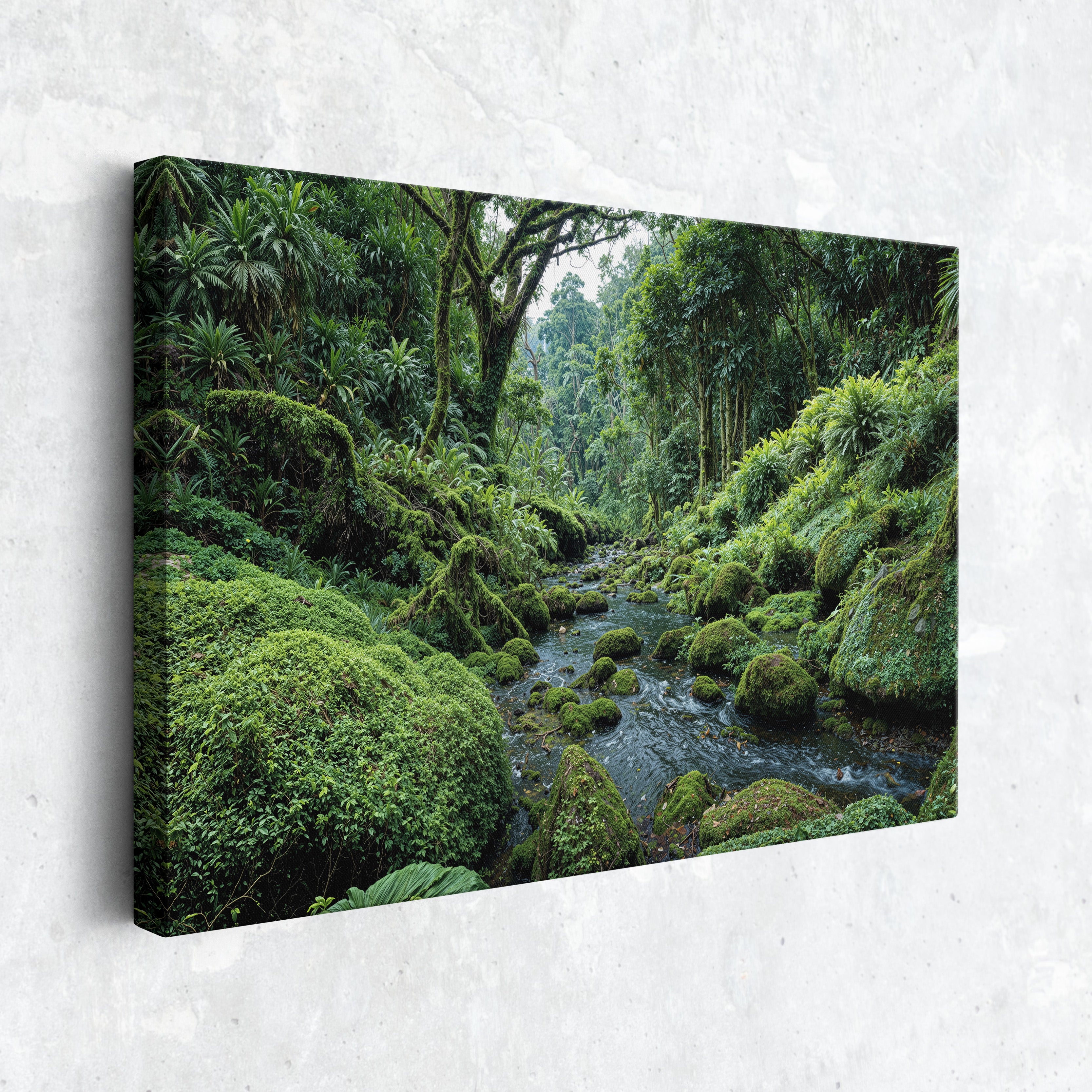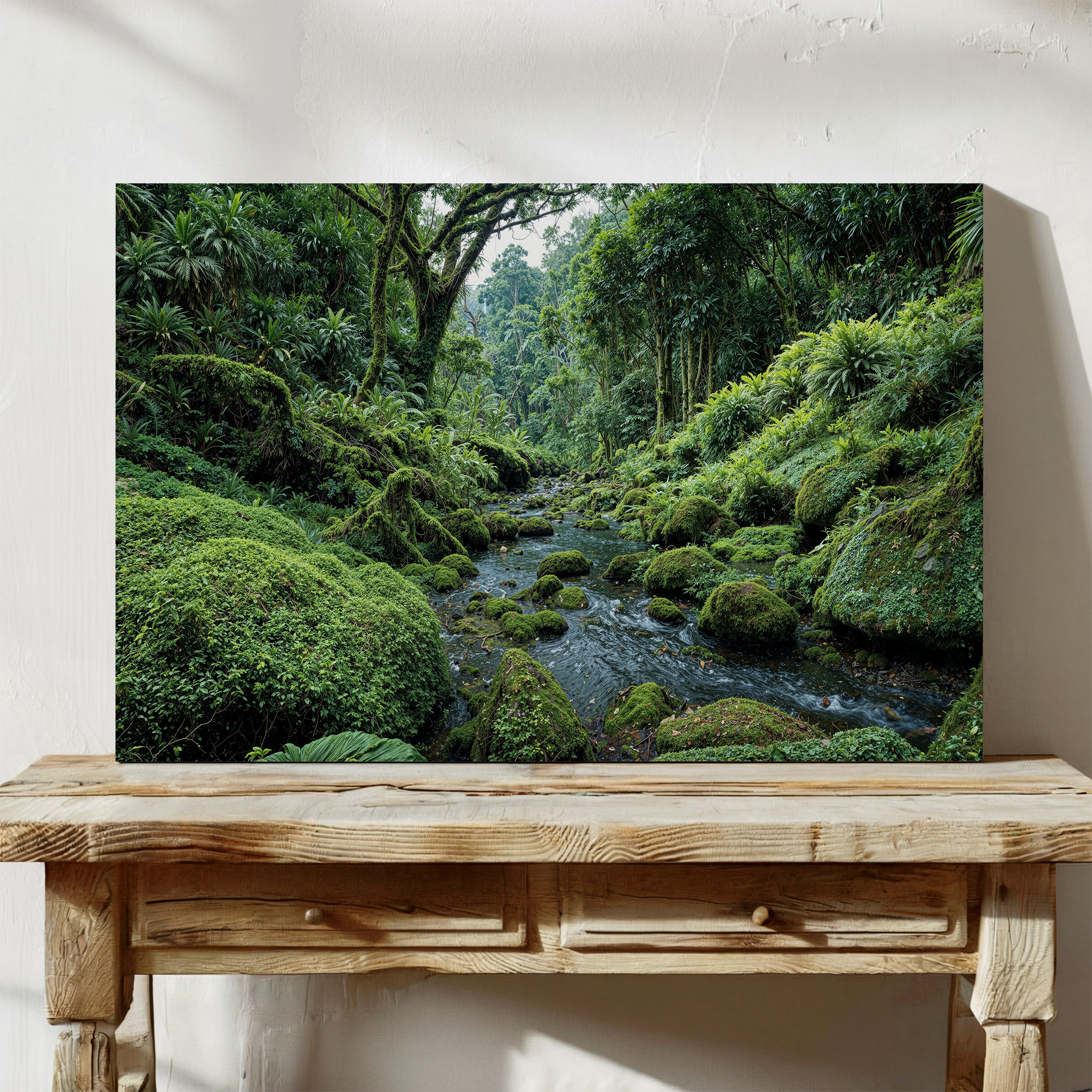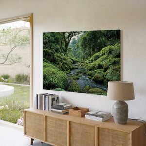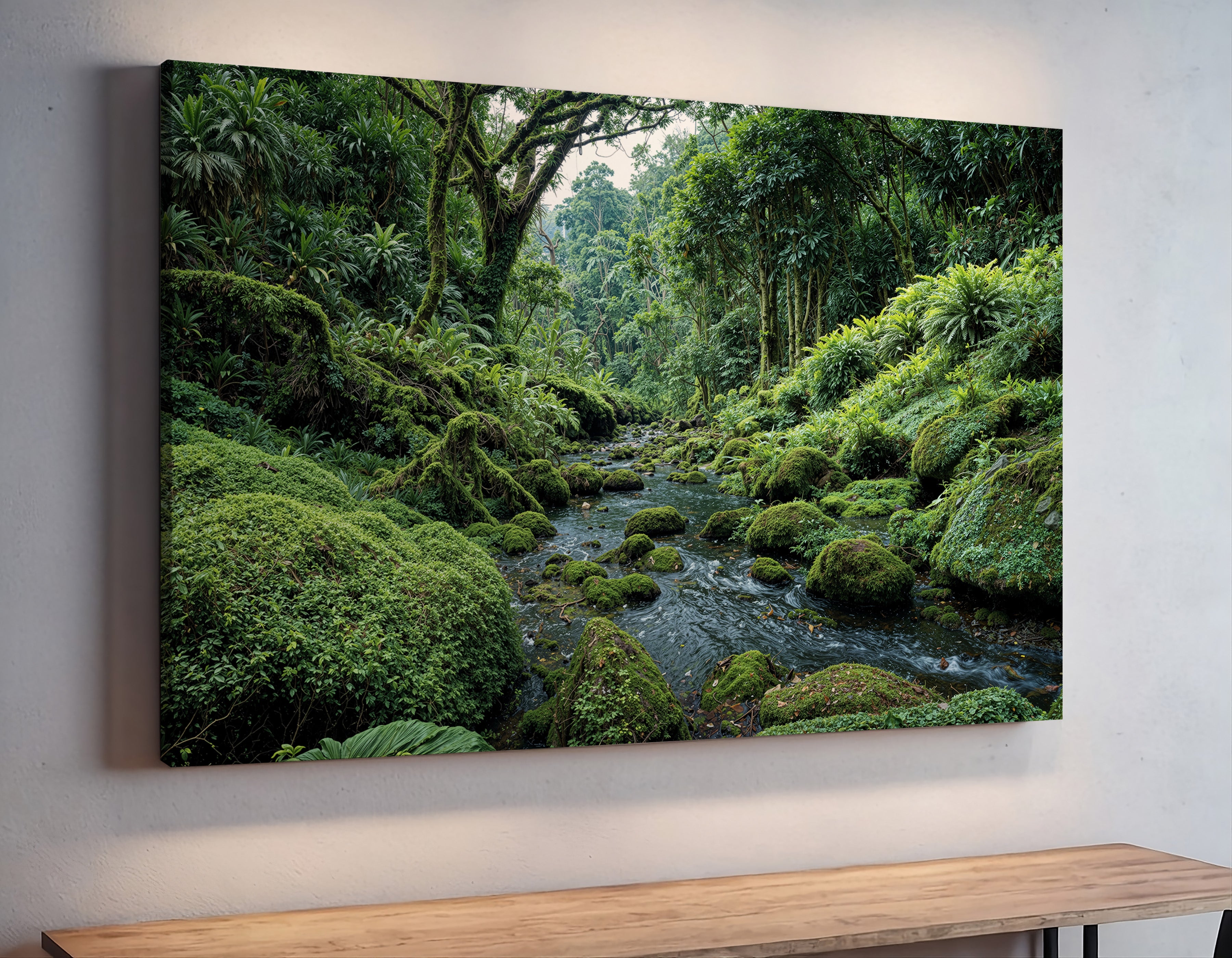 "Verdant Sanctuary of Still Waters" transports you to a lush rainforest where moss-covered stones and rich tropical foliage cradle a serene jungle stream. This breathtaking artwork captures the deep tranquility of untouched nature, offering a sense of peace and grounding. Perfect for creating a calming atmosphere in any room, this gallery wrapped canvas print blends vibrant greens and gentle motion for a striking natural accent. A timeless choice for nature lovers and anyone seeking restorative wall decor.