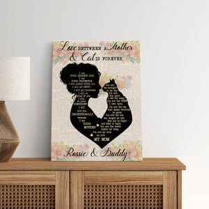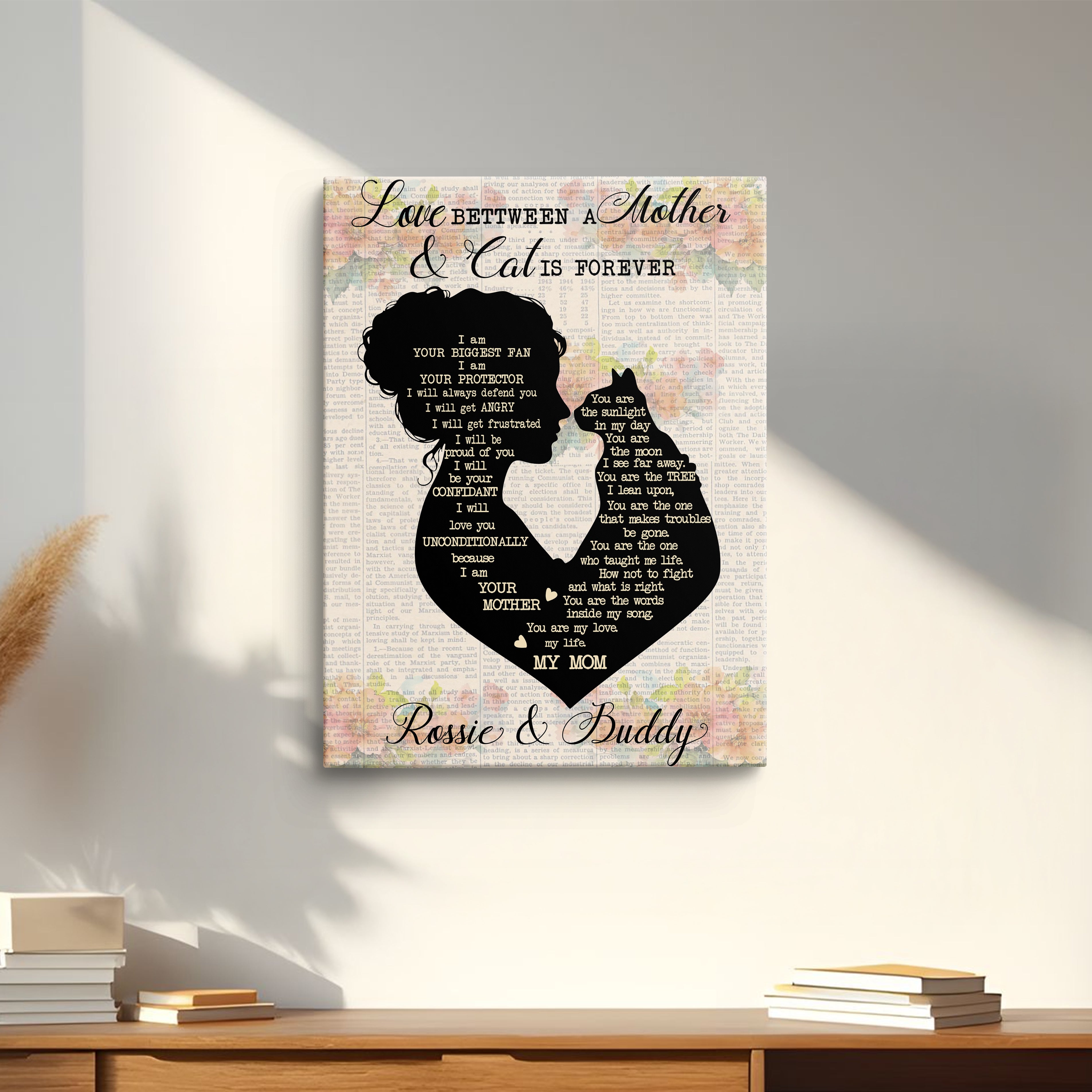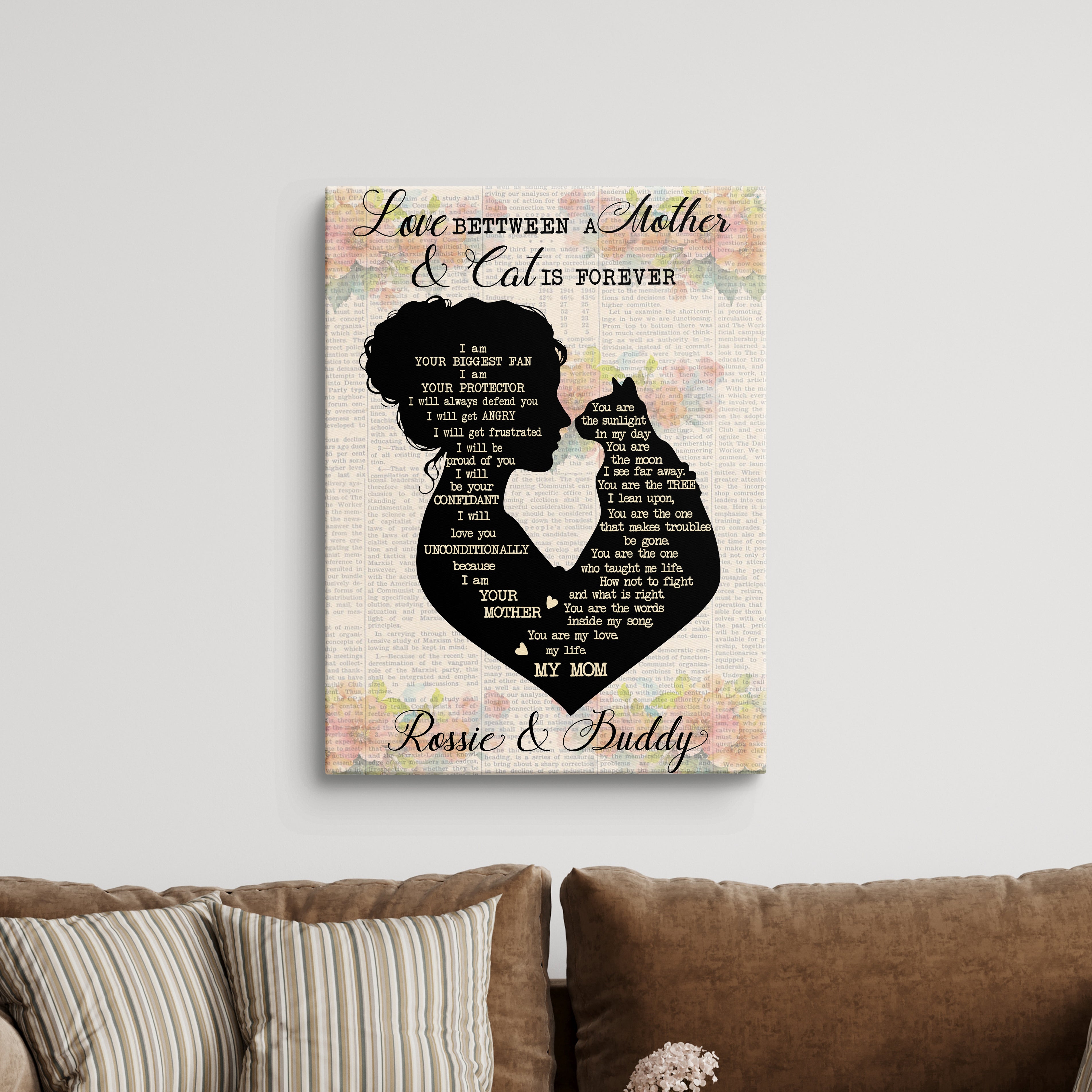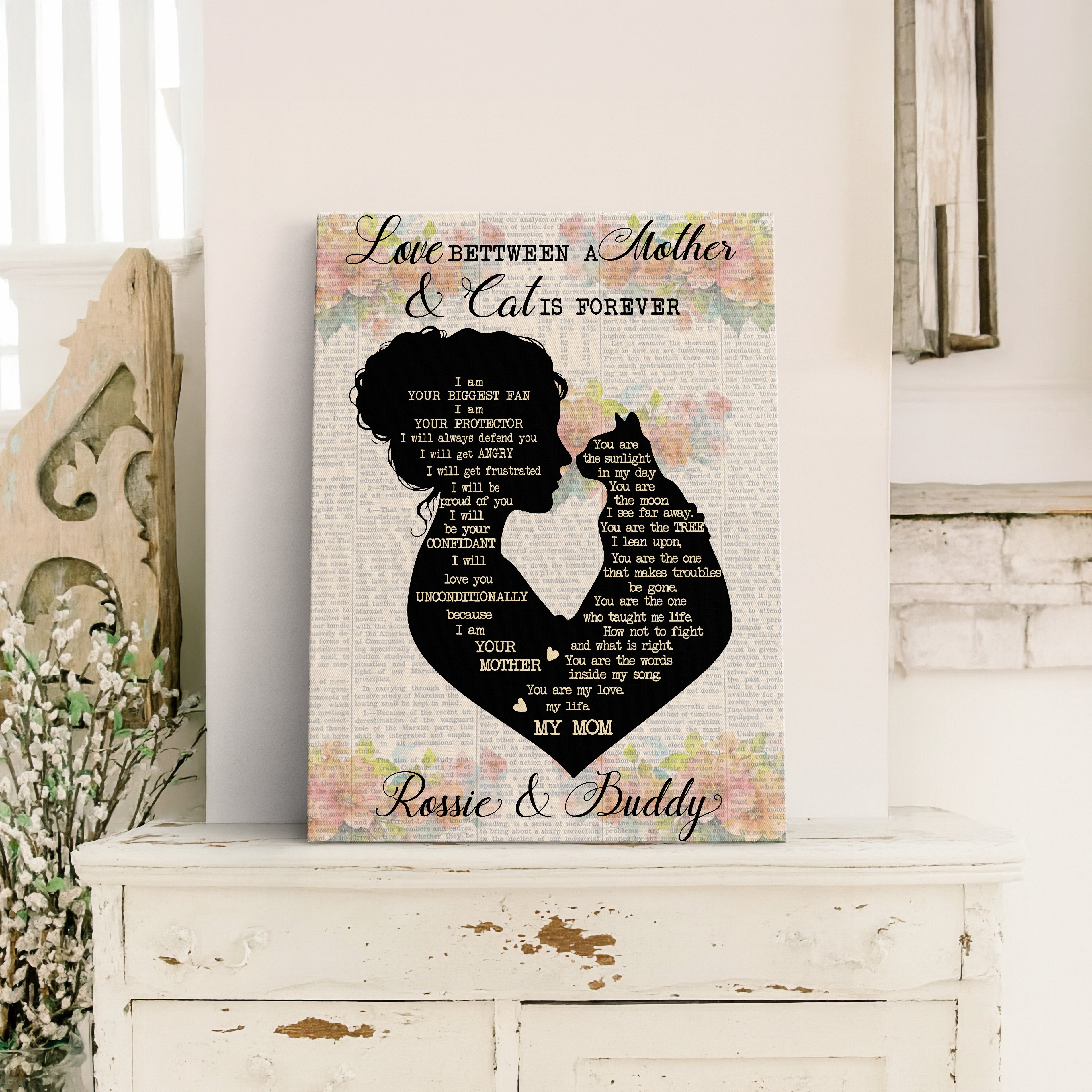 This personalized gift for a cat lover is a thoughtful way to celebrate a special occasion. Perfect as a mom birthday gift or cat mom present, it features a custom cat silhouette canvas print with charming detail. A fun and heartfelt cat print for the crazy cat lady in your life, and a wonderful keepsake for any pet lover.