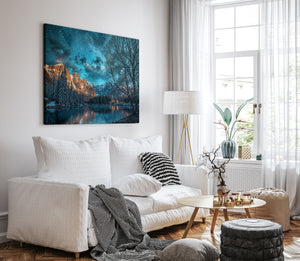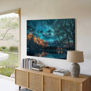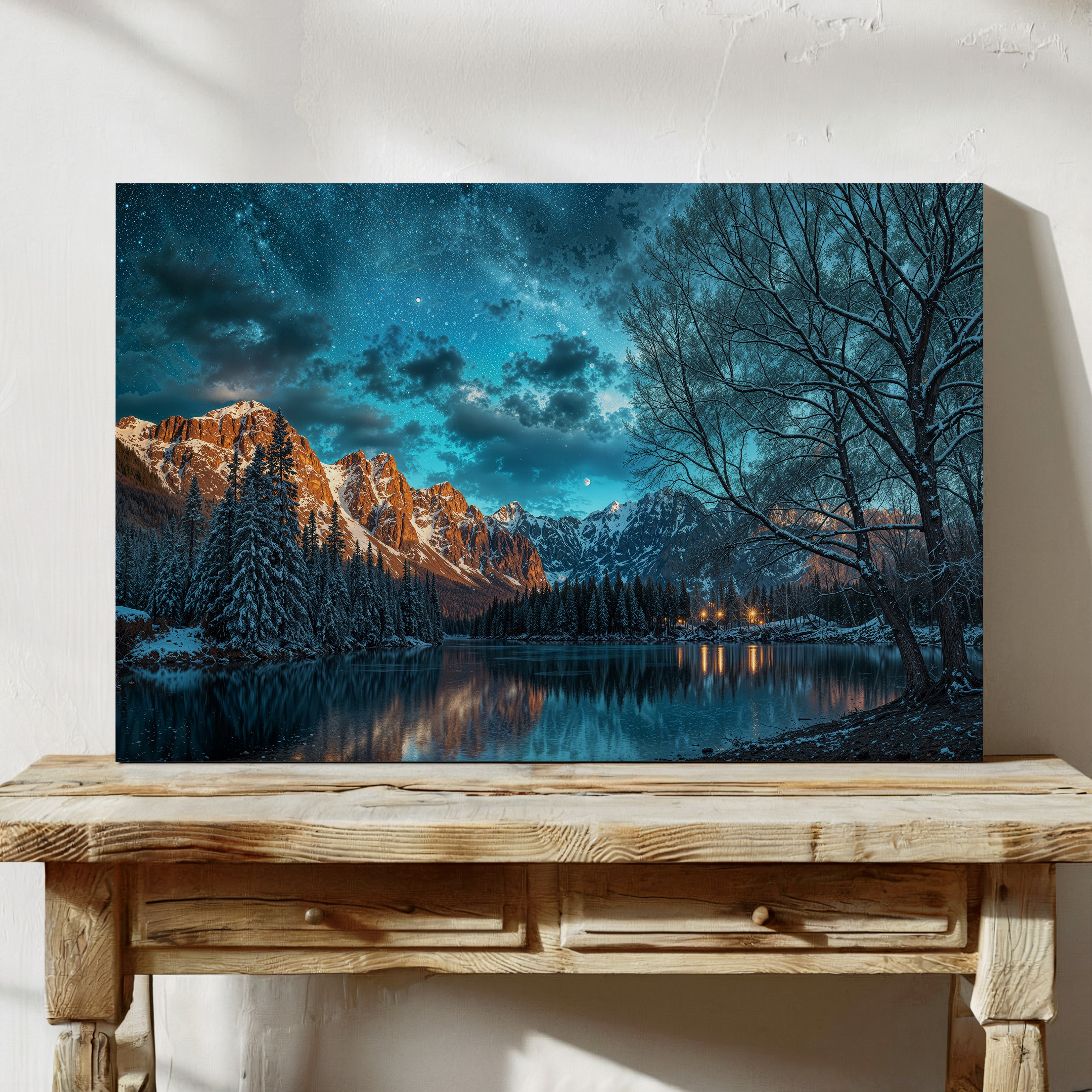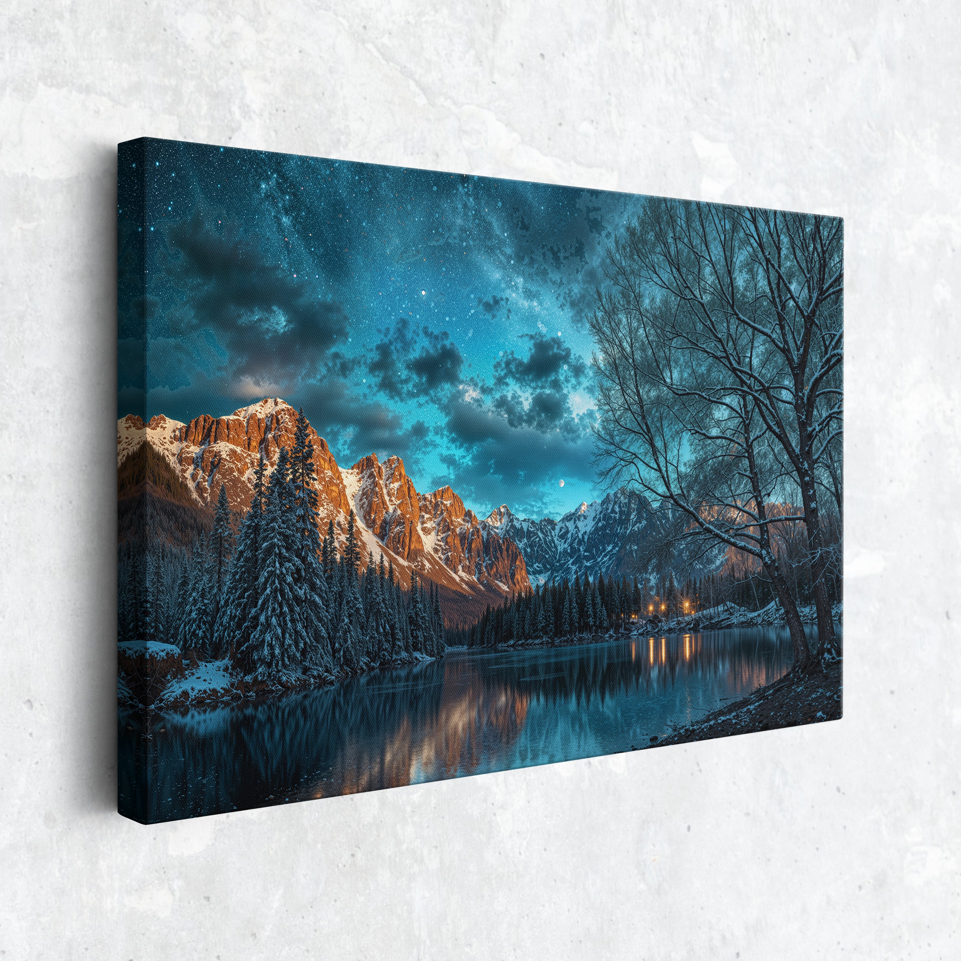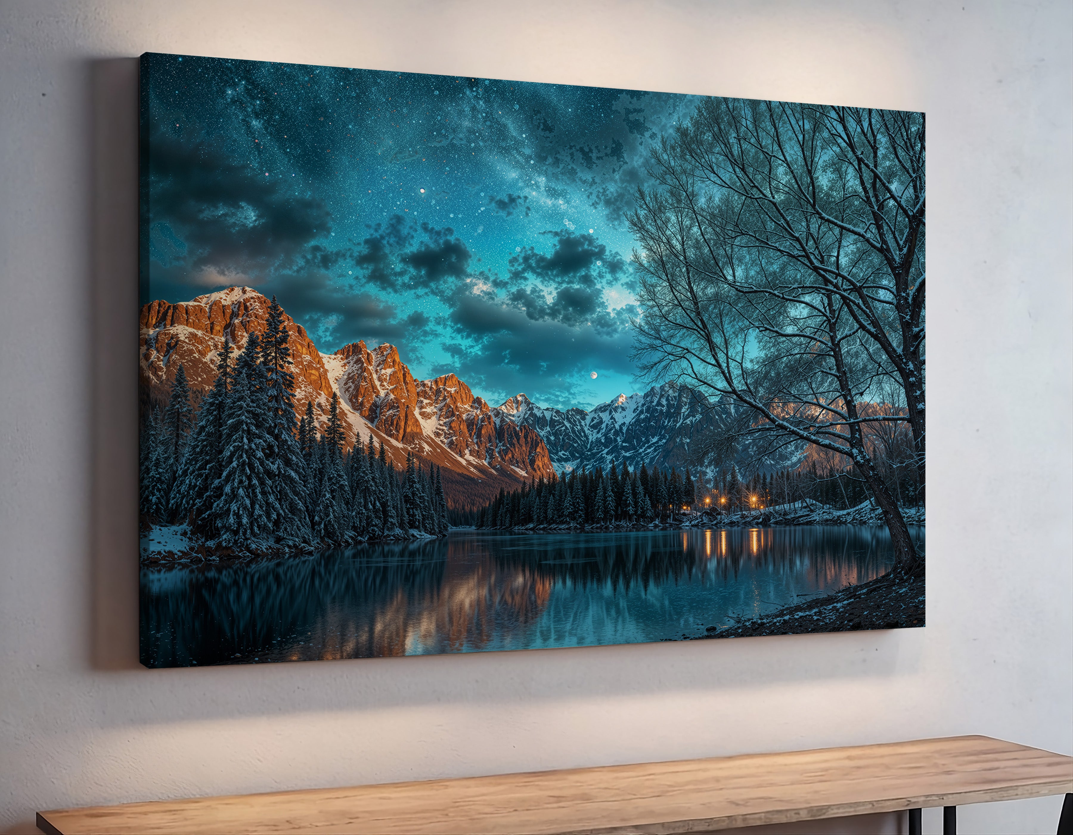 Add a touch of magic to your home decor with this breathtaking canvas print of a moonlit mountain lake under a vivid star-filled sky. Snow-dusted pines line the shore, while towering peaks reflect in the icy stillness of the water. With its mix of glowing lights, rich shadows, and celestial details, this artwork evokes the quiet wonder of winter nights in the wilderness. A perfect piece of wall art for cabin decor, stargazers, and lovers of alpine landscapes, this gallery wrapped canvas brings serenity and inspiration to any room.