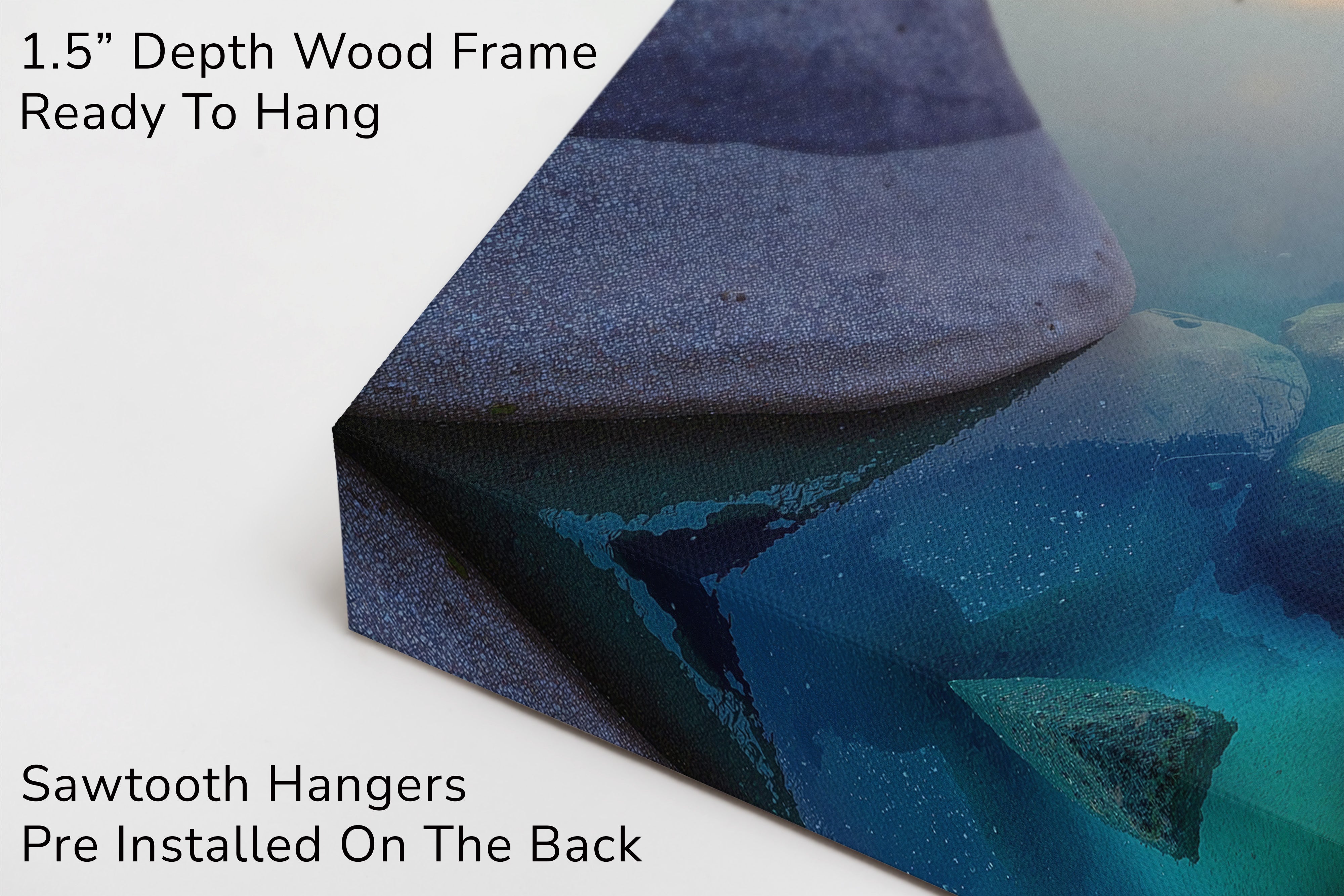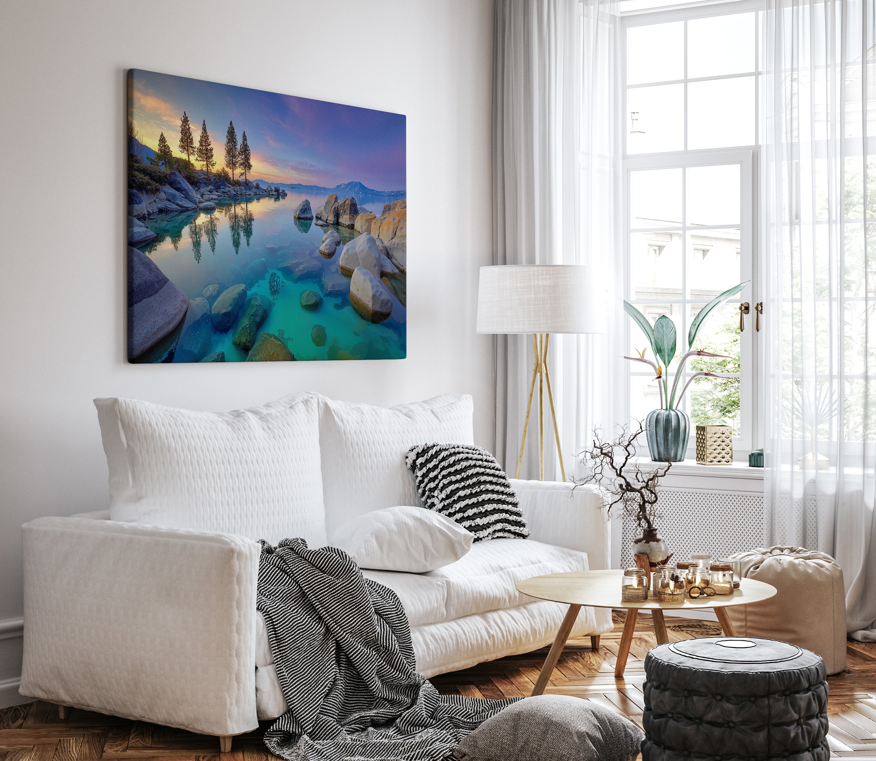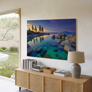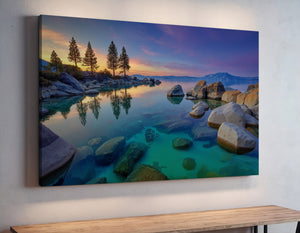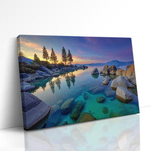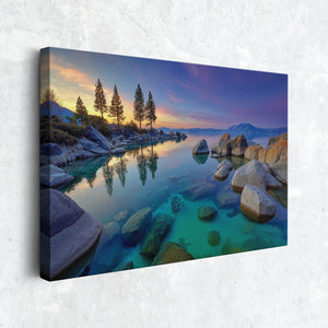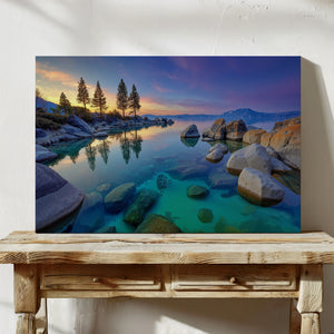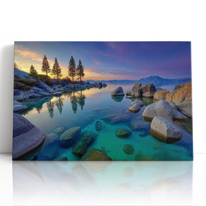 Capture the stillness of nature with this stunning canvas print featuring a serene alpine lake at dusk. Crisp boulders line the glowing shoreline while evergreens and mountains are mirrored in the crystal-clear water, evoking a sense of peaceful solitude. This gallery wrapped canvas print is perfect for lovers of tranquil landscapes and natural beauty. A breathtaking piece of home decor, it brings elegance and calm to any interior space and makes a thoughtful art print gift for special occasions.