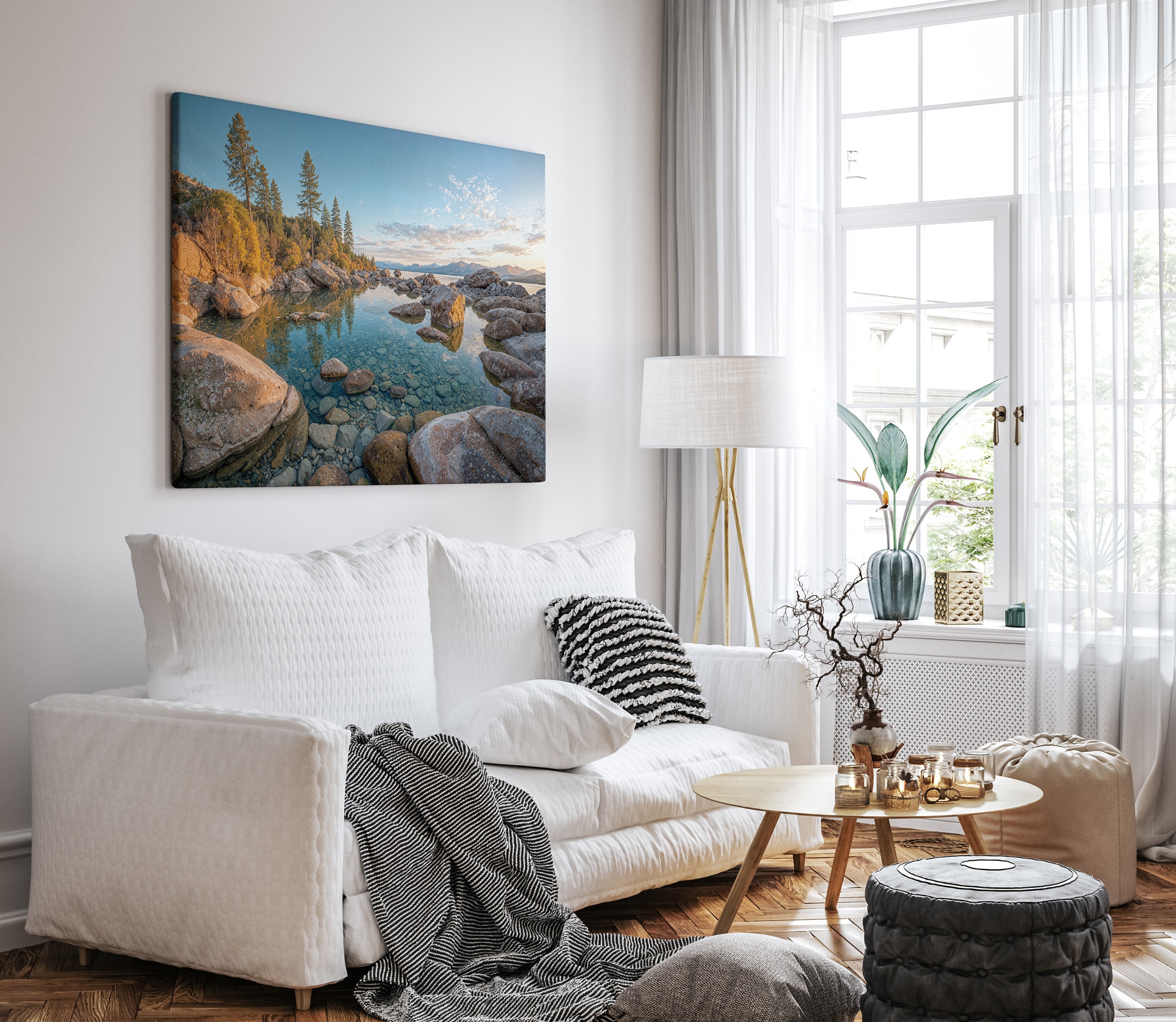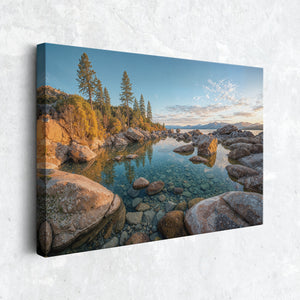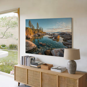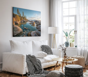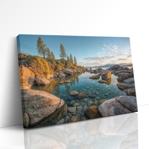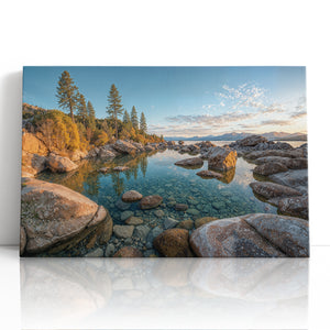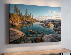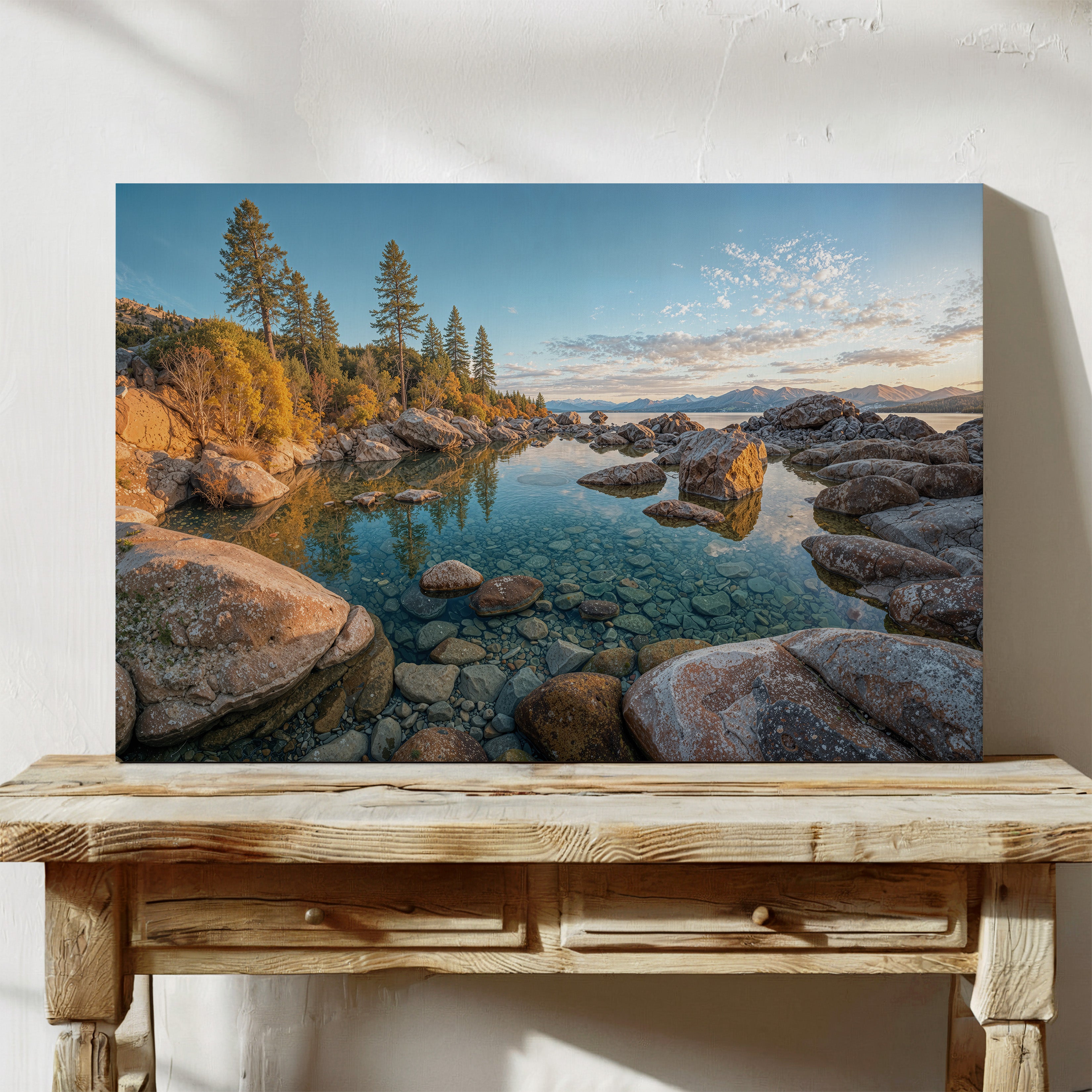 "Still Waters of the High Sierra" captures the crisp, clear serenity of a pristine alpine lake. Boulders rest quietly beneath the surface as the pine trees reflect in mirror-like waters, and the golden light of dawn kisses the rocky shoreline. Snow-capped mountains rise in the distance, anchoring the moment in timeless grandeur. This breathtaking canvas print brings the peaceful energy of the High Sierra into your space. Perfect for lovers of nature, mountain landscapes, and calming scenery — a striking piece of wall decor or a thoughtful housewarming gift.