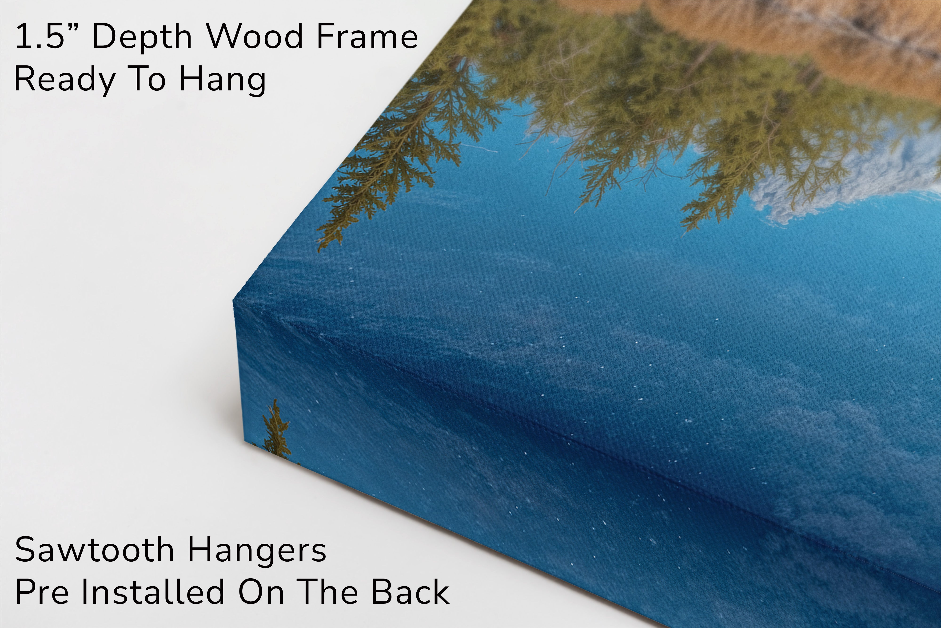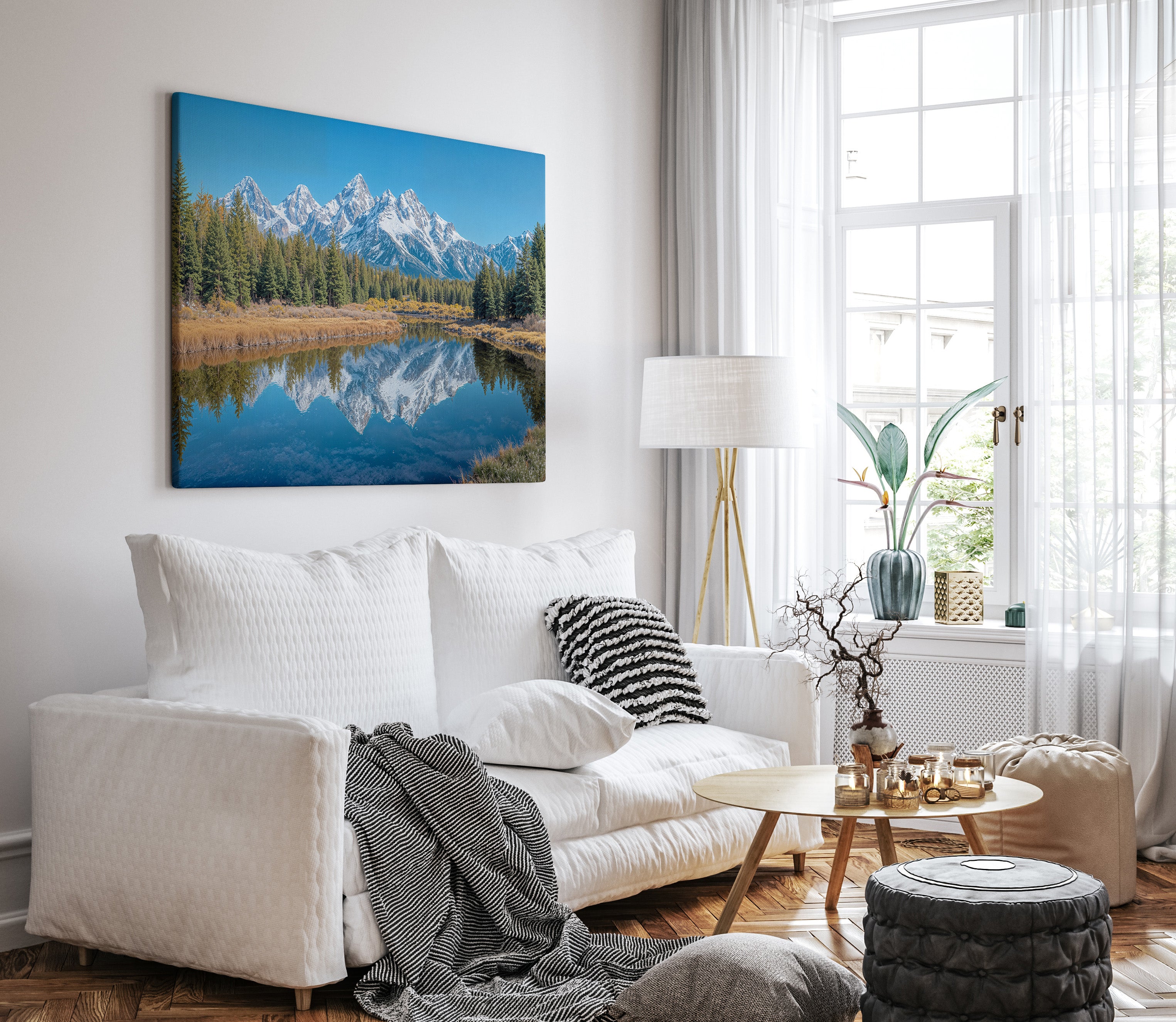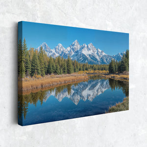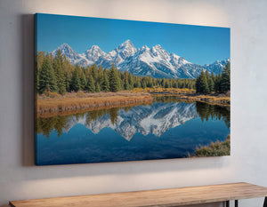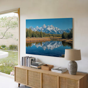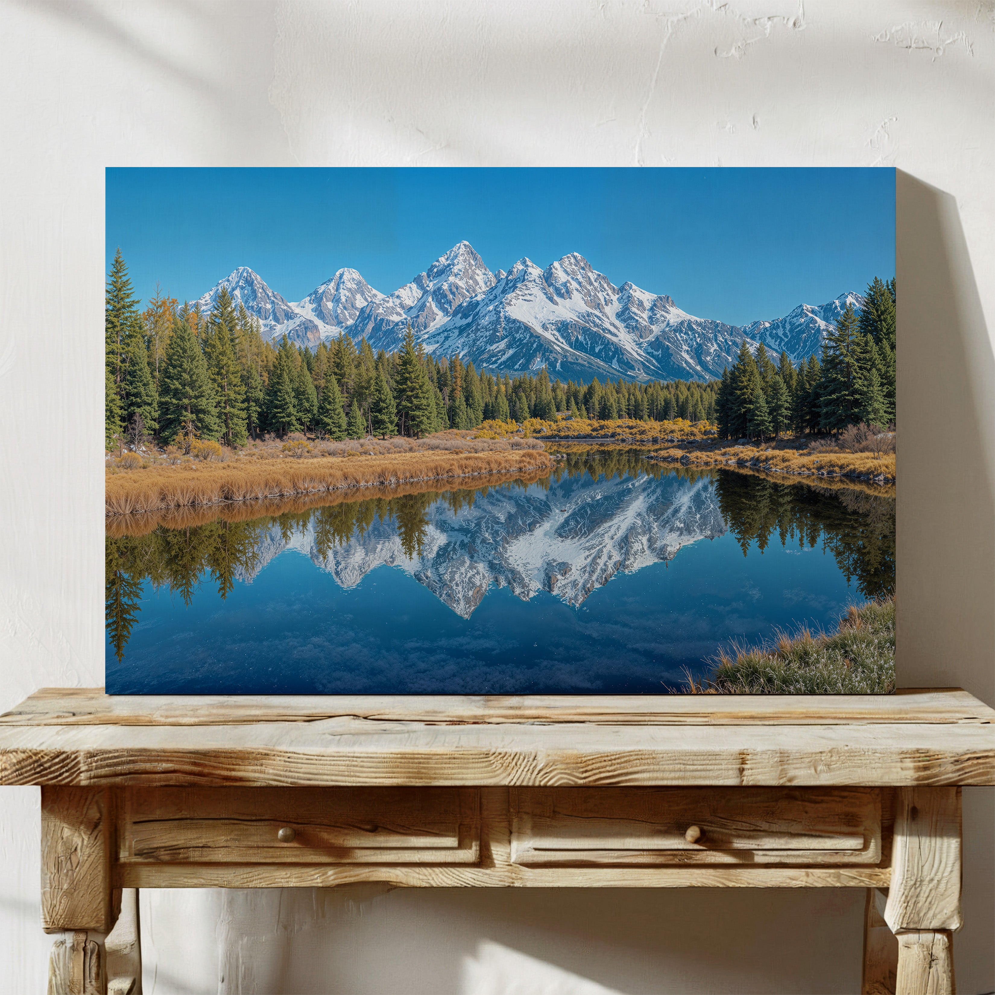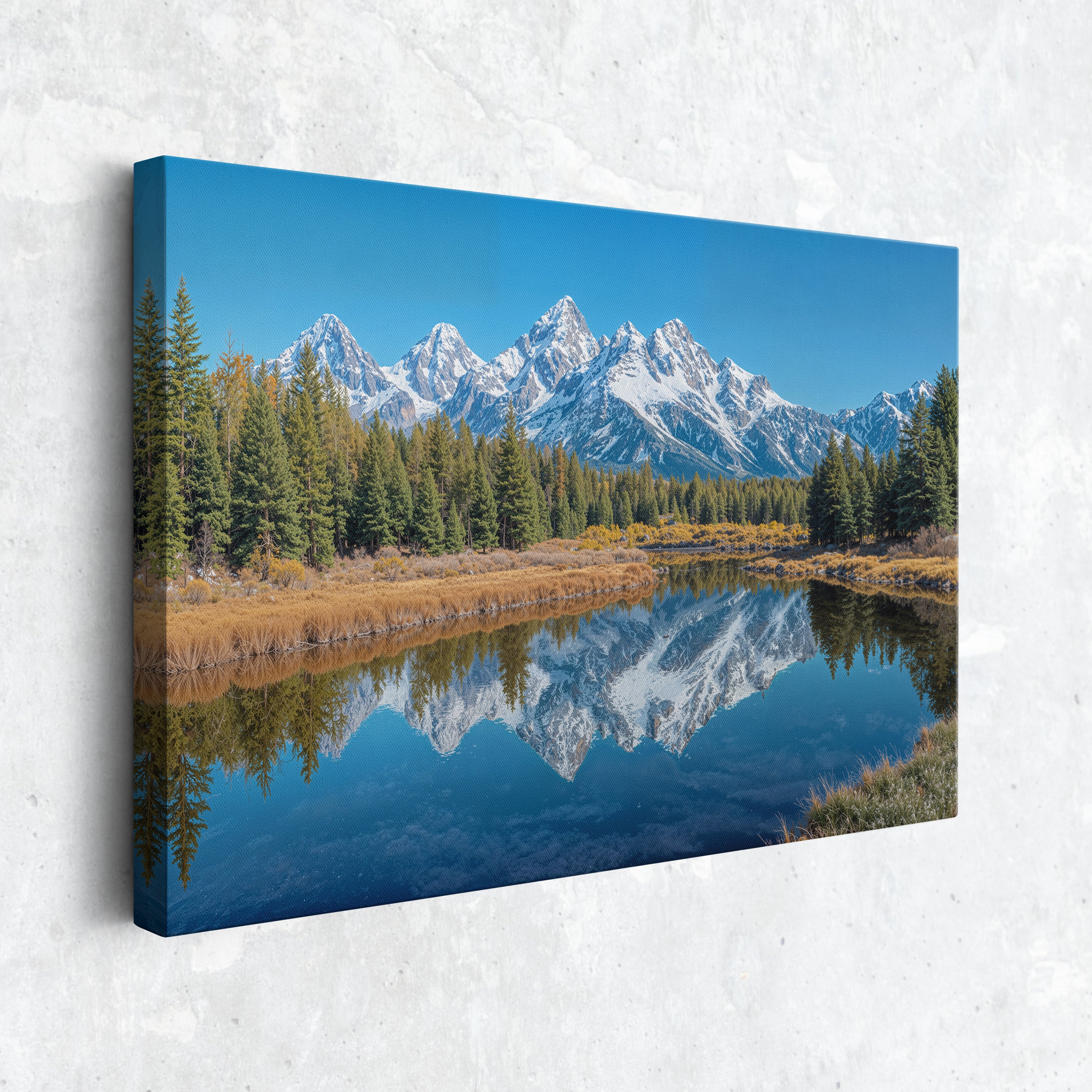 "The Mirror of Snow and Pines" captures the majestic symmetry of nature at its finest — a crystal-clear alpine pond reflecting the snow-capped peaks of the Teton Range beneath a bright blue sky. Framed by evergreens and golden brush, this serene mountain scene evokes both peace and grandeur. Perfect for lovers of winter landscapes and wilderness escapes, this gallery wrapped canvas print adds striking depth and clarity to any room. A beautiful piece of wall decor to transform your space with the stillness and wonder of nature.