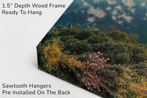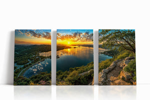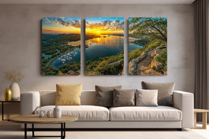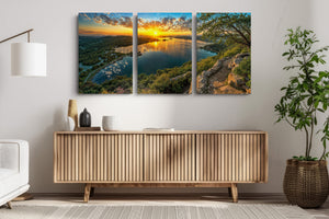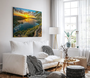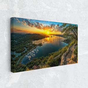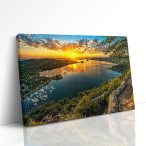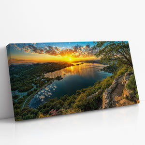 Bask in the radiant warmth of a golden sunset stretching across a tranquil lake. This scenic overlook captures the winding shoreline, lush forested hills, and distant mountains under a sky ablaze with light — all from a peaceful stone path beneath a lone tree. This canvas print invites serenity, adventure, and wonder into any space. Ideal for those who cherish nature’s beauty and the quiet moments before nightfall.