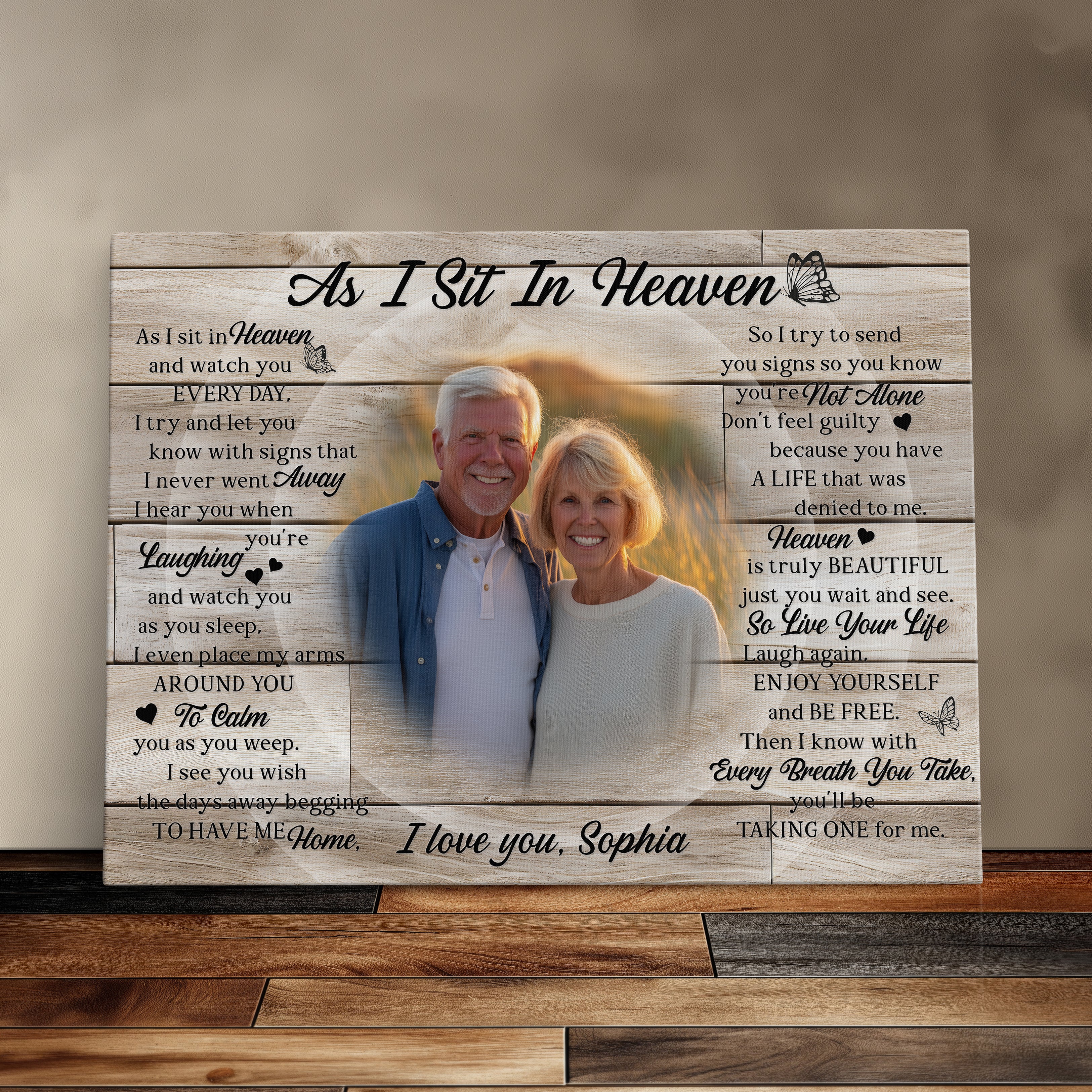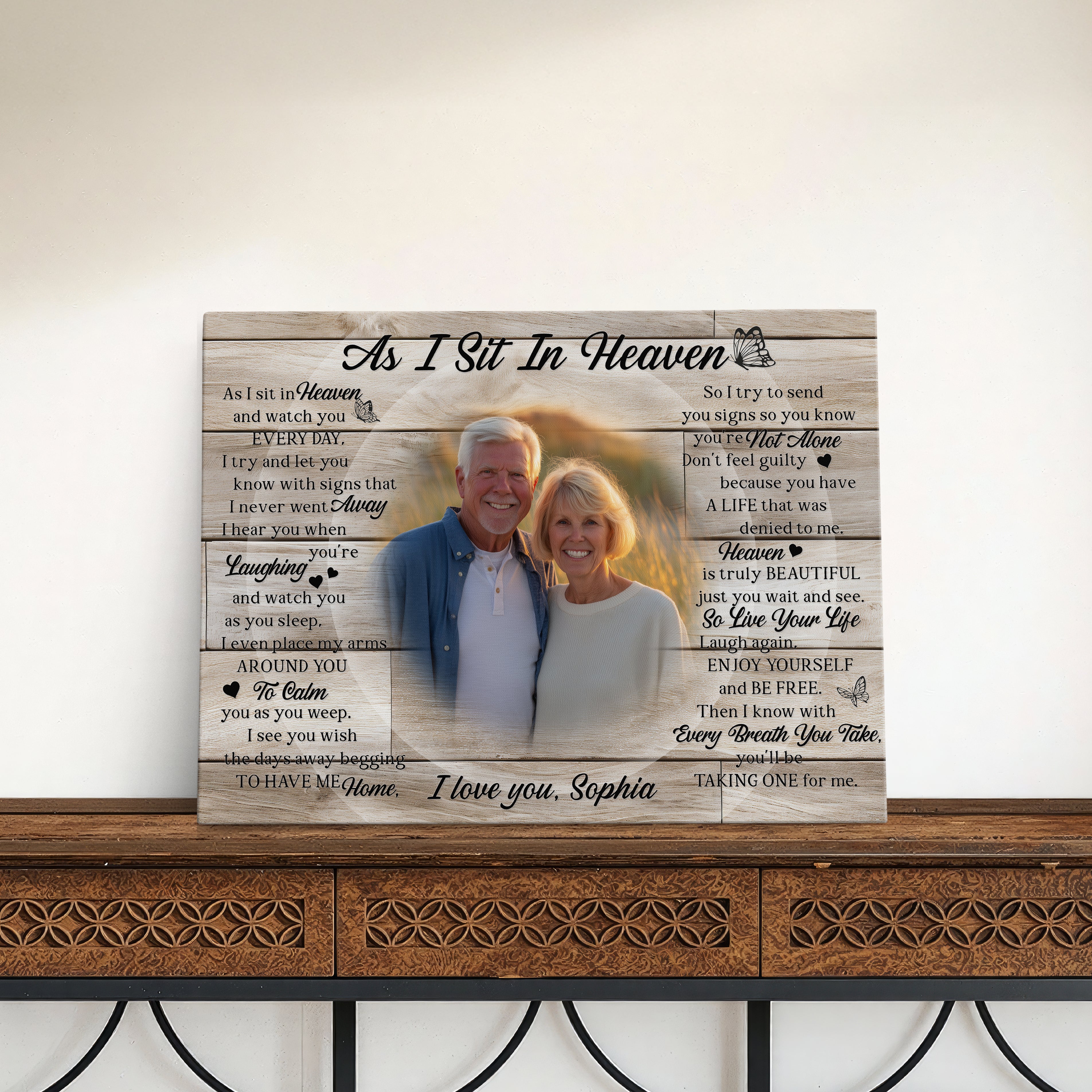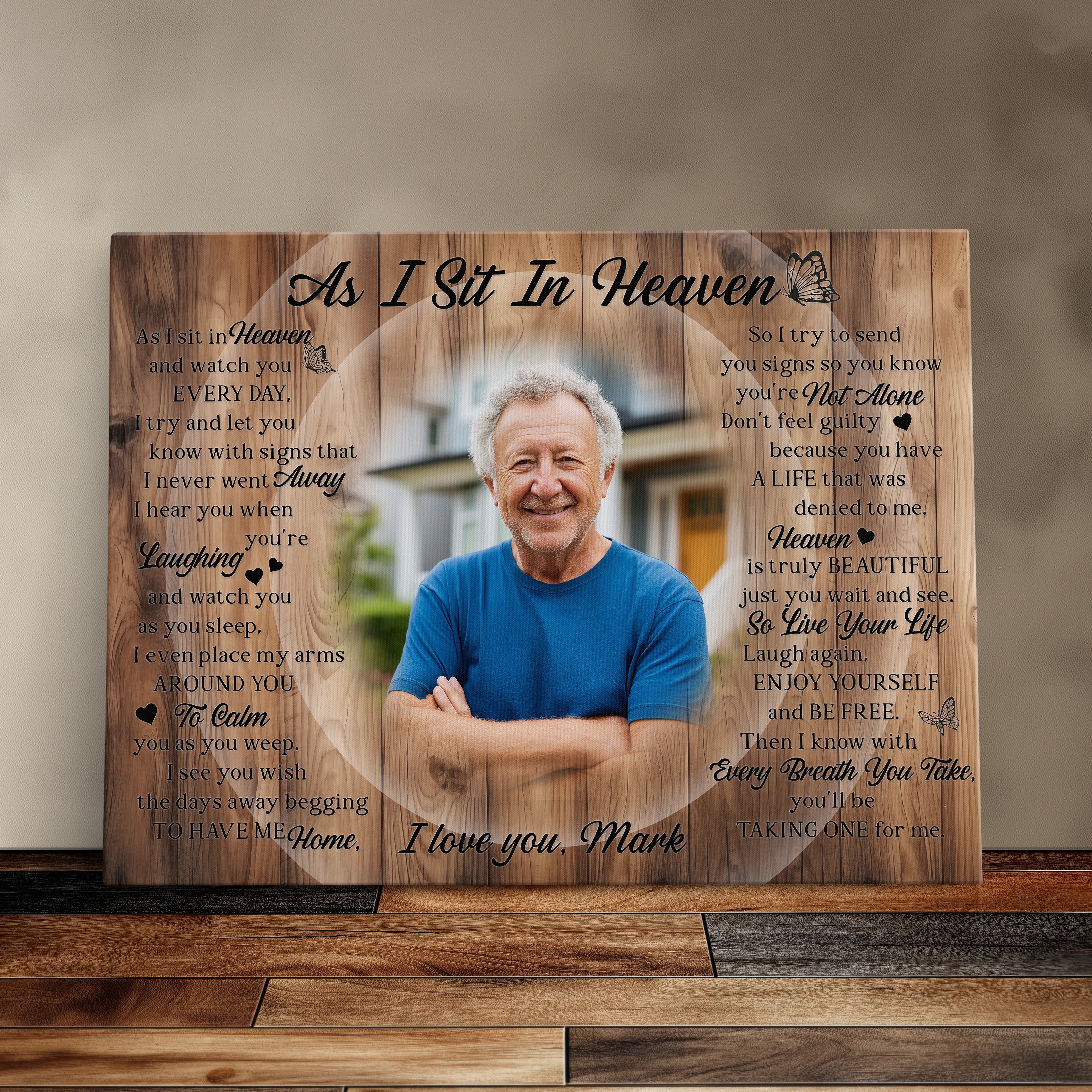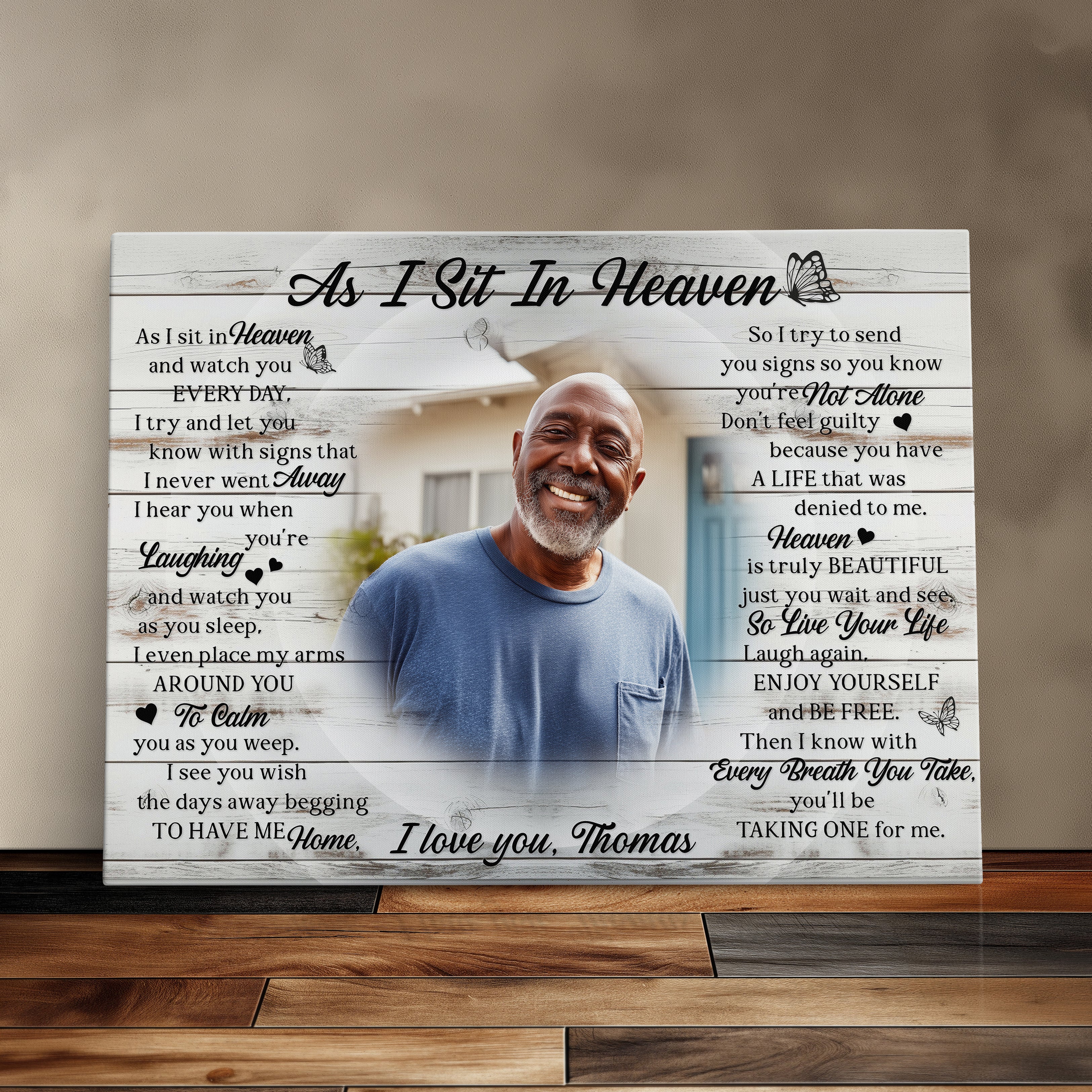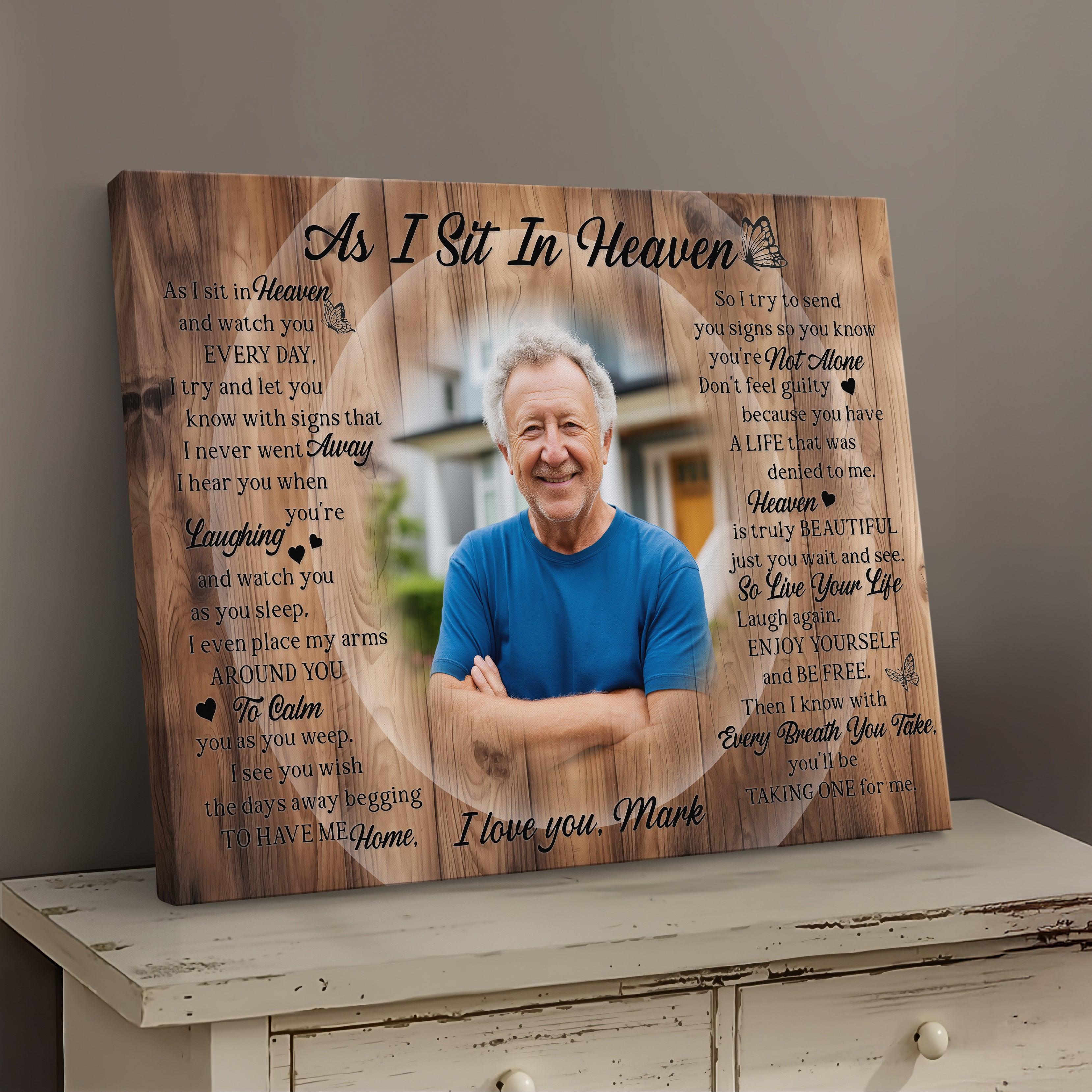 This rest in peace sympathy gift is a touching way to honor the memory of a loved one. The photo memorial canvas print features the heartfelt poem “As I Sit in Heaven,” making it a comforting remembrance gift. A meaningful bereavement and grief gift for those experiencing the loss of a loved one.