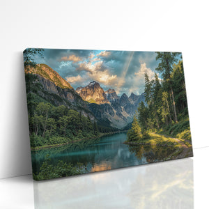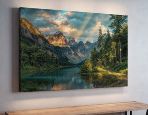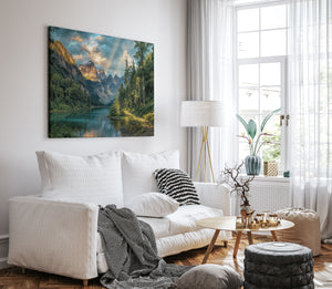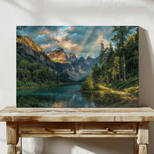 “Alpenglow Reflections and Forest Trails” captures the golden stillness of day’s end — where soft light drapes the mountain ridge, and forest paths lead quietly into mirrored waters. A luminous and earthy composition, it evokes the quiet balance between light, land, and solitude. Printed on a 1.5" gallery-wrapped canvas, this warm-toned landscape canvas print brings a sense of peace to your wall decor. Perfect for nature-inspired home decor, wall hangings, or as a thoughtful housewarming gift, it offers a grounding presence wherever it hangs.