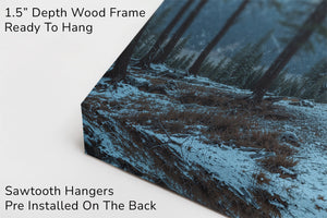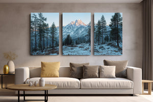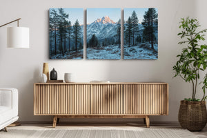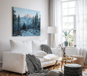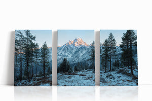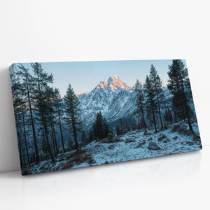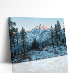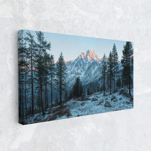 Towering evergreens stand like quiet sentinels in a snow-dusted alpine valley, while the morning sun brushes the rugged summit in soft amber light. This winter landscape offers a serene view of untouched wilderness and majestic peaks. A striking choice for rustic home decor, cabin interiors, or lovers of cold mountain beauty.