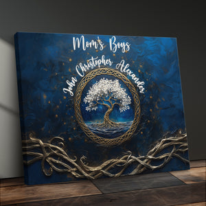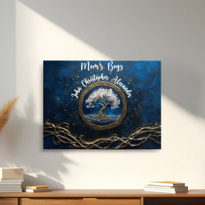 This beautifully detailed custom wall art features a luminous Tree of Life encircled in golden accents, set against a rich celestial background. Personalize both the top title (like “Mom’s Boys” or “Smith Family”) and the names encircling the tree to make it uniquely yours.
