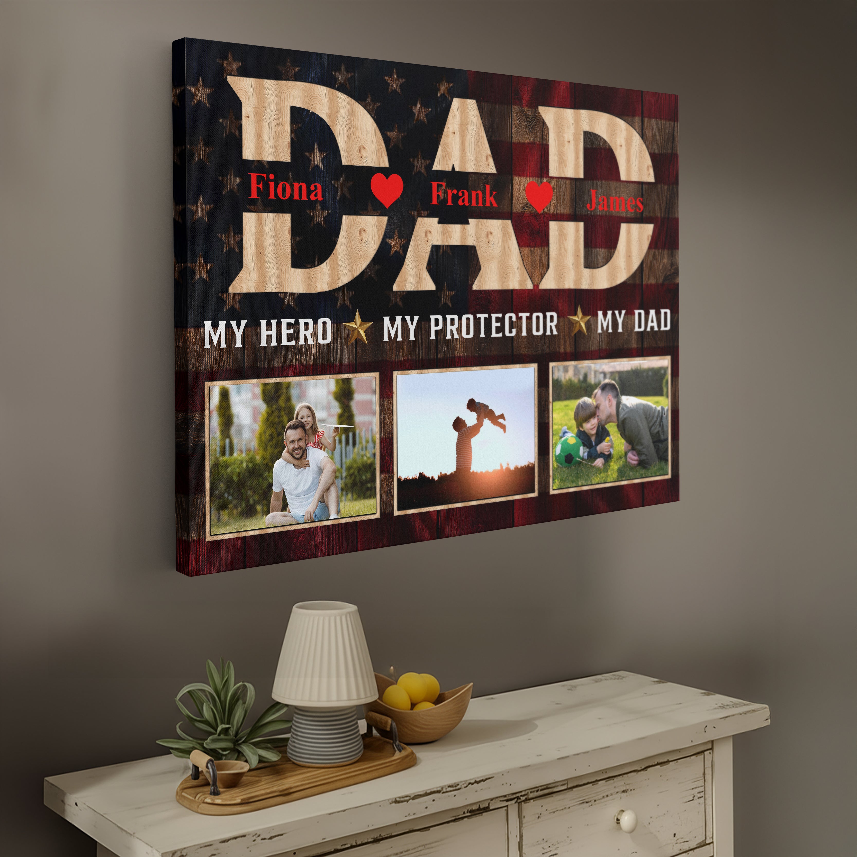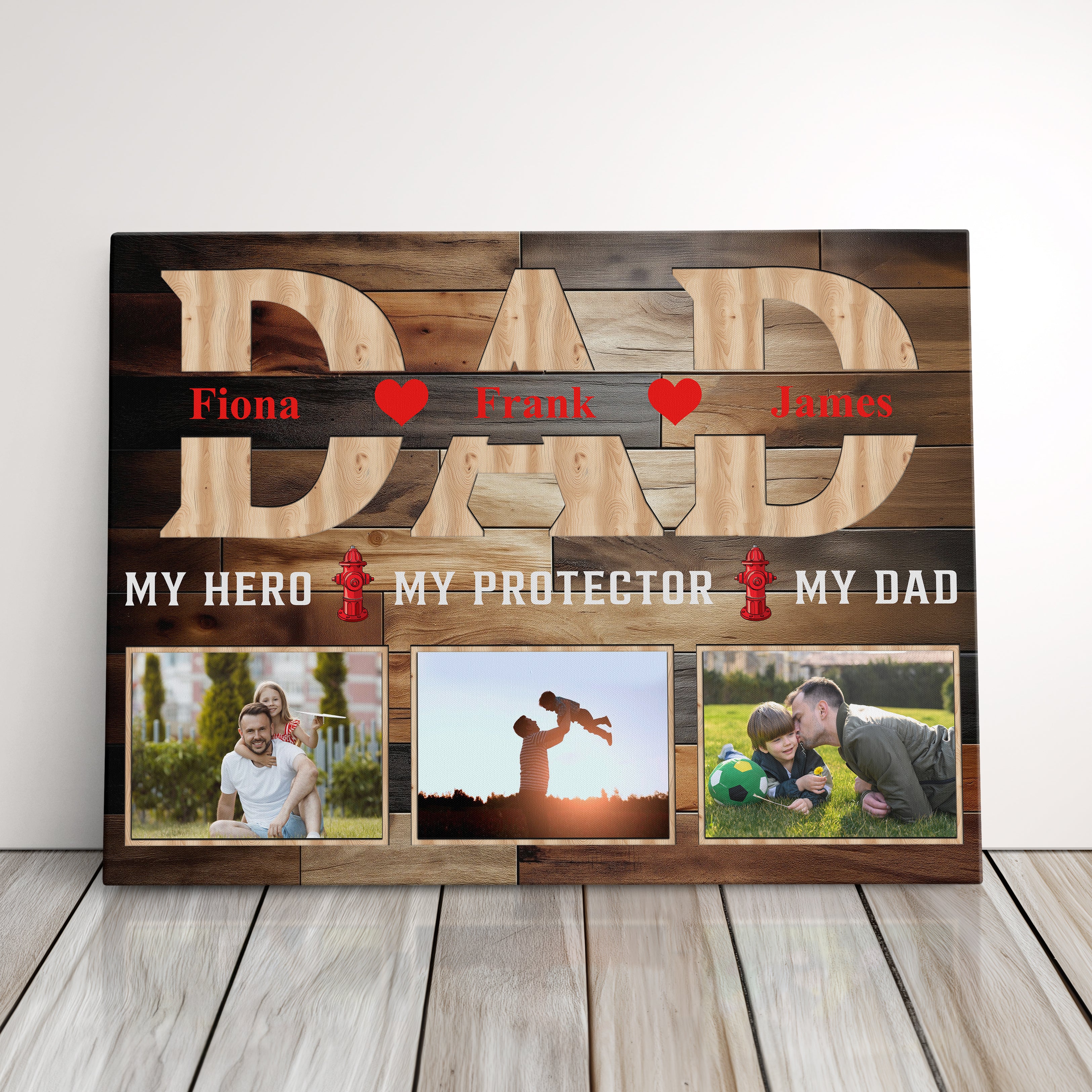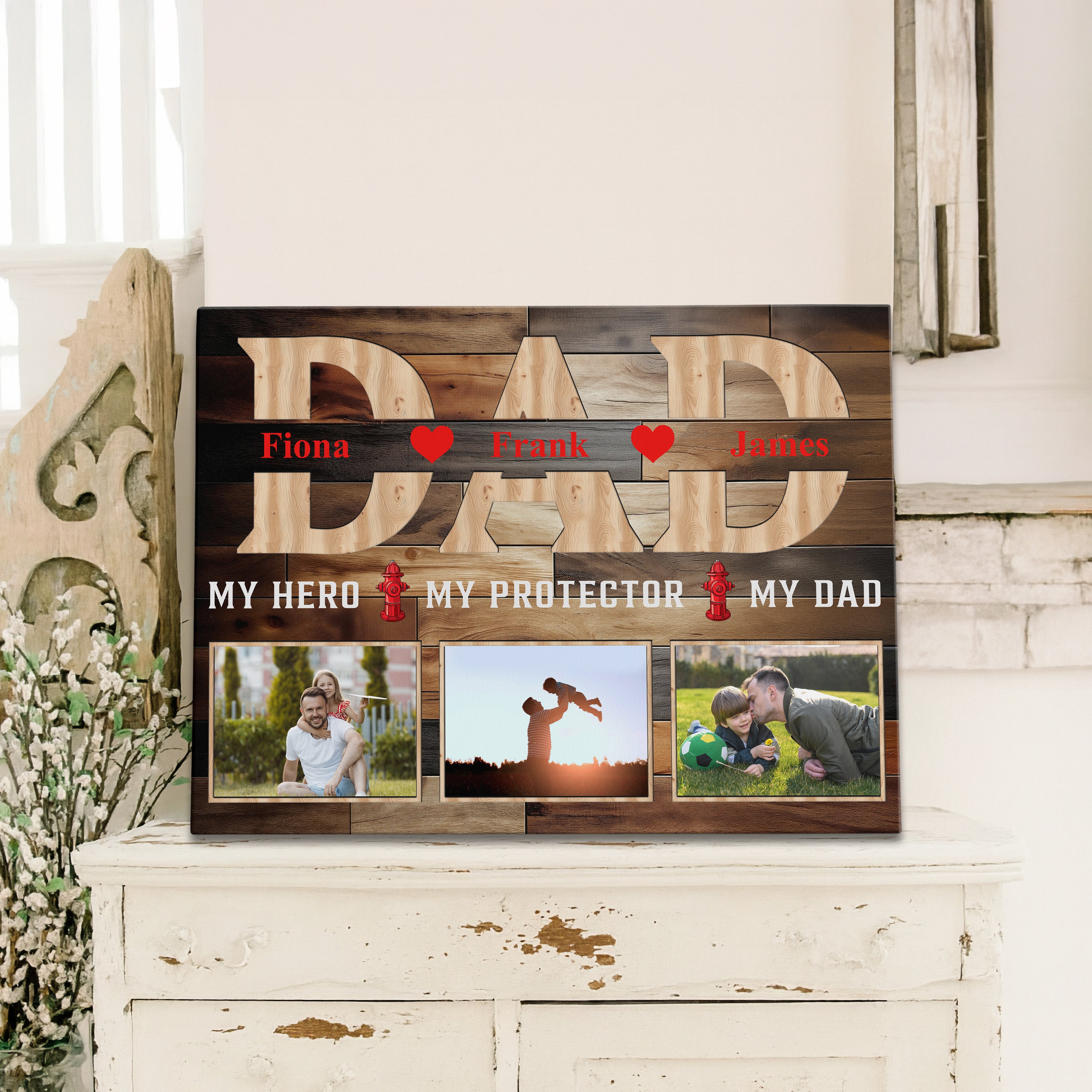 Honor your firefighter, police officer, or military mom or dad with this heartfelt hero wall art piece, featuring a custom photo display that makes a perfect Mother or Father's Day present. This family portrait canvas print comes beautifully framed in a rustic decor style, creating a cherished home decoration that celebrates the strength and dedication of first responders.