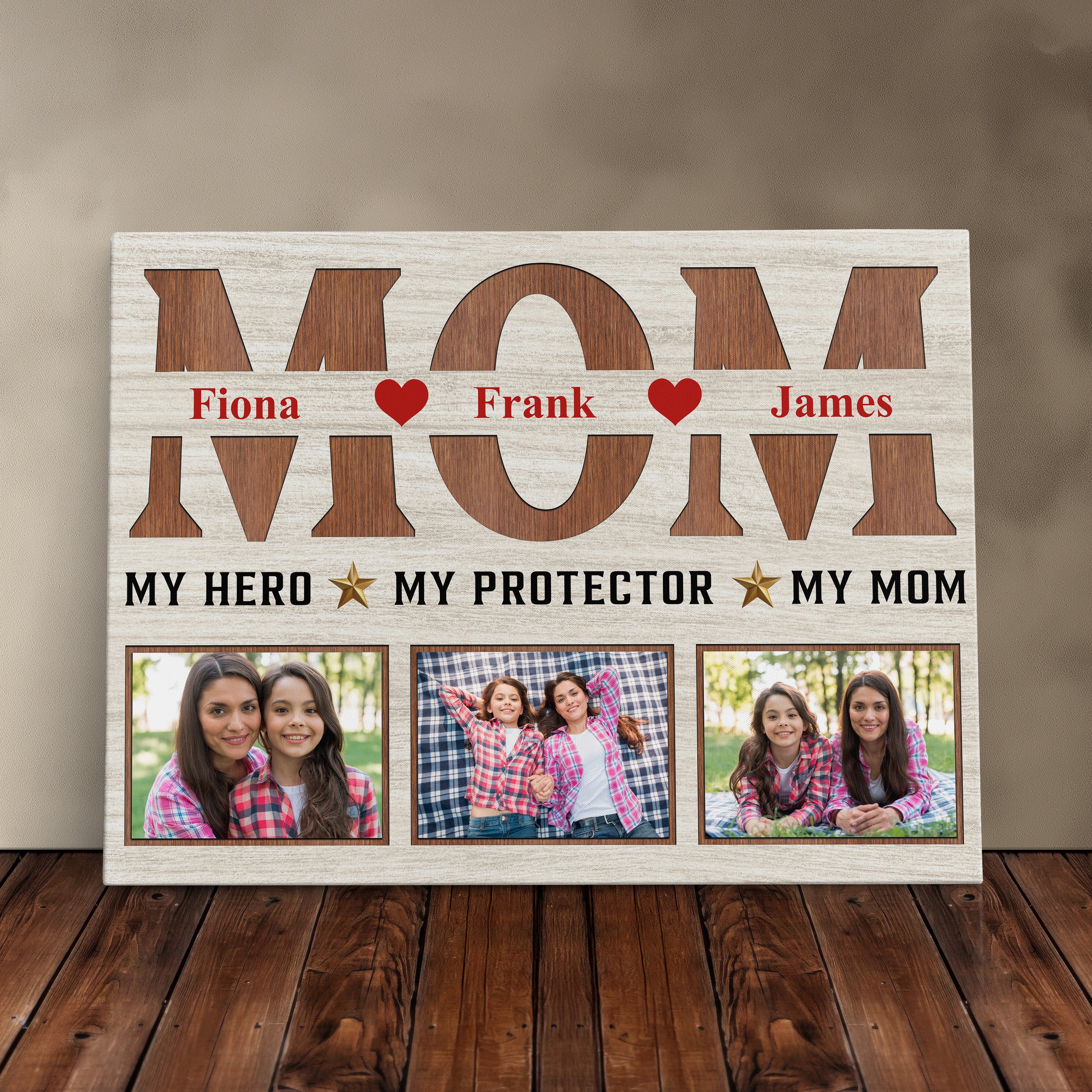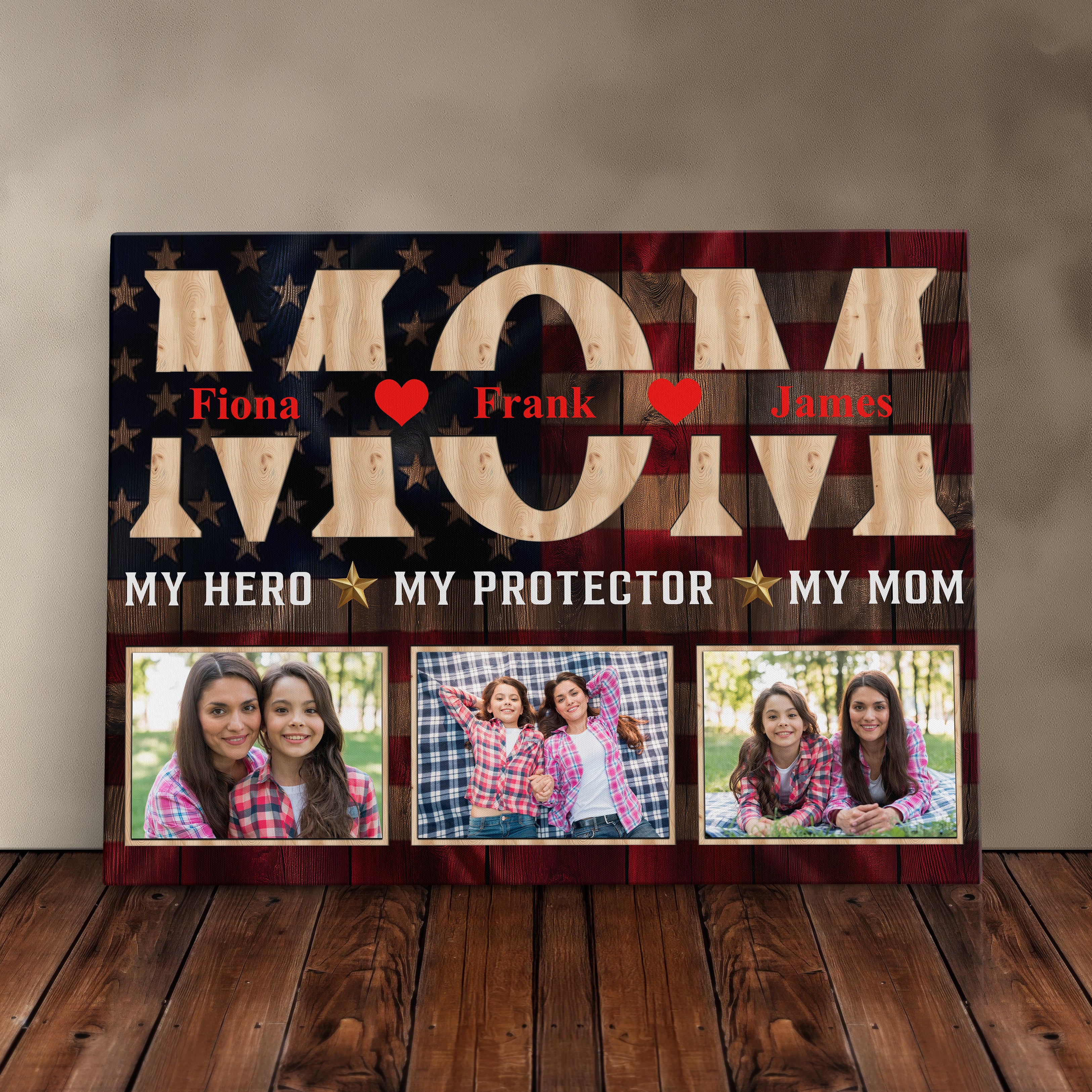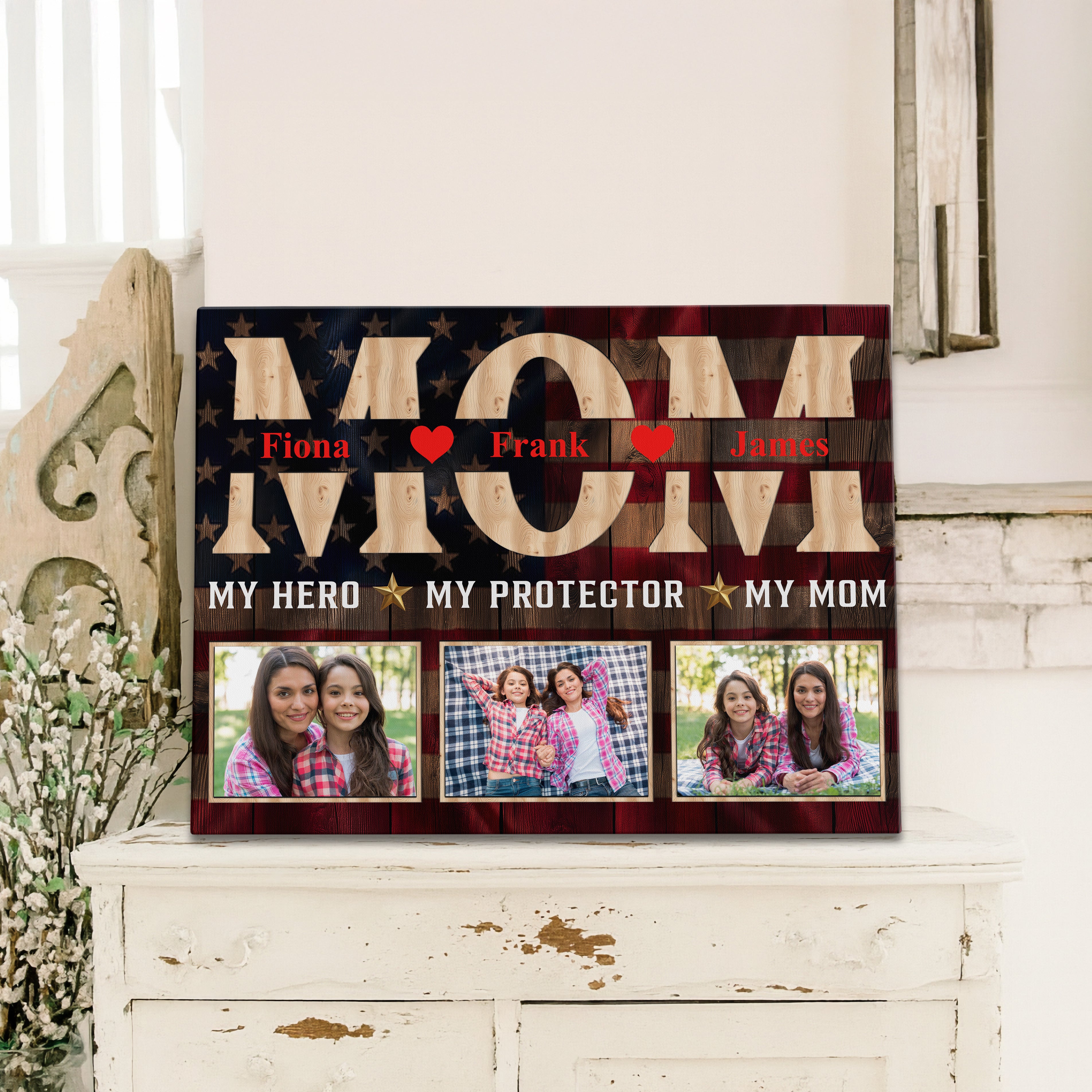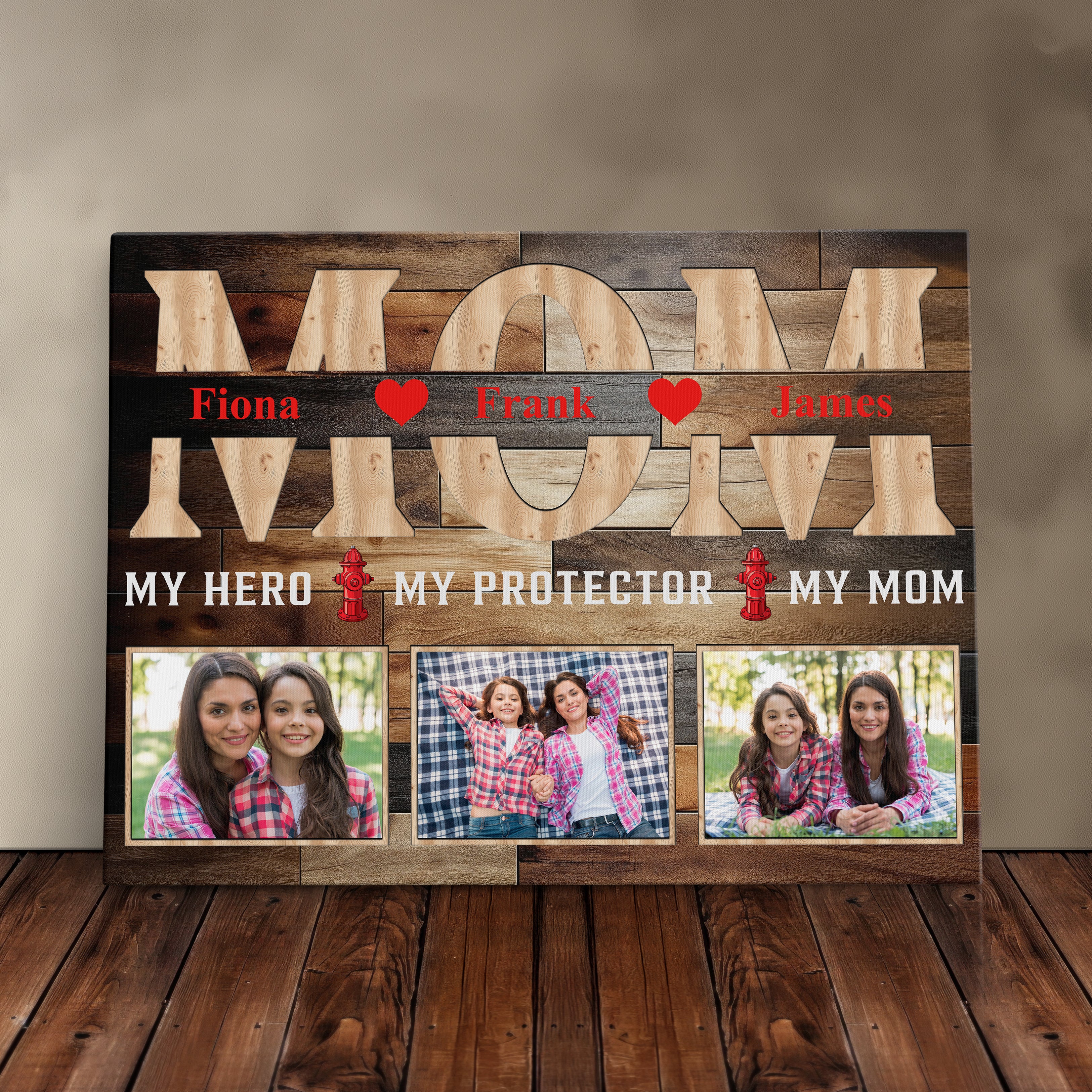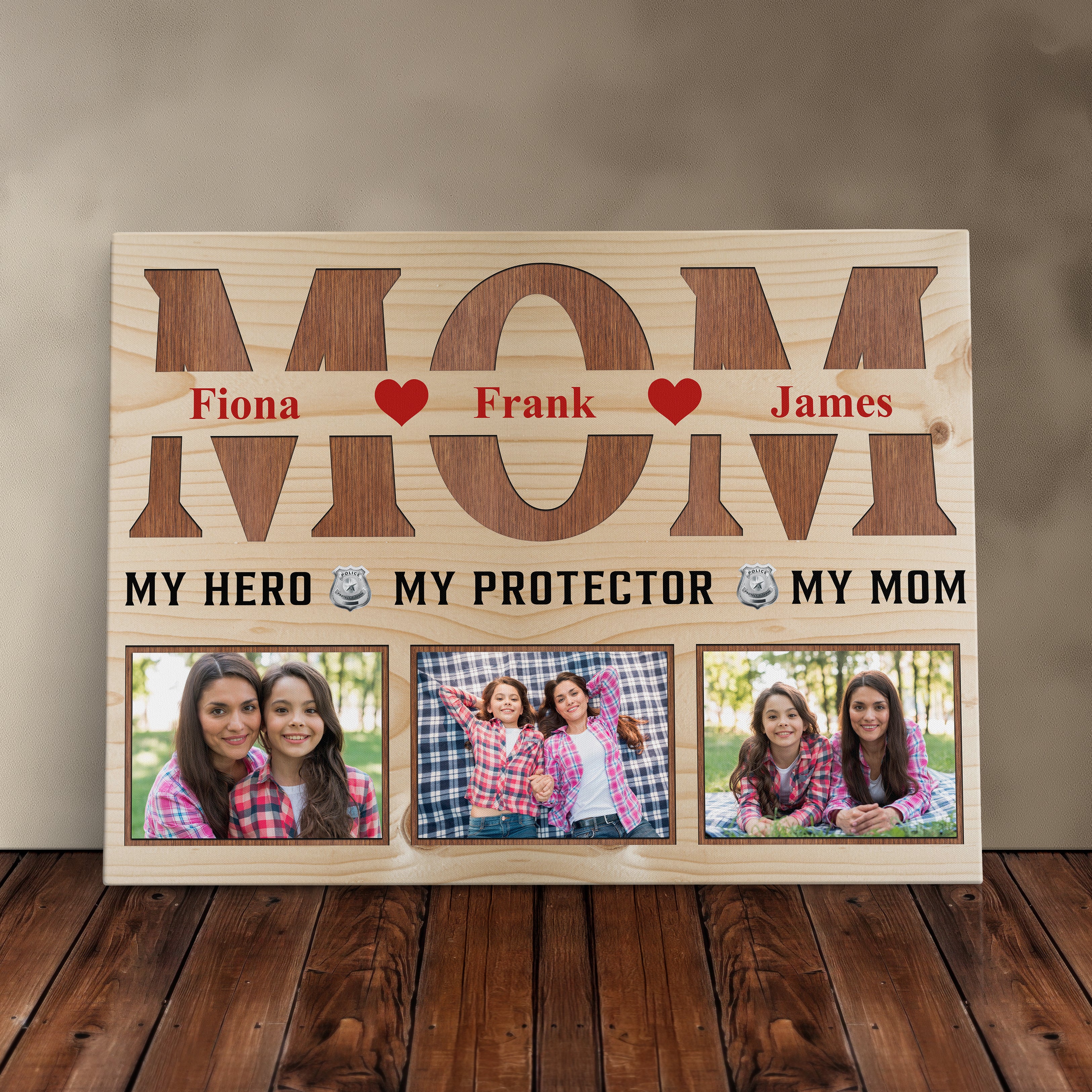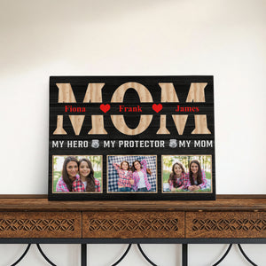 Honor your firefighter, police officer, or military mom or dad with this heartfelt hero wall art piece, featuring a custom photo display that makes a perfect Mother or Father's Day present. This family portrait canvas print comes beautifully framed in a rustic decor style, creating a cherished home decoration that celebrates the strength and dedication of first responders.
