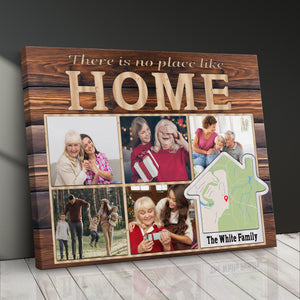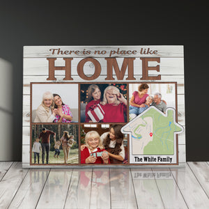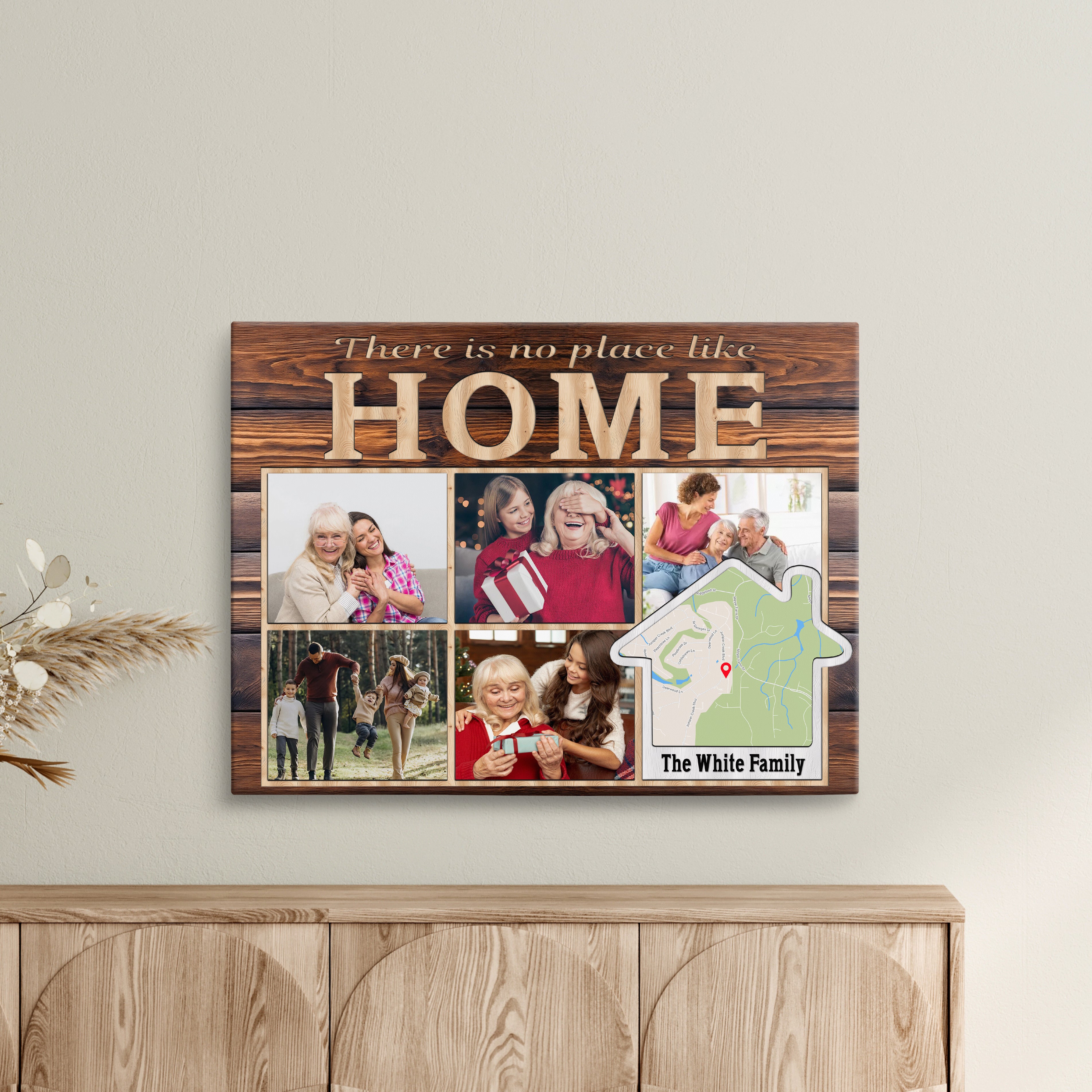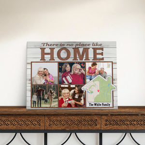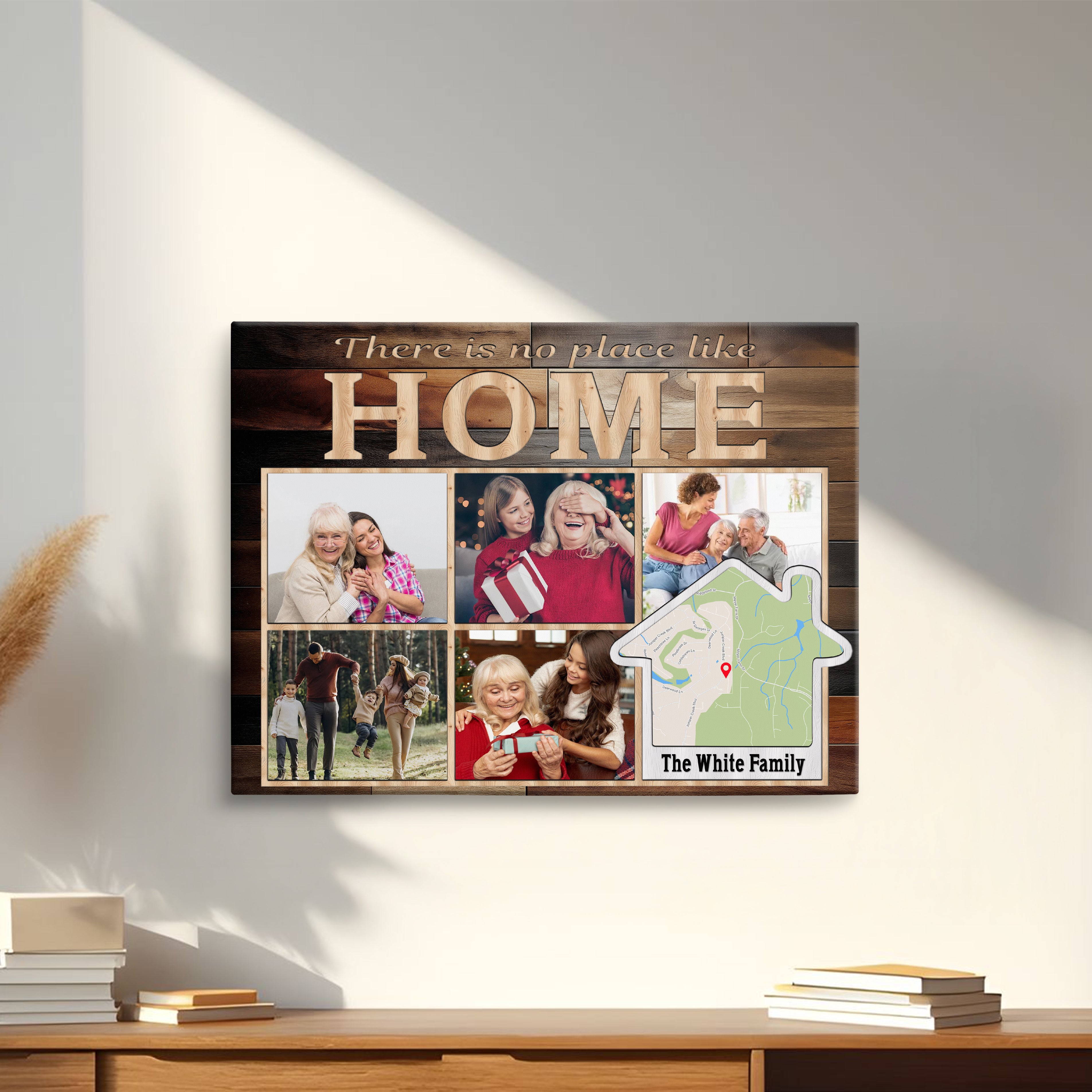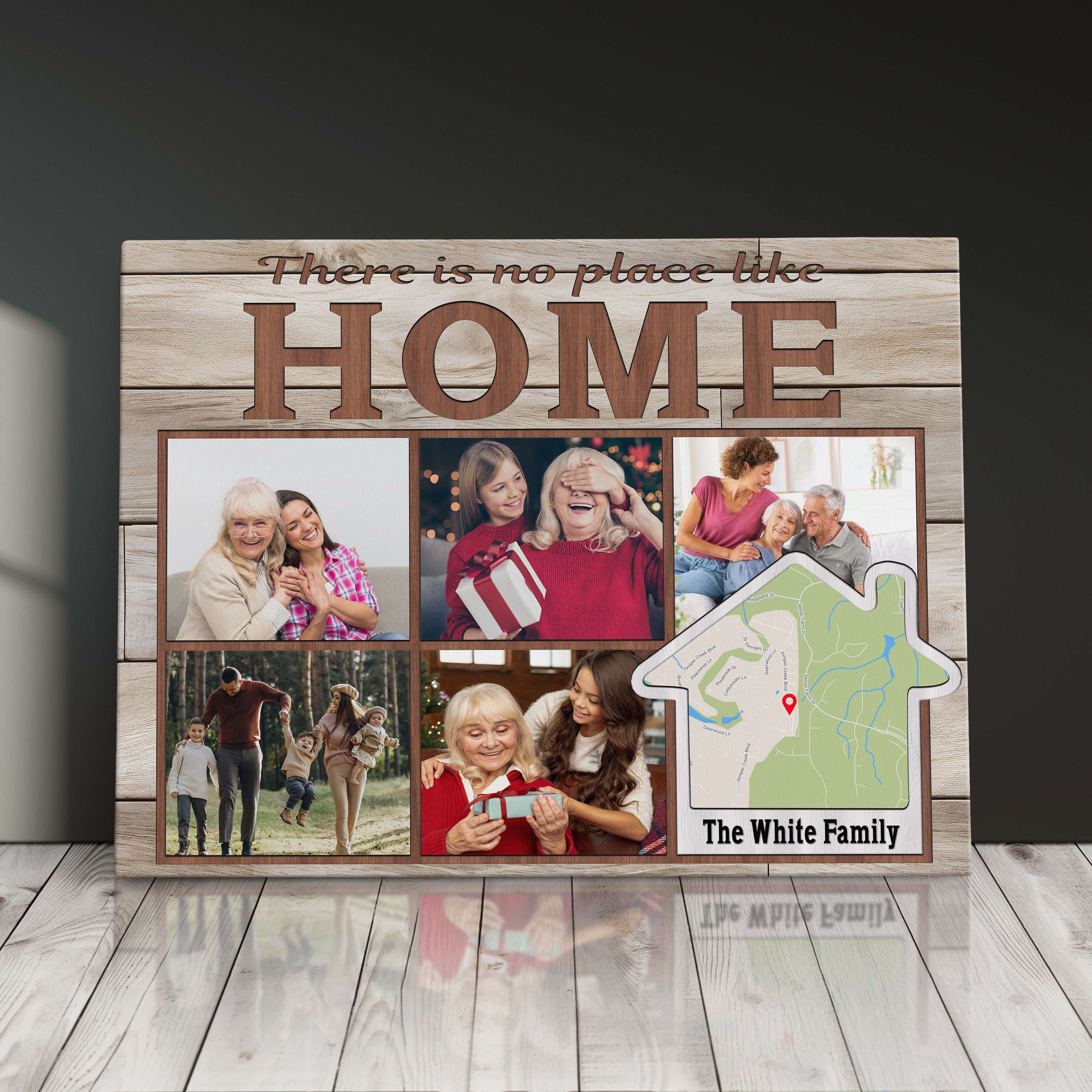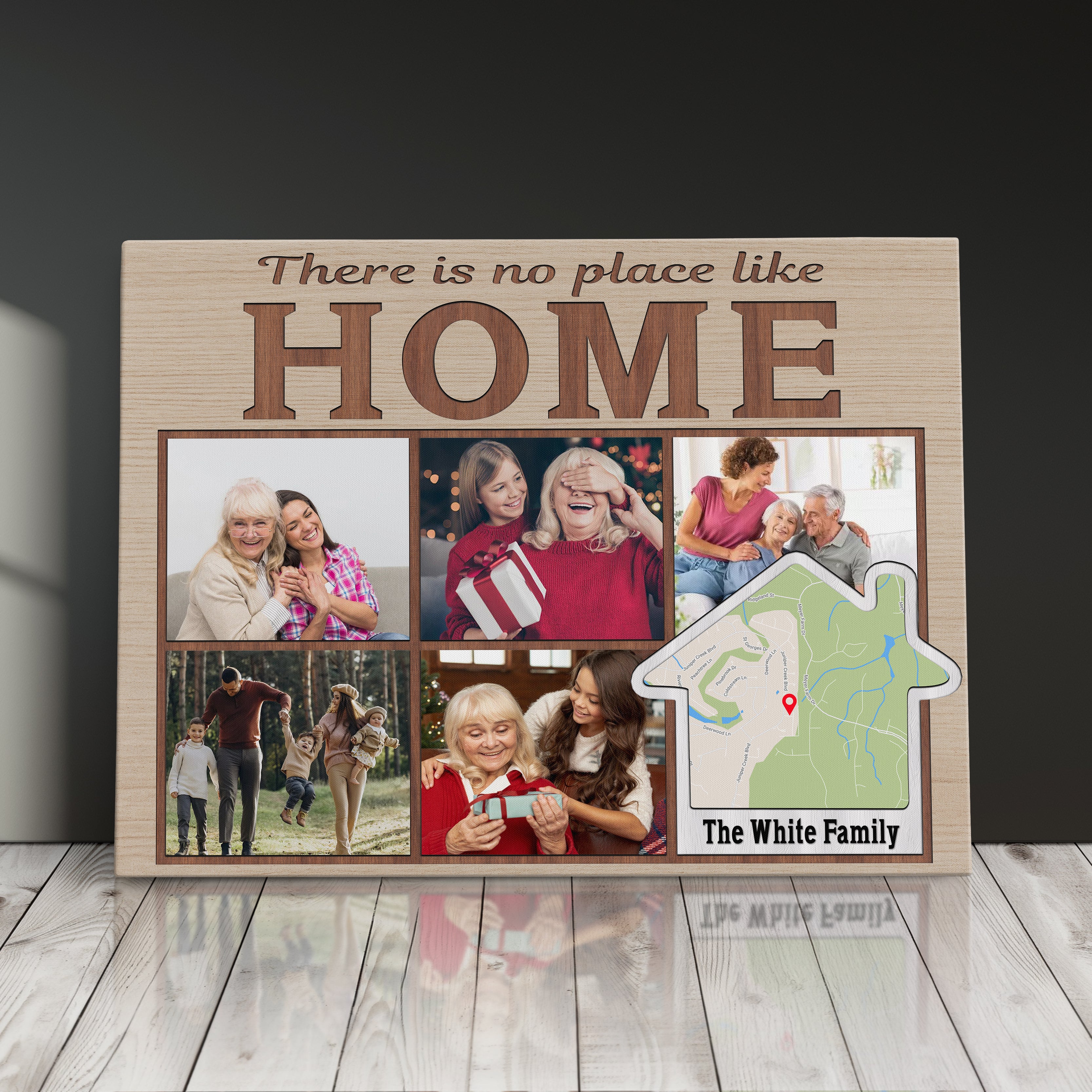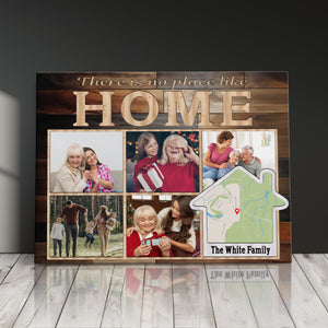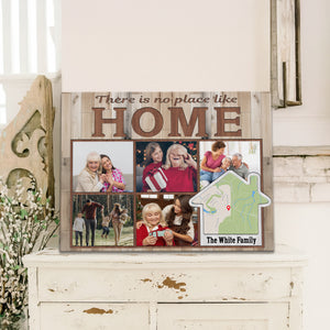 Transform your cherished memories into stunning custom photo wall art with this modern memory display, perfect as a family photo canvas print for your living room gallery wall. This customizable address sign features space for five photos and can be personalized with your family name and location, making it an ideal house gift that celebrates your home's precious moments.