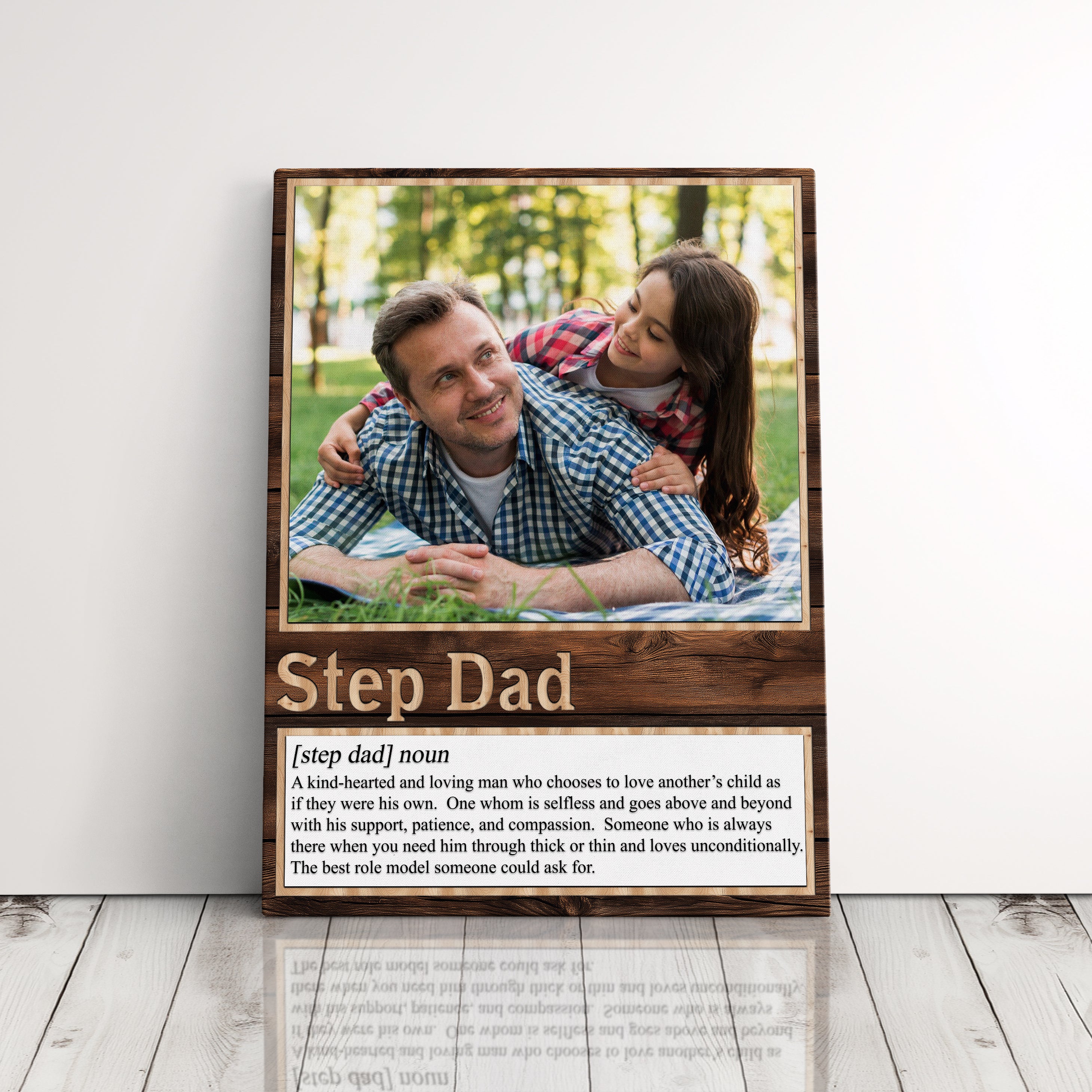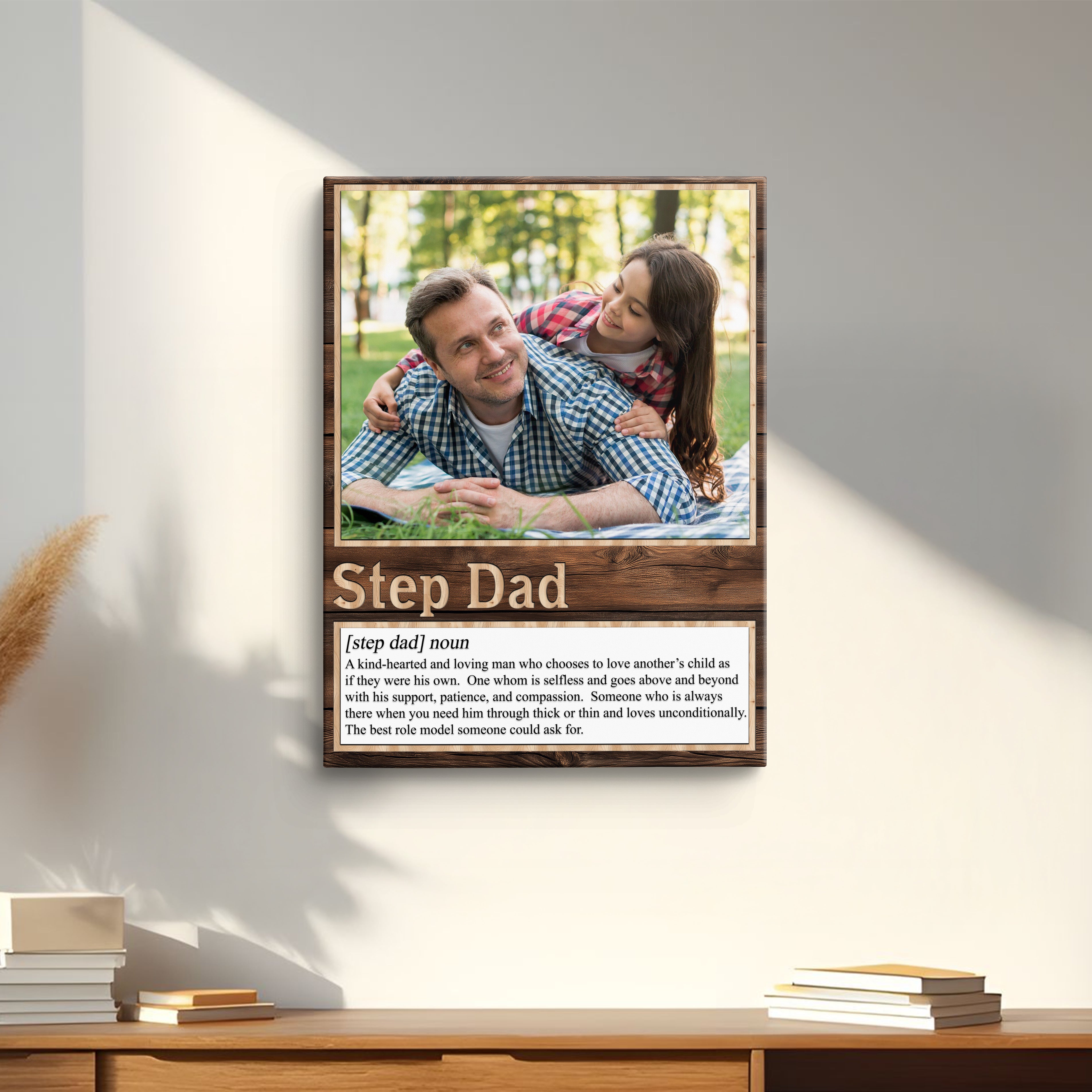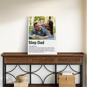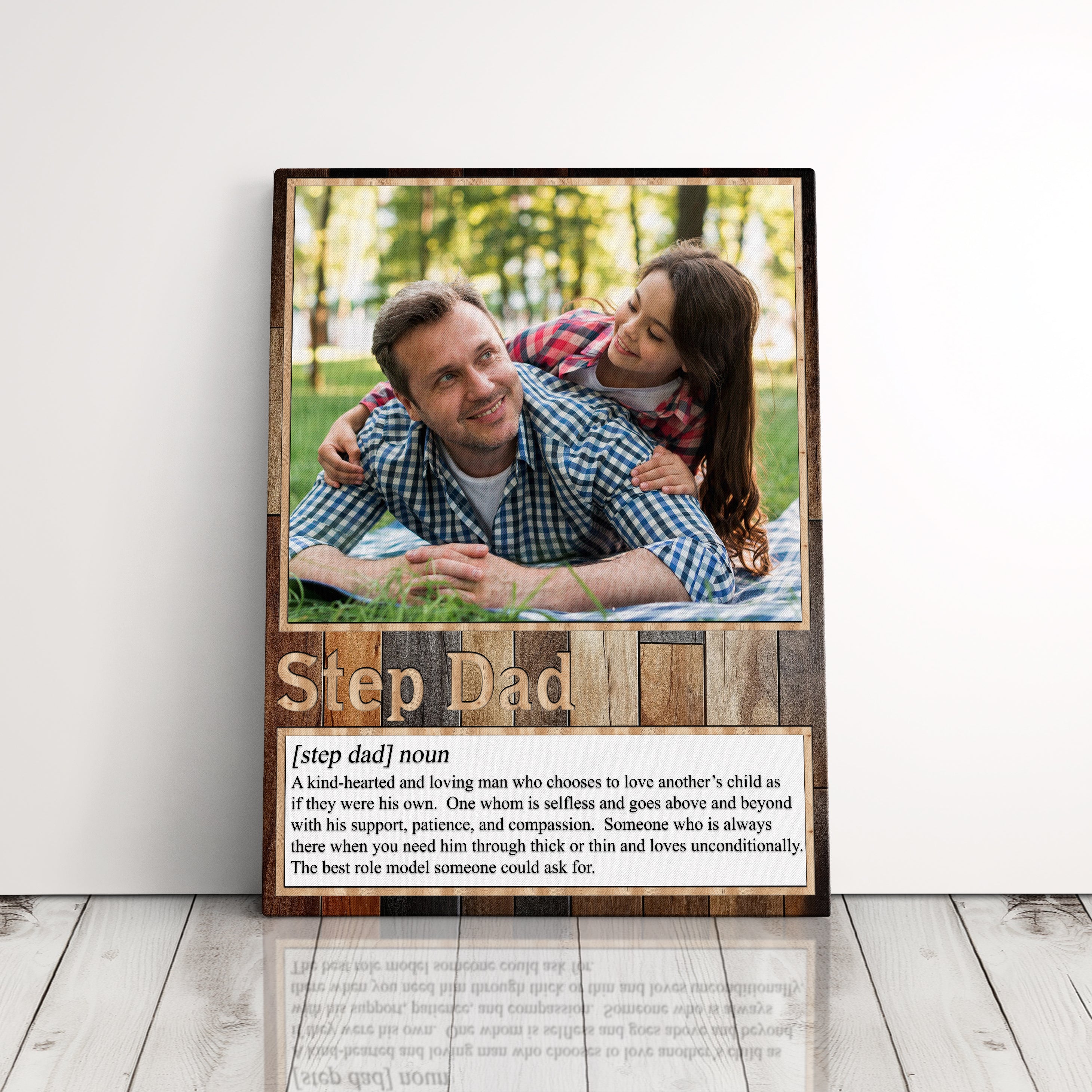 Transform your space with this meaningful step dad gift featuring a custom-designed photo print that doubles as stunning wall decor. This versatile canvas print showcases your cherished family photo alongside a touching definition of "Step Dad," creating a personalized piece of art that serves as a beautiful home decoration.