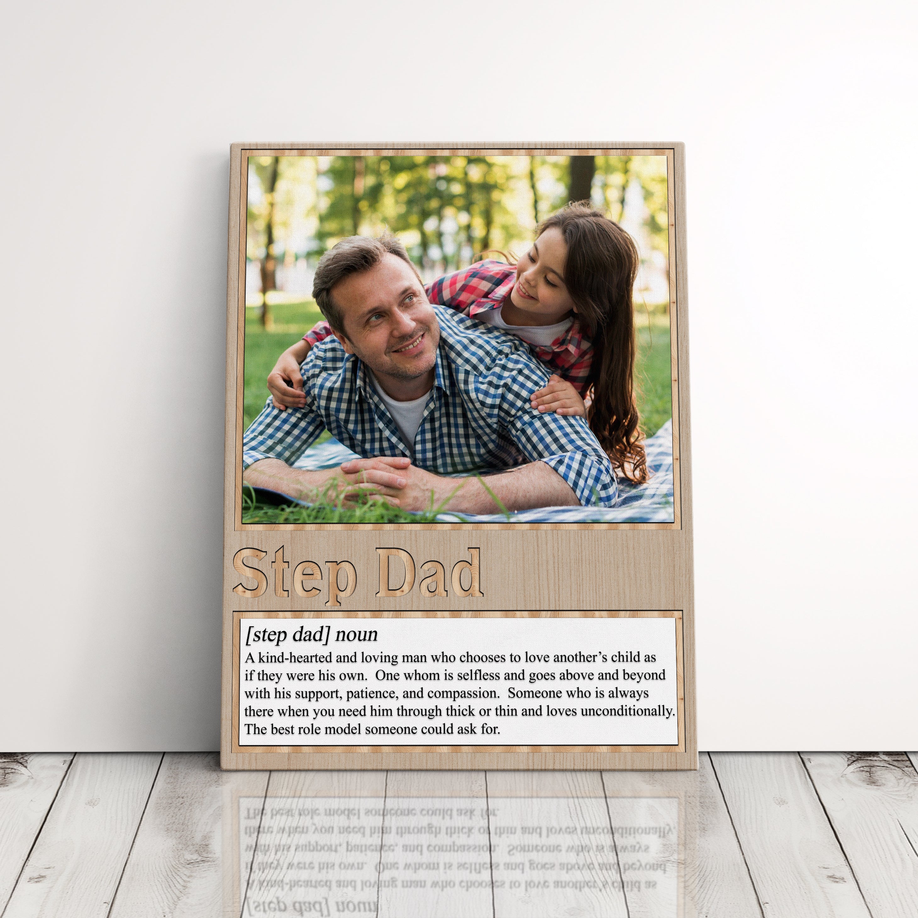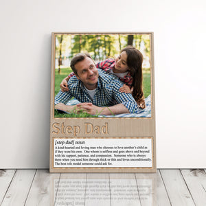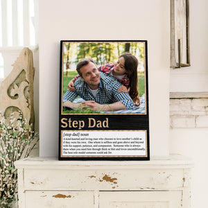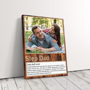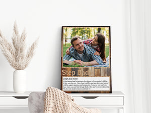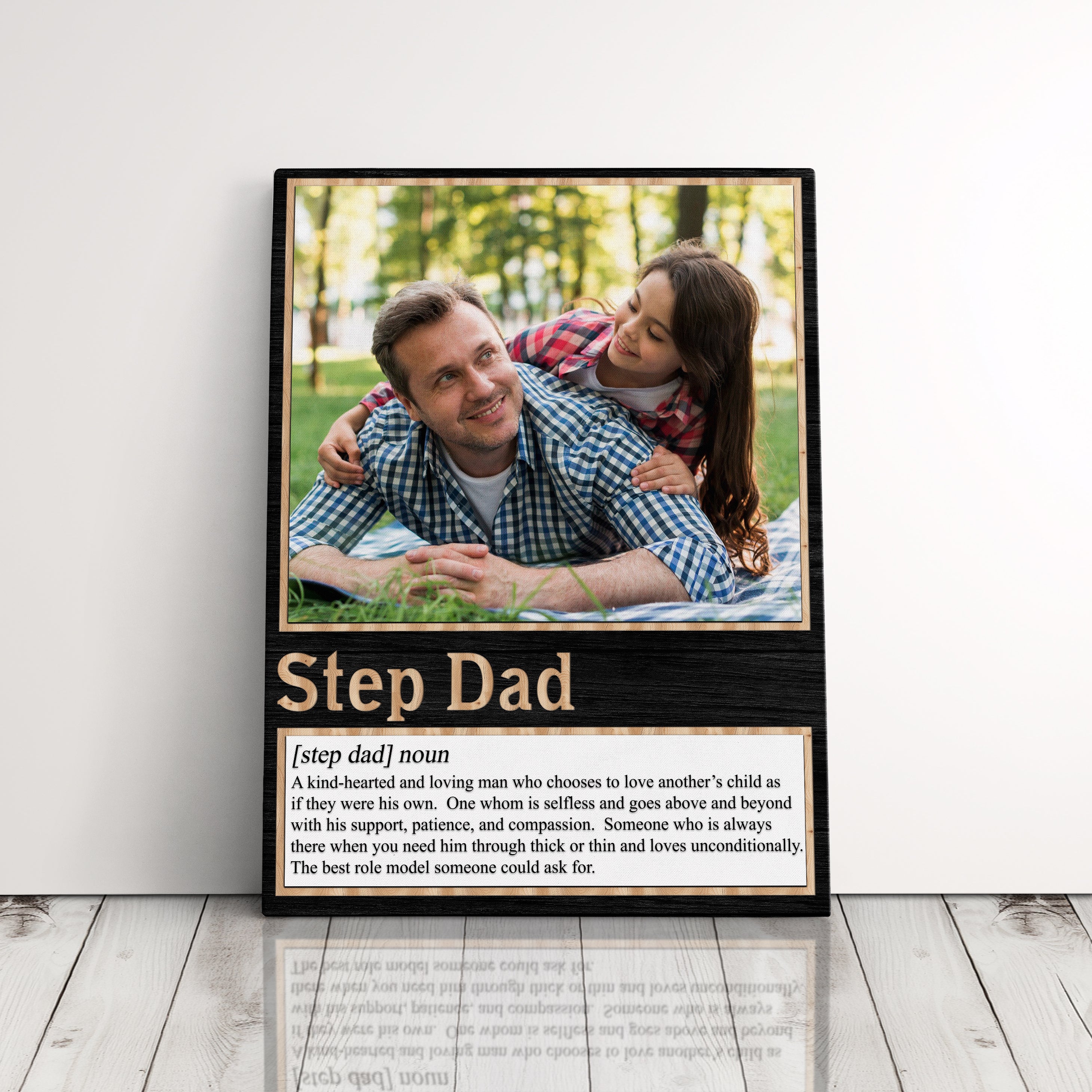 Transform your space with this meaningful step dad gift featuring a custom-designed photo print that doubles as stunning wall decor. This versatile canvas print showcases your cherished family photo alongside a touching definition of "Step Dad," creating a personalized piece of art that serves as a beautiful home decoration.