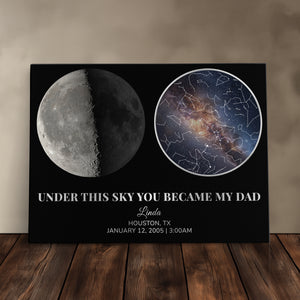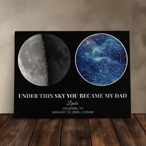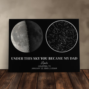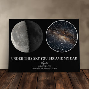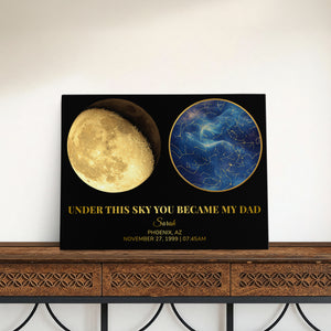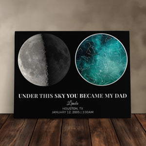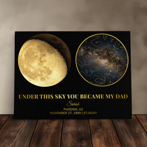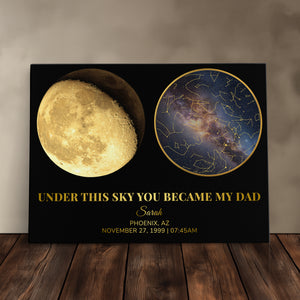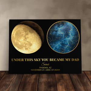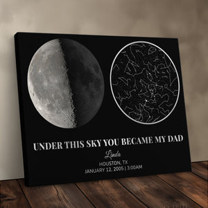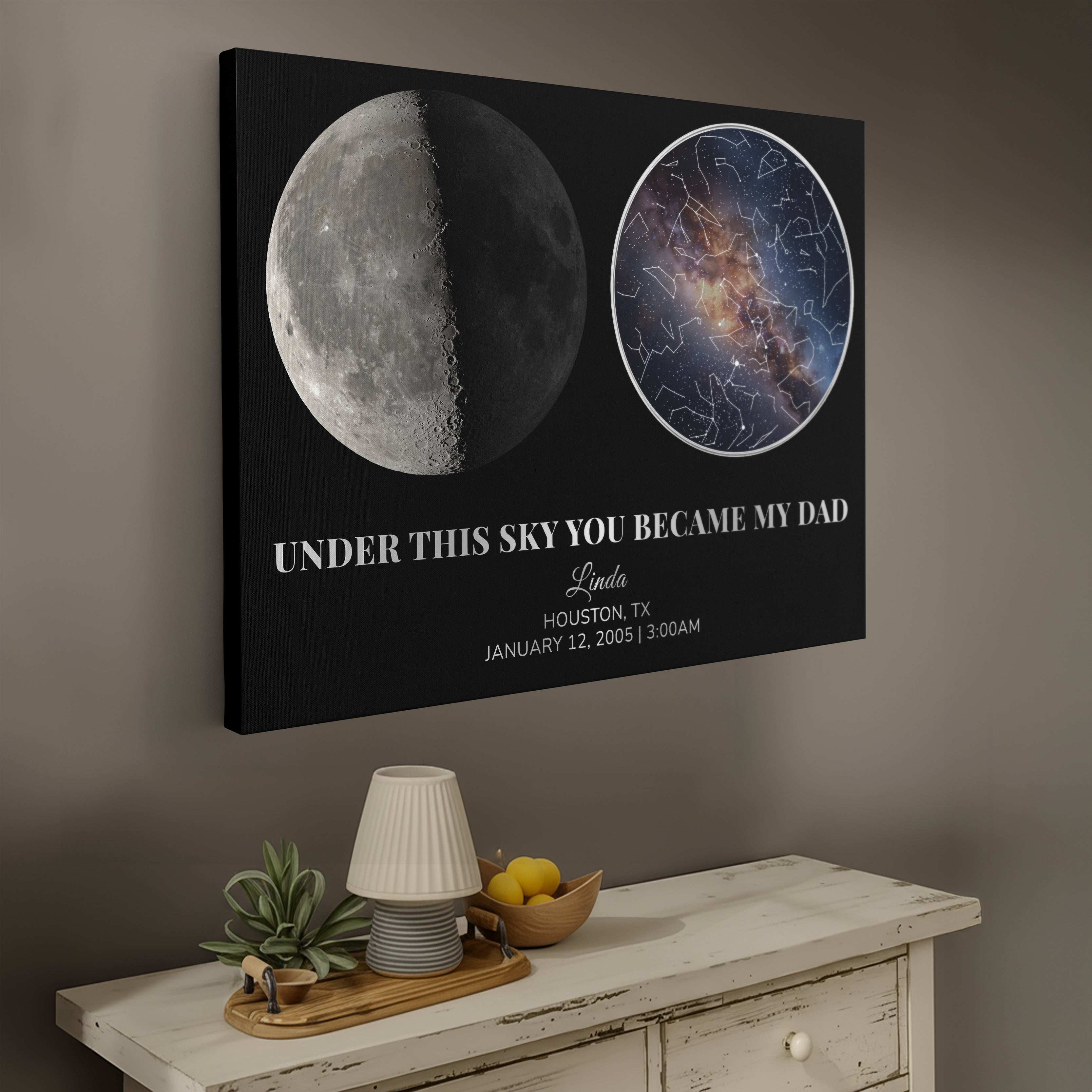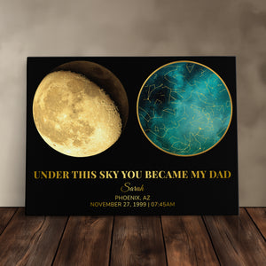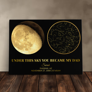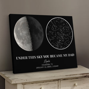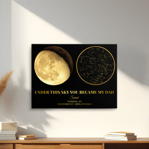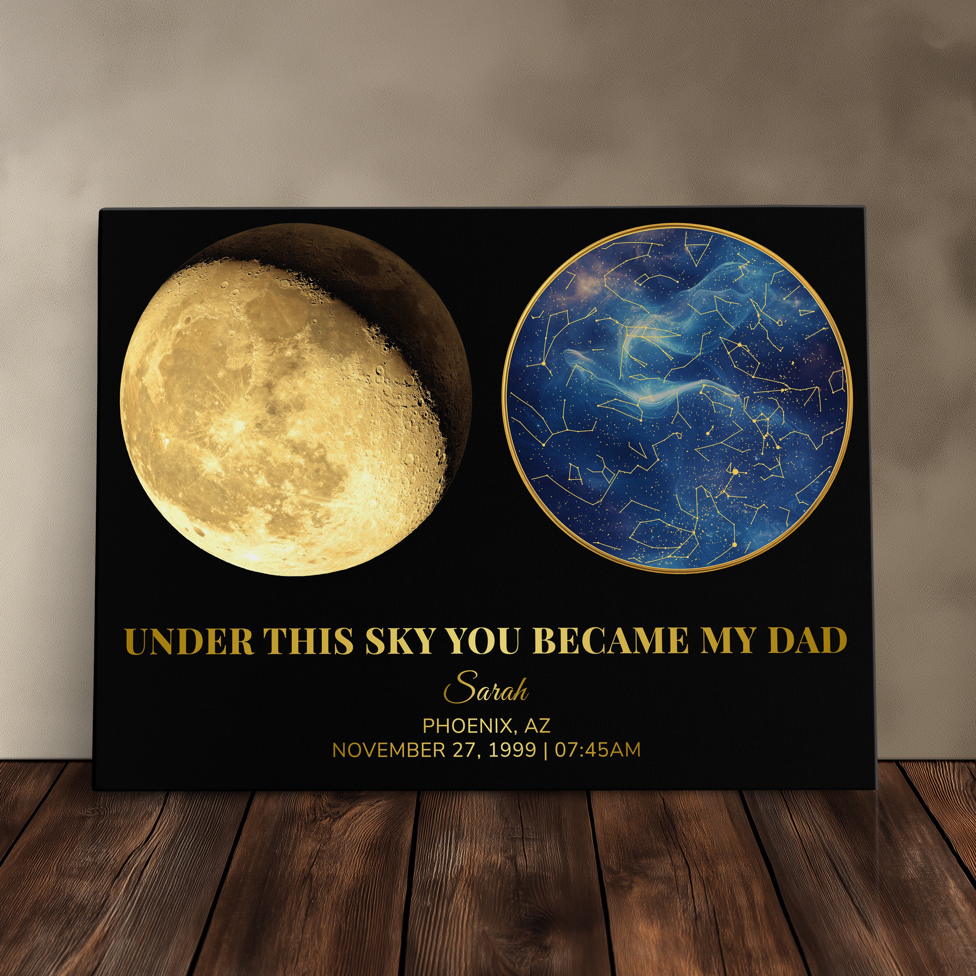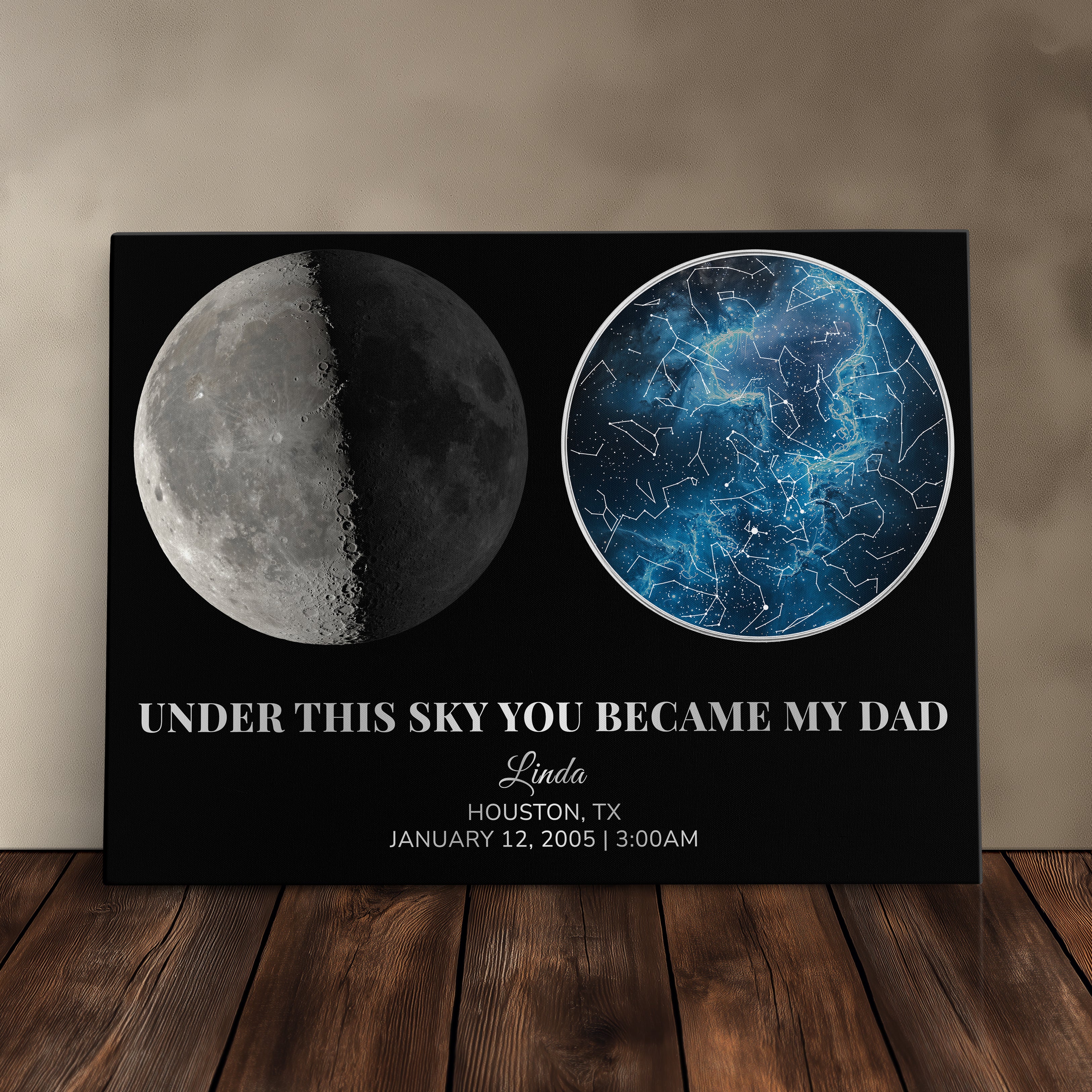 Surprise Dad with a truly one-of-a-kind gift he’ll never forget. This personalized star map and moon phase canvas print captures the sky exactly as it appeared on the night that changed everything — the moment he became a father.