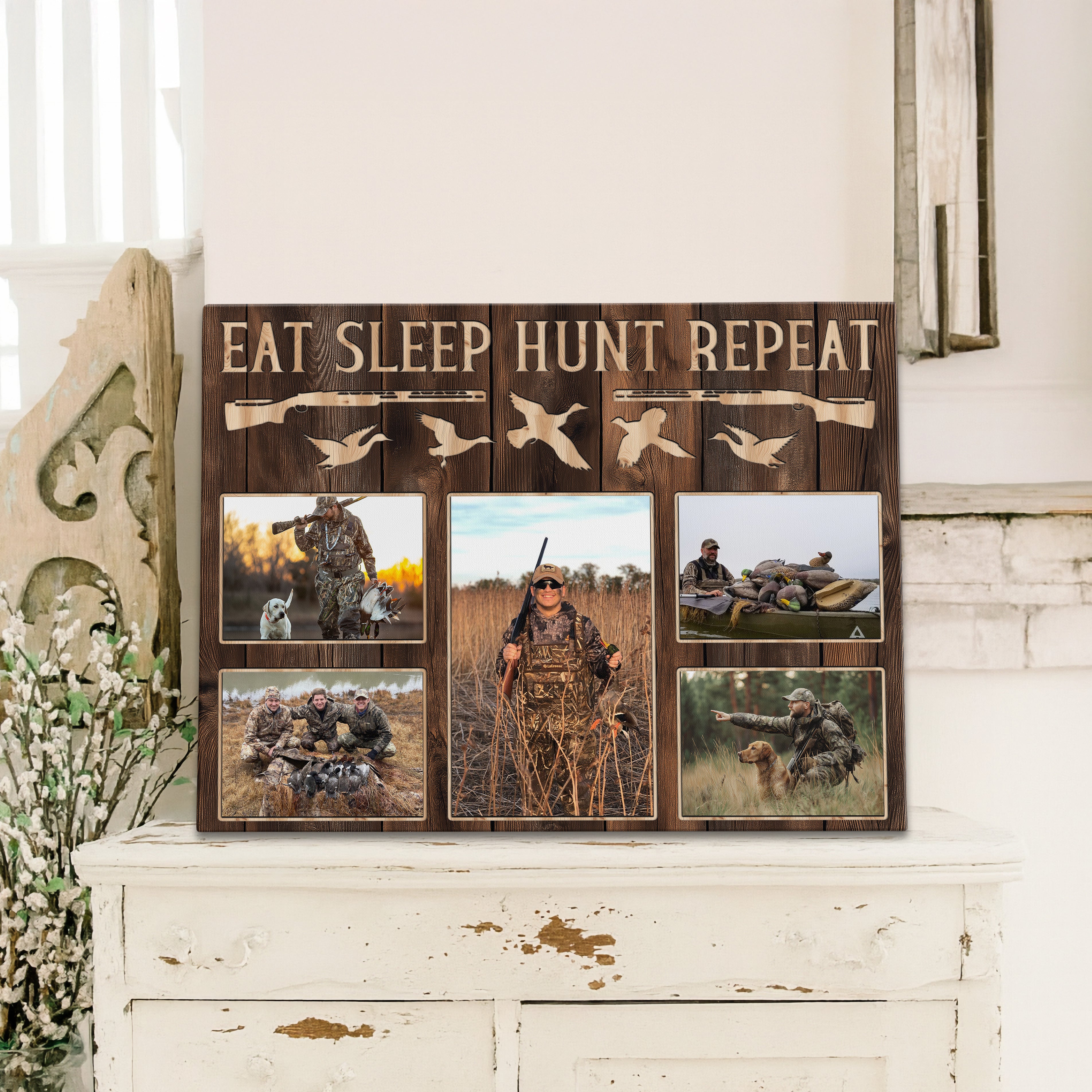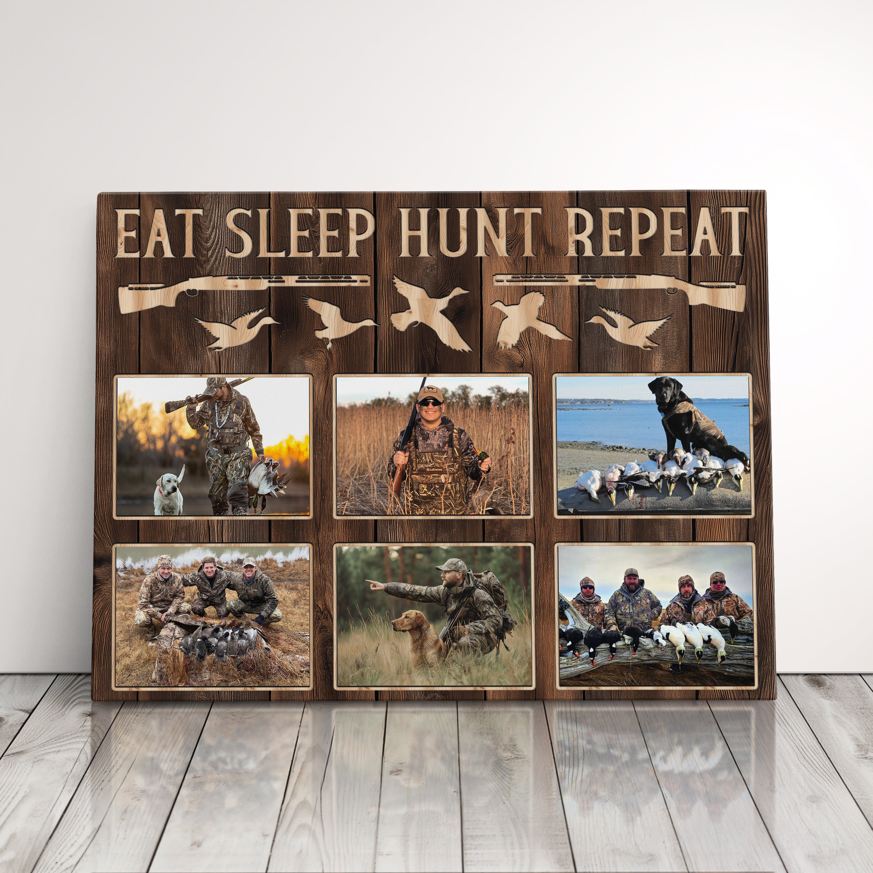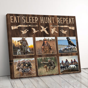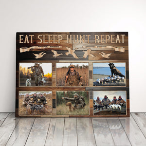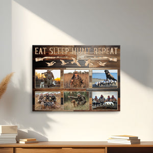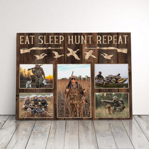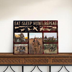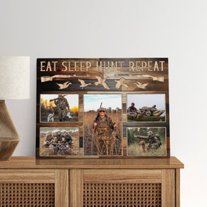 Transform your space into an authentic hunting display with this versatile hunting canvas art featuring "EAT SLEEP HUNT REPEAT" text alongside duck silhouettes and rifle designs. Perfect as a thoughtful hunter gift or eye-catching dad's wall decor piece, this custom-photo frame showcases your passion for duck hunting and pheasant hunting, making it ideal for a rustic lodge decoration or man cave wall display.