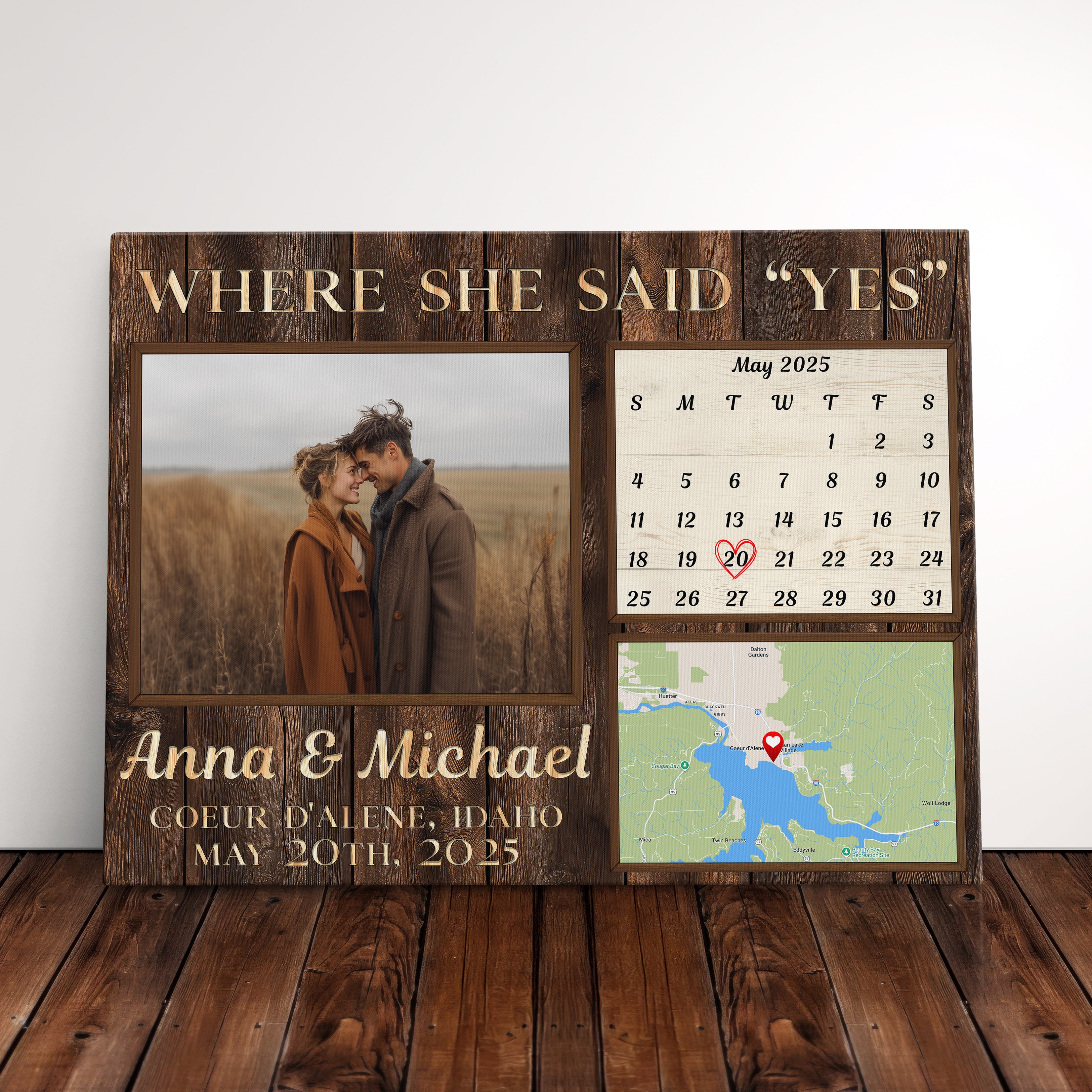 Commemorate the moment with a personalized engagement gift photo frame marking where she said yes. This unique engagement gift with date is perfect for a newly engaged couple, capturing their special milestone. A meaningful keepsake they’ll treasure for years to come. This elegant display frame combines a wedding photo with a custom wedding date calendar and location map, creating a truly personalized gallery print that adds both style and sentiment to your home's design inspiration.