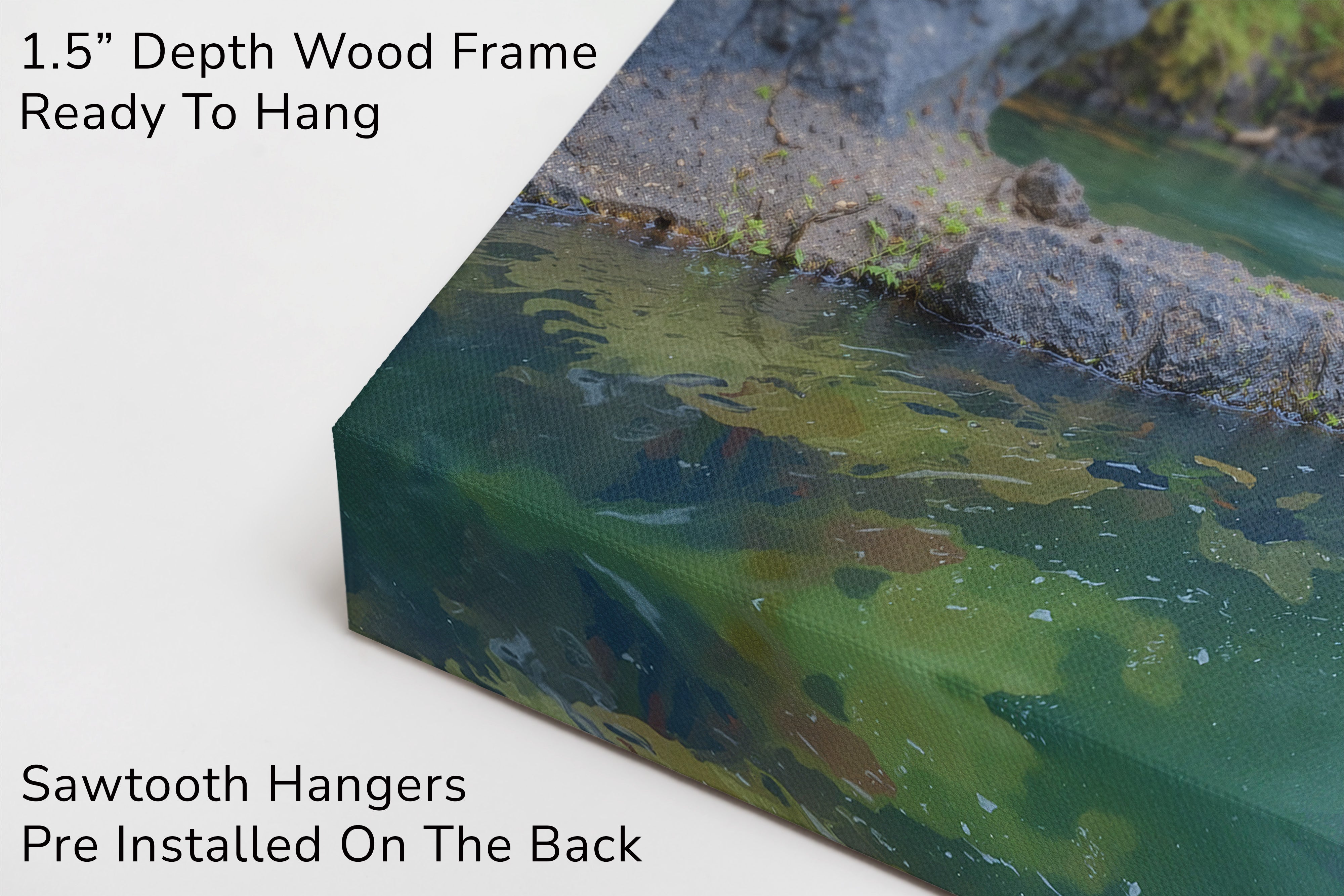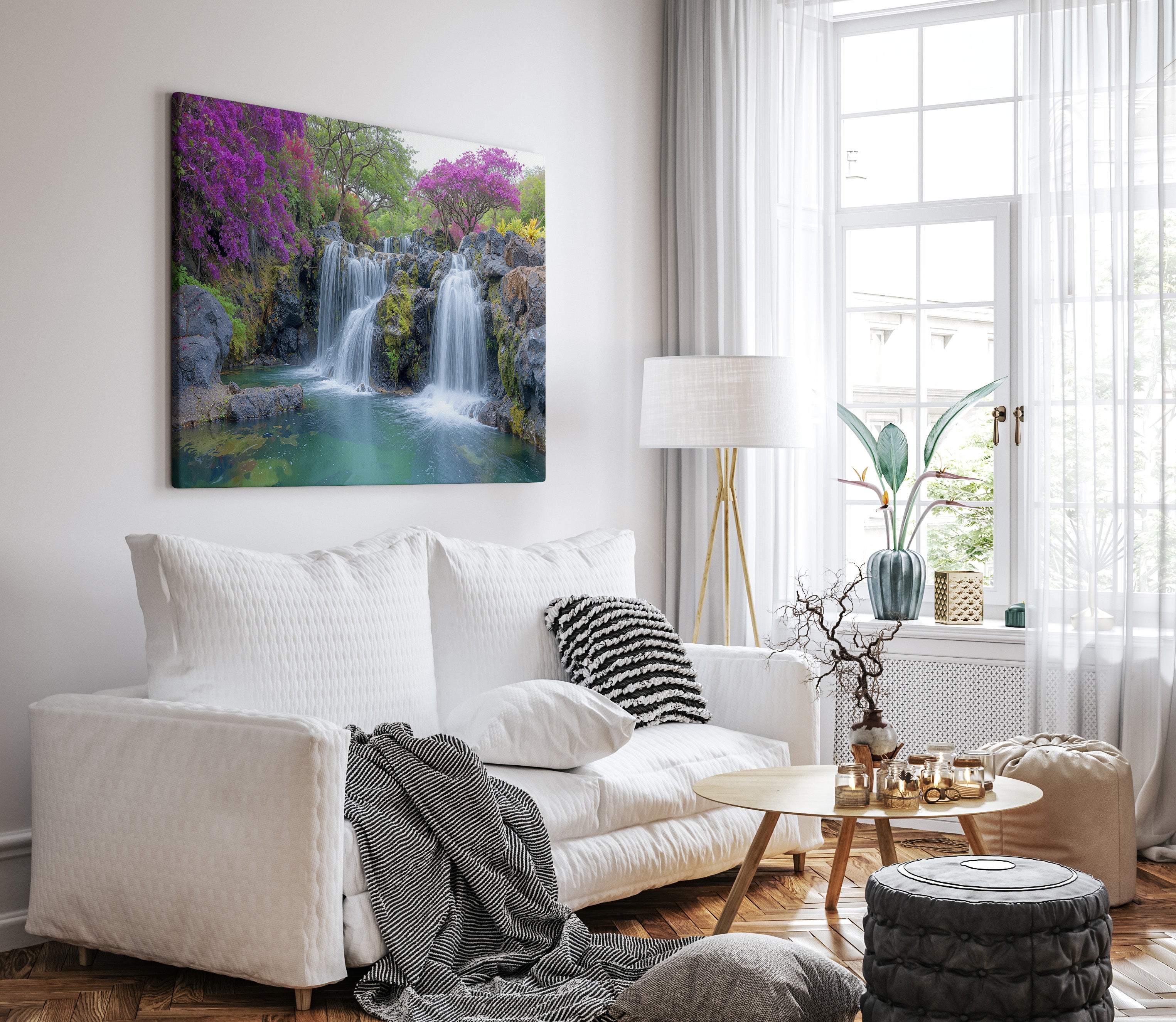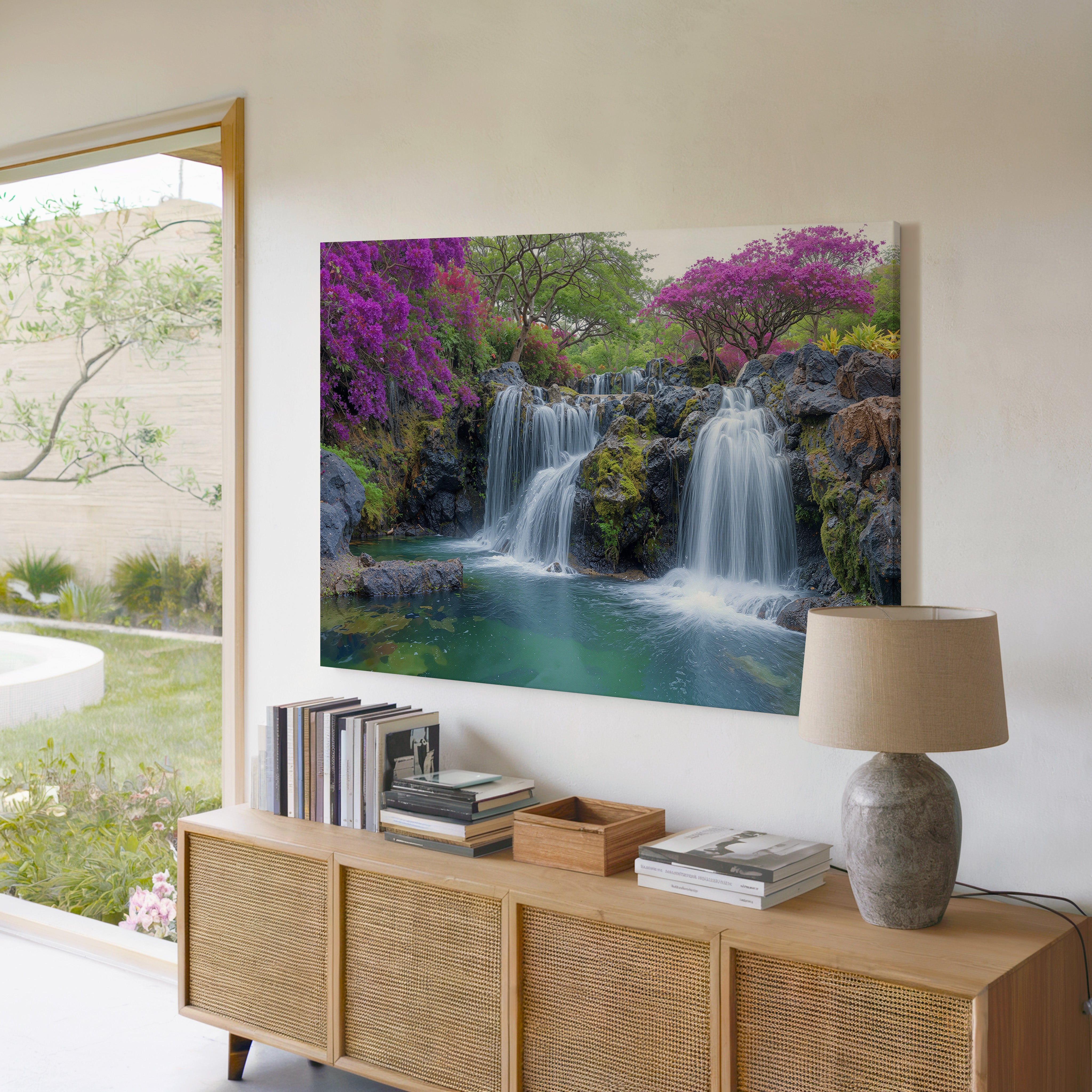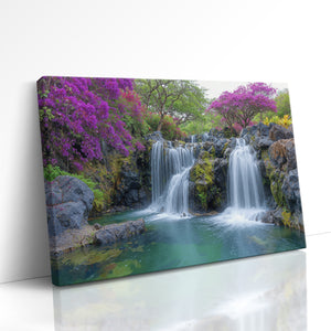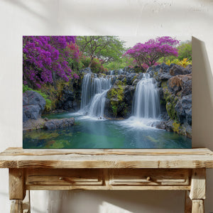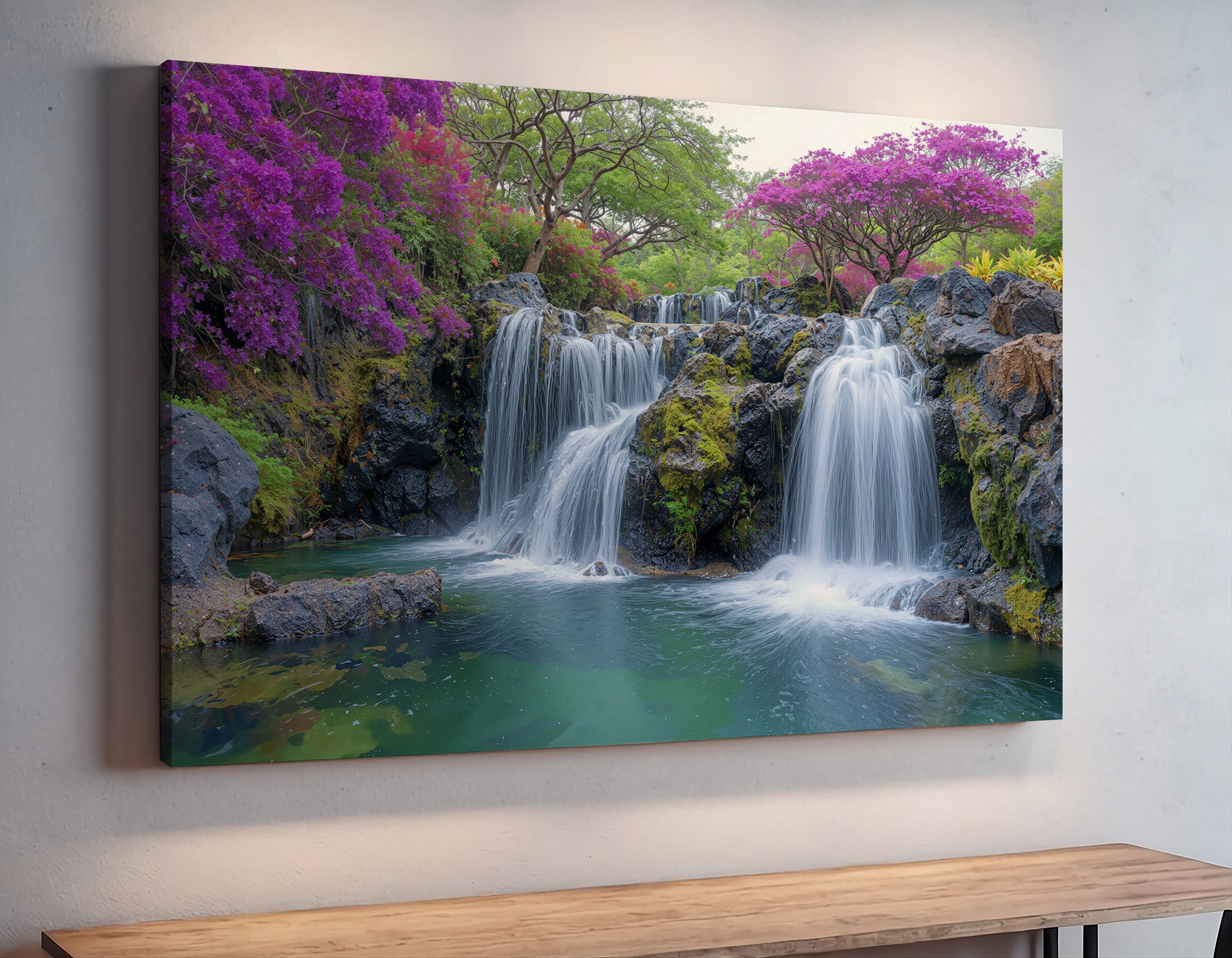 "The Blooming Silence of Spring" captures a peaceful cascade surrounded by vivid blossoms and moss-covered stone. With lavender flowers in full bloom and water gently descending into a tranquil green pool, this piece evokes the serenity and quiet renewal of nature’s most vibrant season. Ideal for bedrooms, bathrooms, garden rooms, or any space in need of a calming natural touch, this gallery wrapped canvas print brings the beauty of spring indoors. A perfect choice for lovers of floral landscapes, waterfall scenes, and botanical wall art.