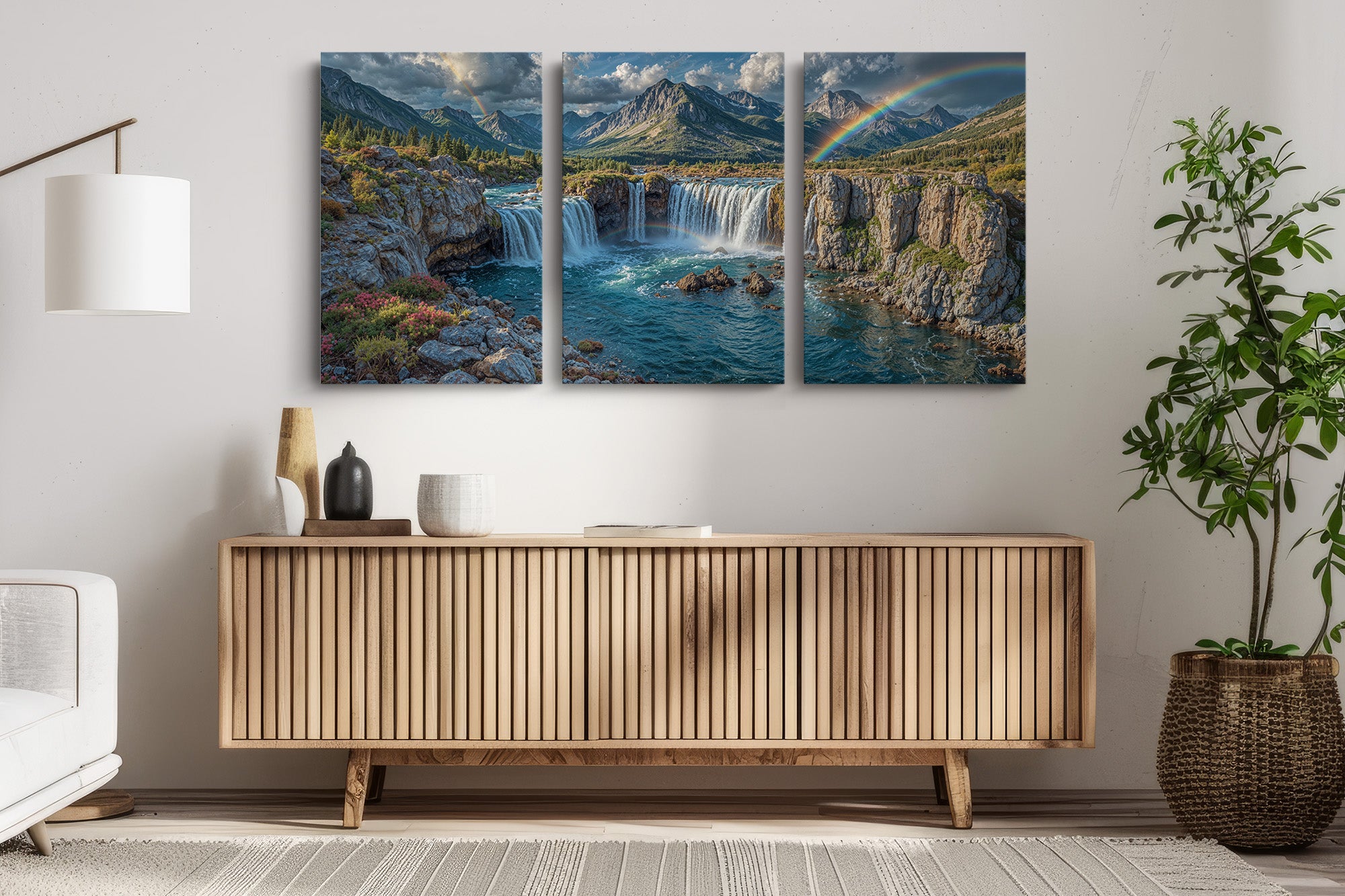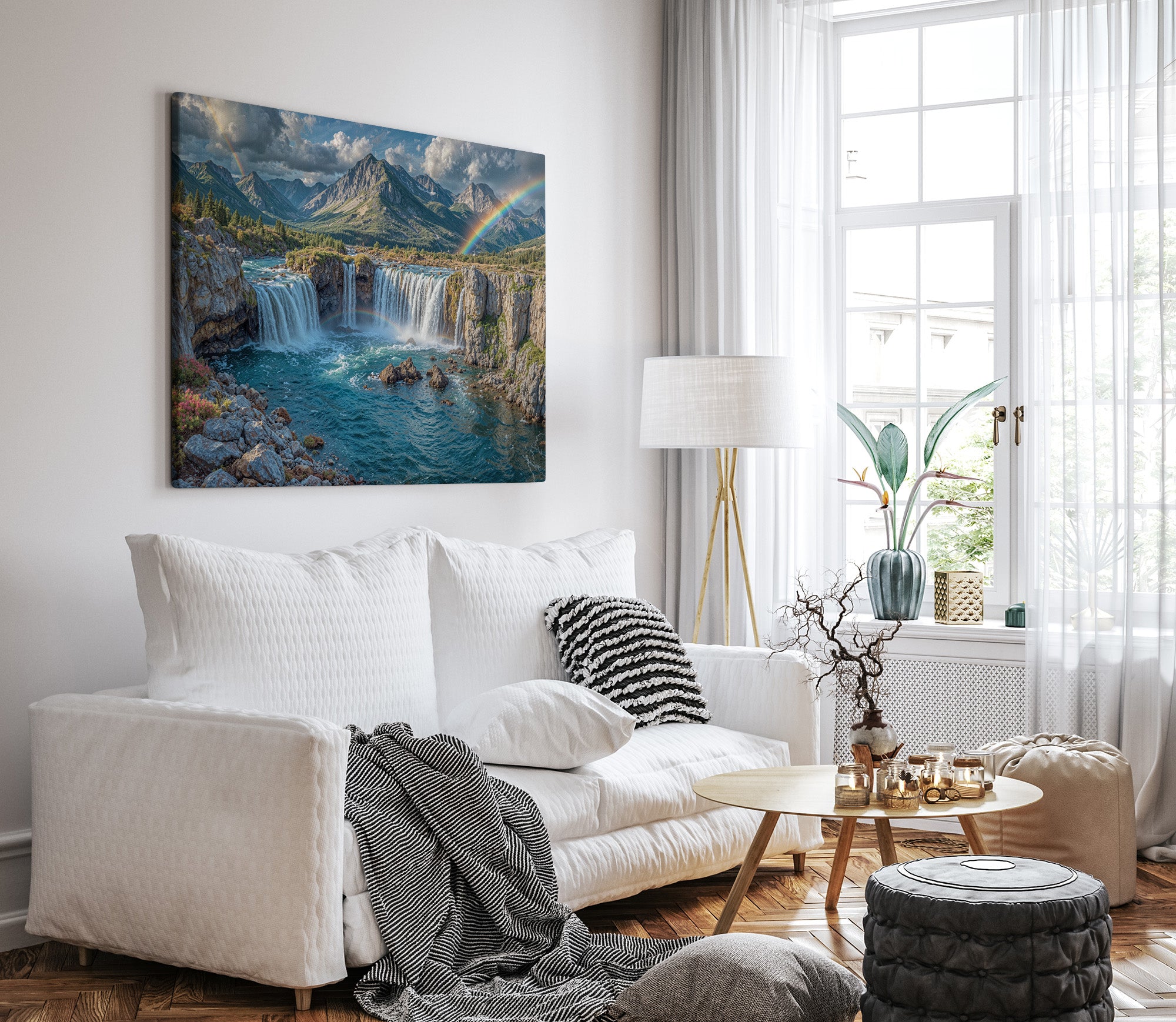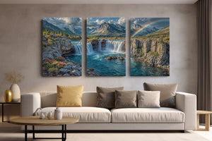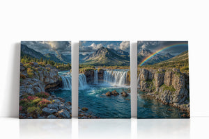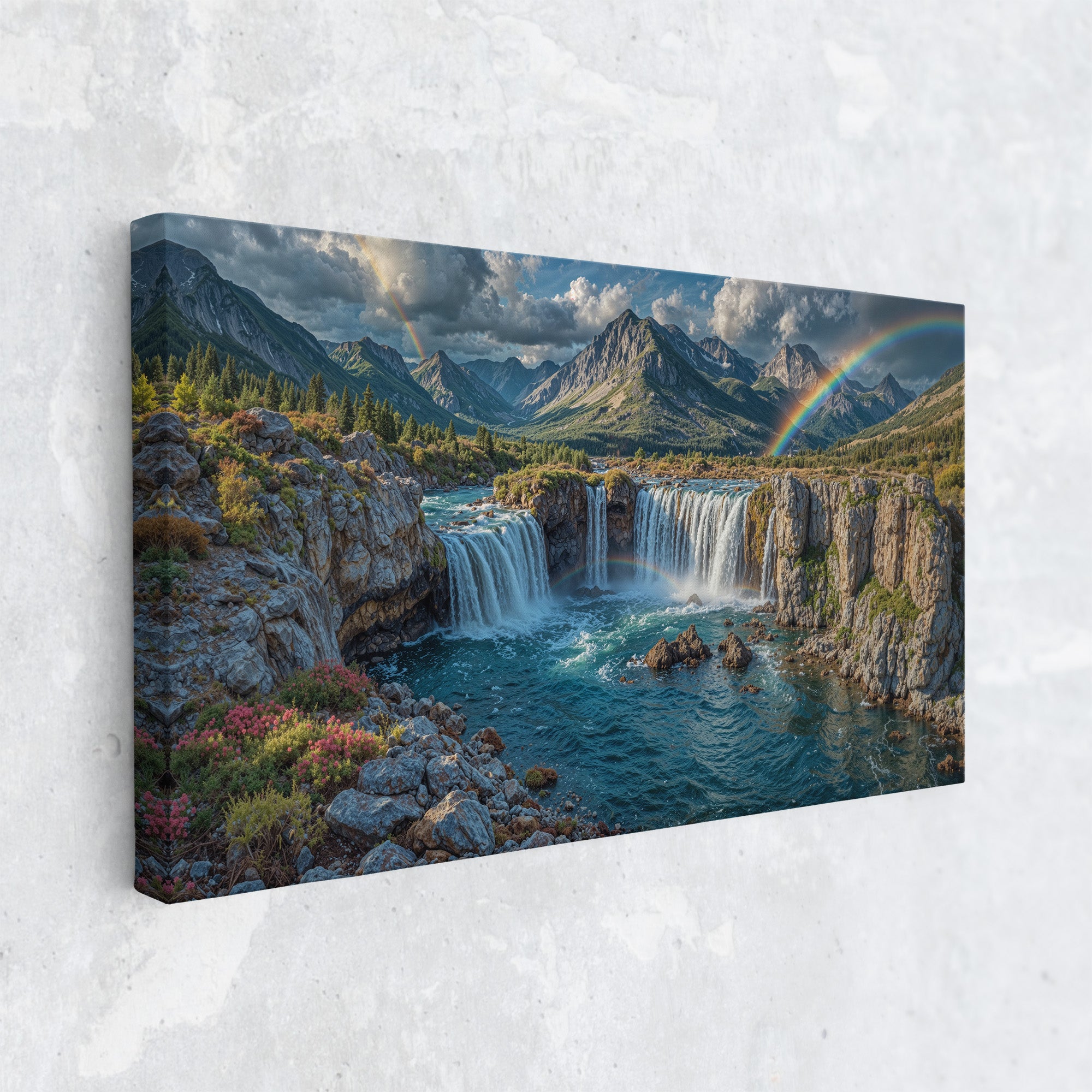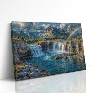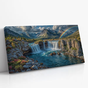 Towering waterfalls plunge from rugged cliffs, framed by blooming alpine flora and distant snow-capped peaks. Two vibrant rainbows arc across the sky — one cascading with the mist, the other bending across the dramatic mountain skyline. This stunning landscape evokes the magic of nature’s most breathtaking displays. Ideal for anyone inspired by wilderness, wonder, and color. This canvas print adds adventure and tranquility to any room.