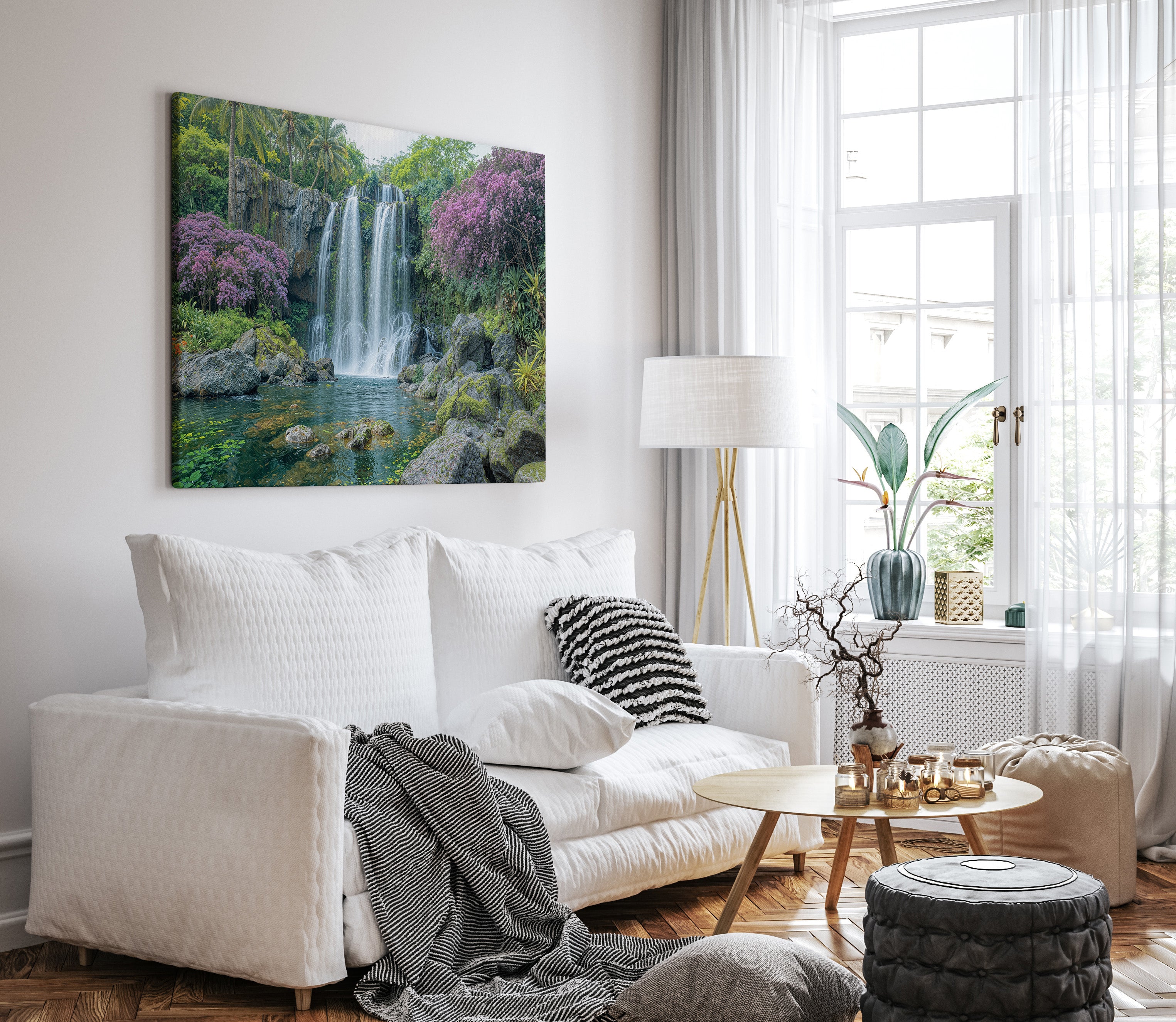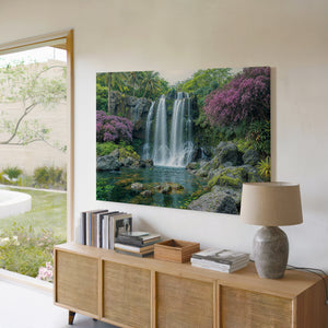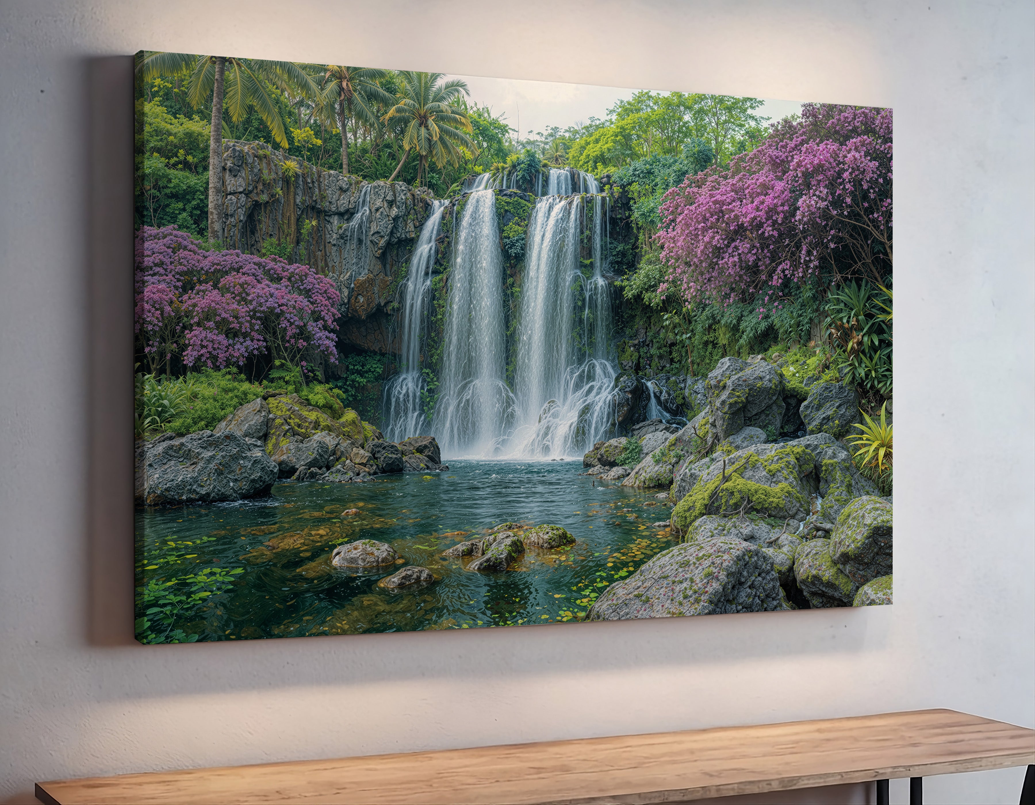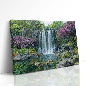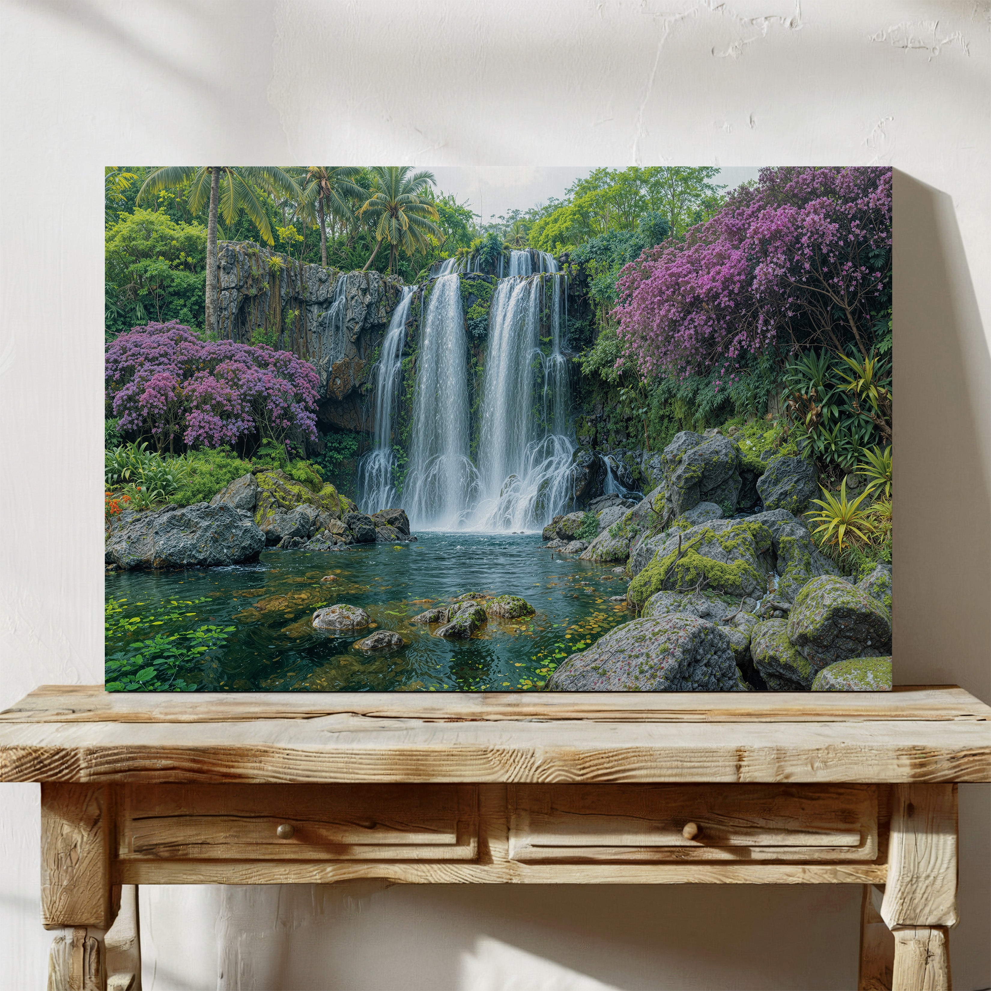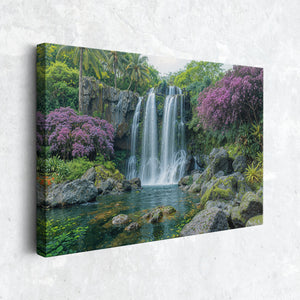 "Tranquil Bloom by Water’s Edge" brings to life a vivid paradise where cascading waterfalls meet lush tropical flora in full bloom. Surrounded by emerald greenery and vibrant purple blossoms, this canvas print is a refreshing burst of serenity for any space. Ideal for bringing nature-inspired beauty to your living room, spa area, or home office, this piece of wall art offers peaceful energy and lush color. A perfect addition to tropical or botanical home decor, or a thoughtful art print gift.