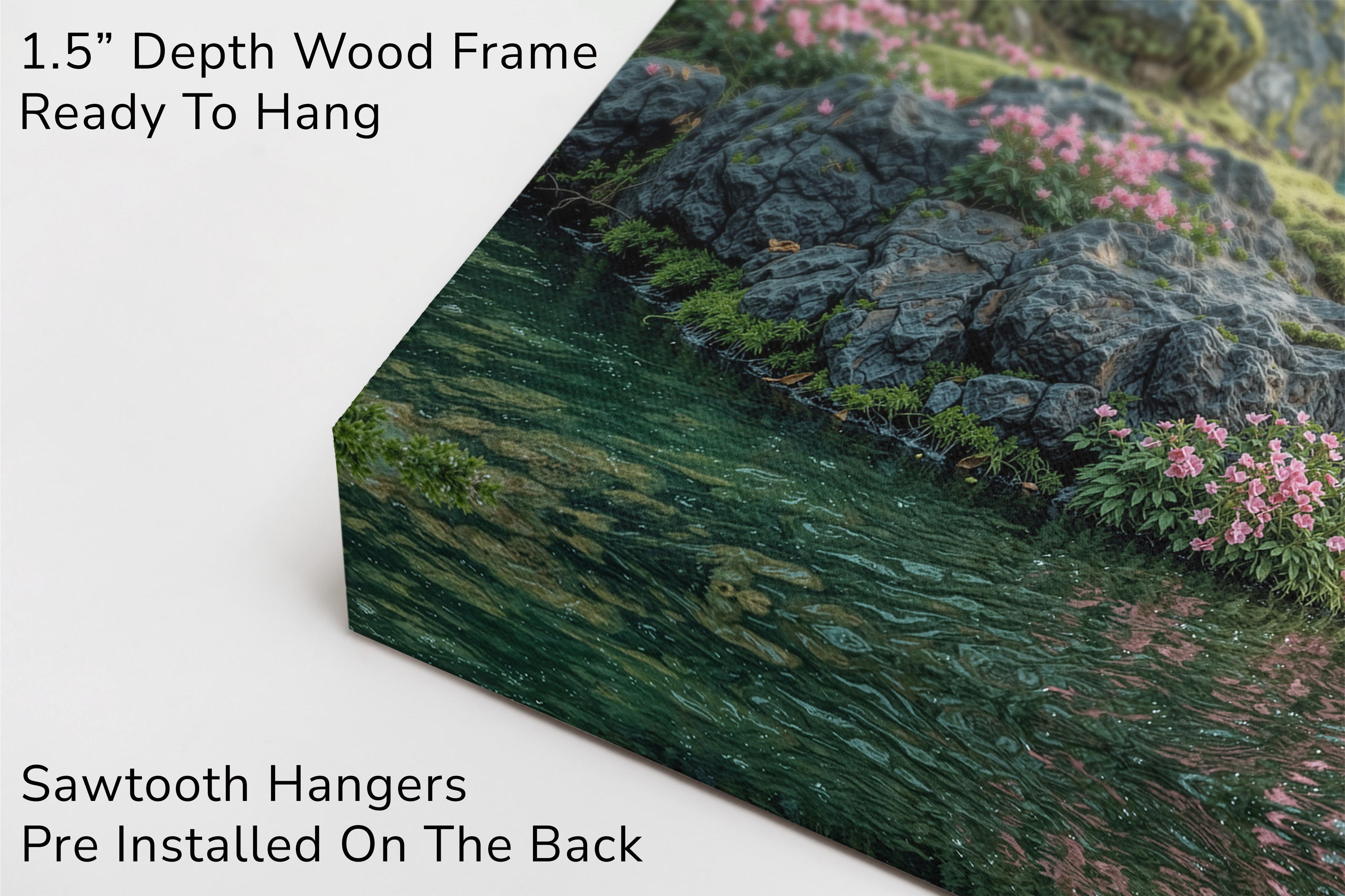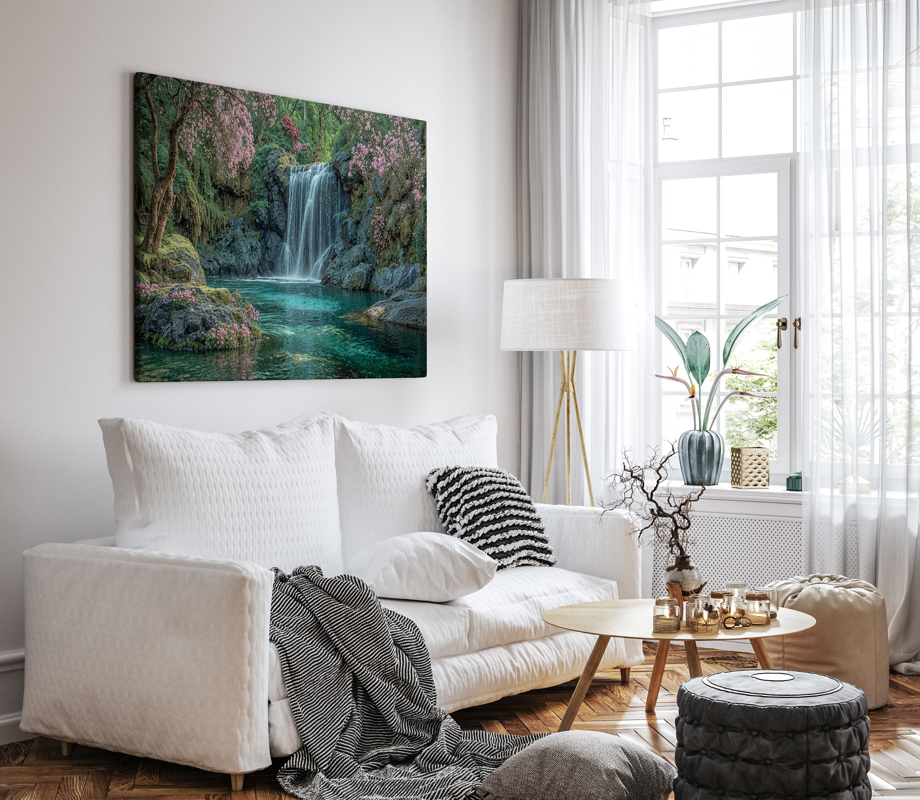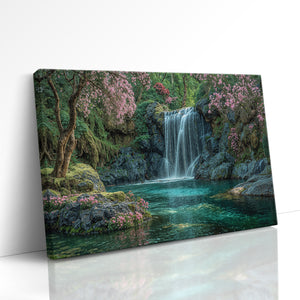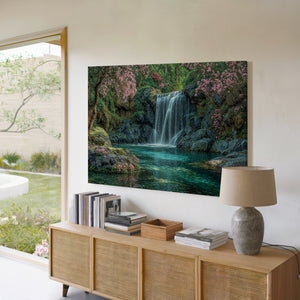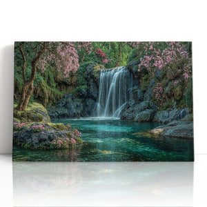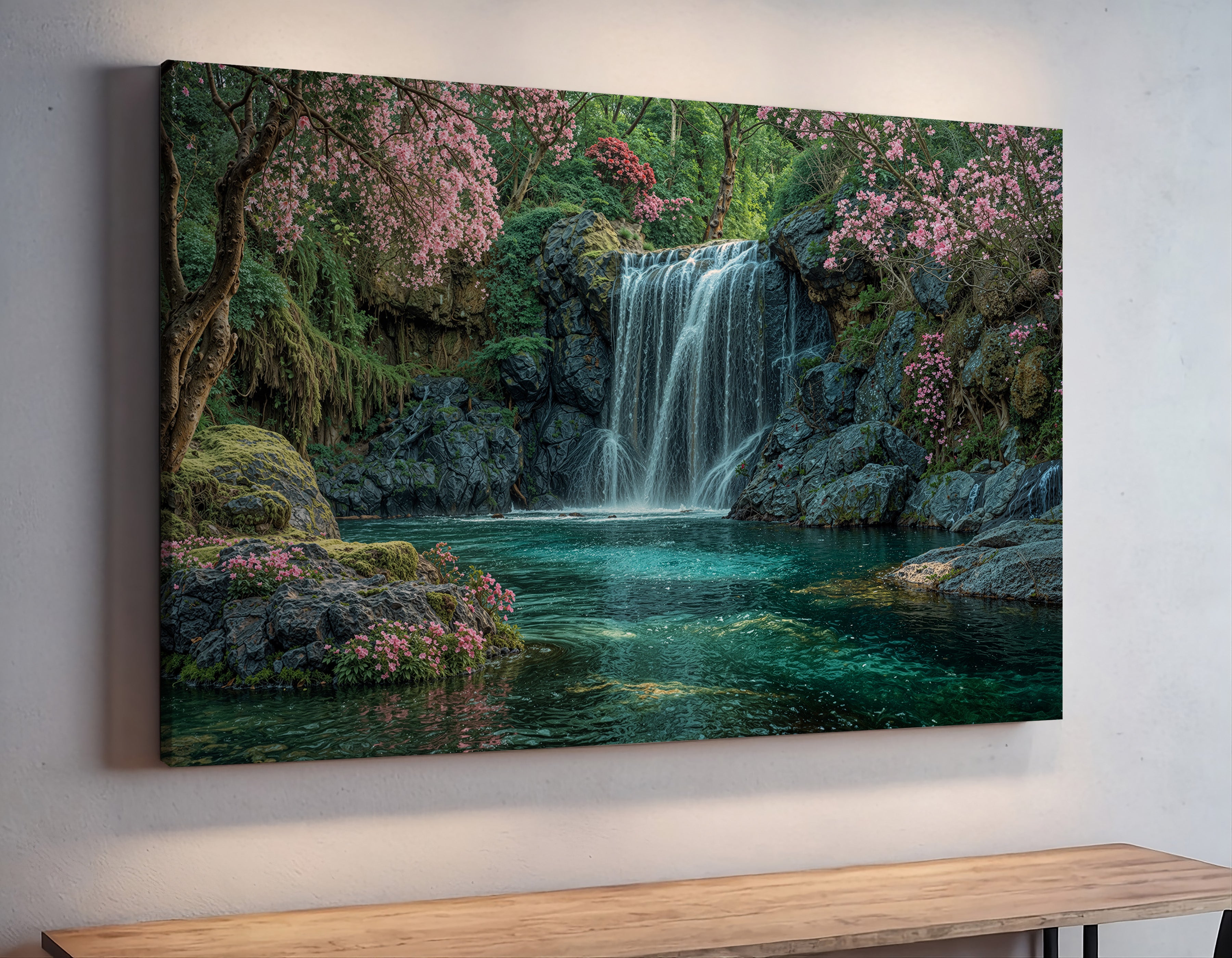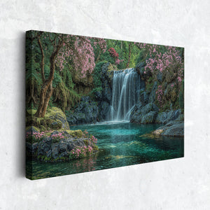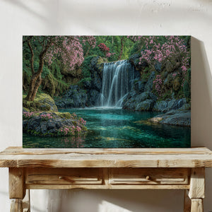 "Whispers Beneath the Sakura Veil" is a breathtaking celebration of spring's renewal, capturing a serene waterfall nestled in a lush forest blooming with delicate cherry blossoms. The turquoise pool shimmers beneath cascades of water and petals, creating a tranquil escape from the everyday. This gallery wrapped canvas print brings a sense of calm and romance into any space. Ideal for bedrooms, meditation rooms, or elegant home decor, it is a perfect art print for those who appreciate nature's fleeting beauty and peaceful ambiance.
