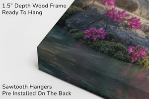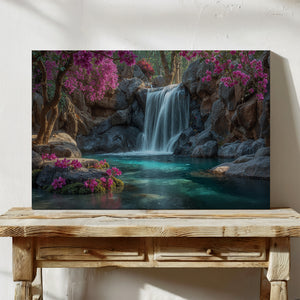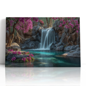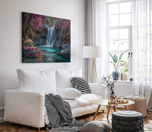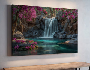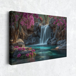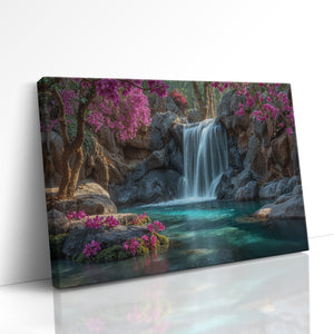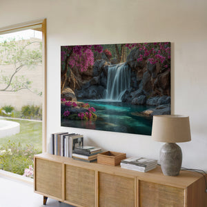 "Whispers from the Petaled Spring" captures the quiet magic of a serene waterfall cascading into a jewel-toned pool, framed by delicate pink blossoms and sun-kissed stones. This enchanting springtime scene evokes peace, renewal, and the gentle rhythm of flowing water. Printed on high-quality canvas, this piece brings a breath of floral elegance to your home decor. Perfect for bedrooms, reading nooks, or tranquil spaces, this wall art transforms your room into a lush, blooming retreat.