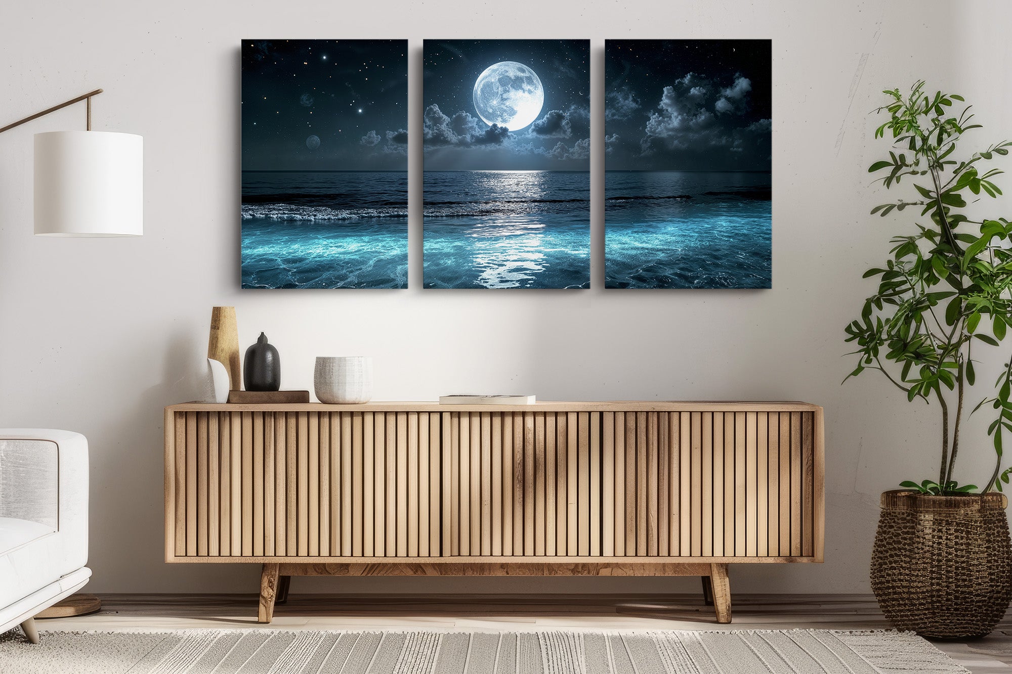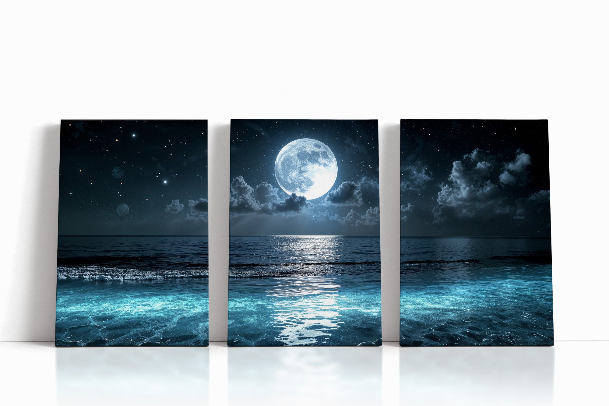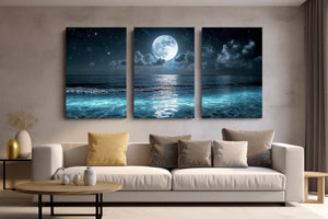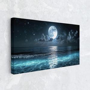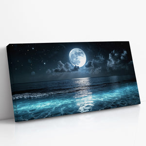 A luminous full moon hangs above the ocean, casting silver light across glowing waves and drifting clouds. Stars shimmer in the night sky, and the stillness of the water gives the scene a quiet, meditative beauty. This moonlit seascape canvas print is perfect for lovers of night, water, and celestial calm. Whether you're decorating a coastal retreat or simply seeking a sense of serenity, this piece brings ethereal atmosphere and dreamy tranquility to your space.